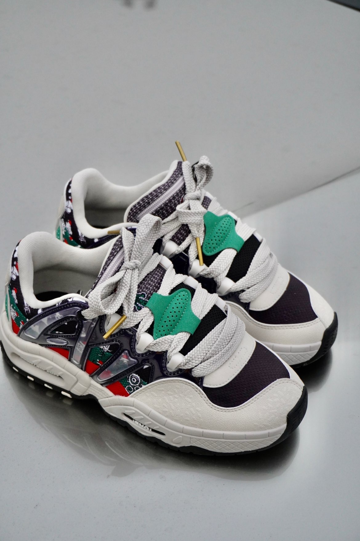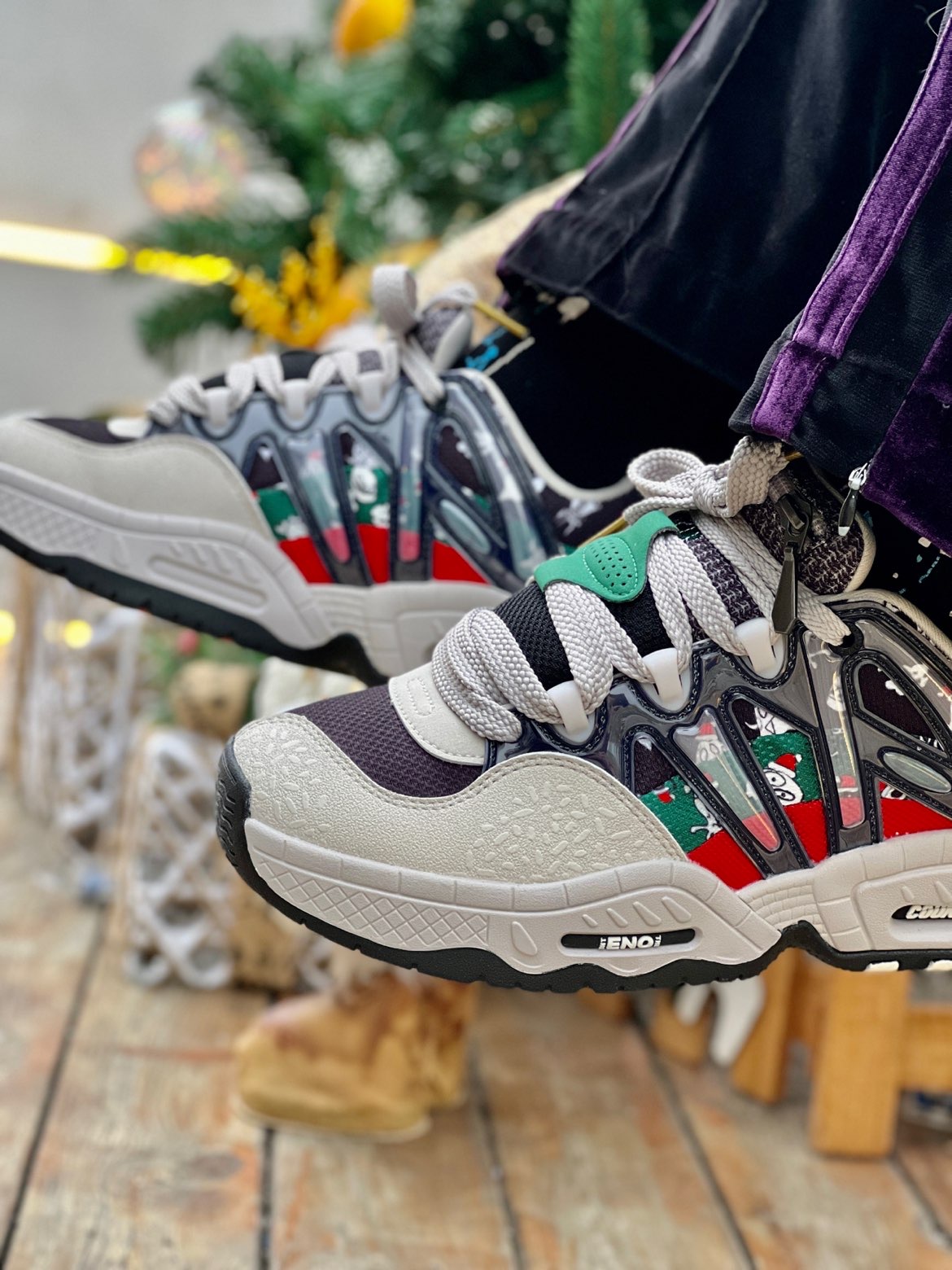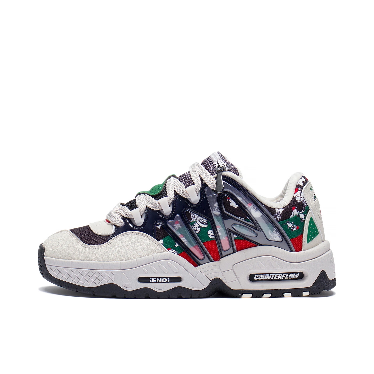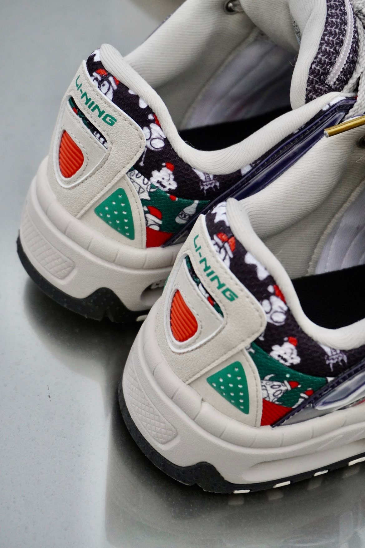 LiNing李宁CF溯系列 🌟满满的圣诞气息扑面而来,红绿色的撞色设计让视觉冲击力格外强大,雪人⛄️瓶子🫙圣诞帽各种元素的插画设计也让整体的圣诞氛围更加浓厚,在圣诞节穿上想想都很幸福。 🌟鞋型设计复古韵味十足,微翘式的鞋头设计,让整体看起来更具气场。鞋舌非常细节,采用拉链口袋的设计,小小的细节,大大的心意,用来藏圣诞礼物也无不可。整体多材质拼接,简约的同时又不乏层次感。鞋底采用耐磨材质,不易打滑,...