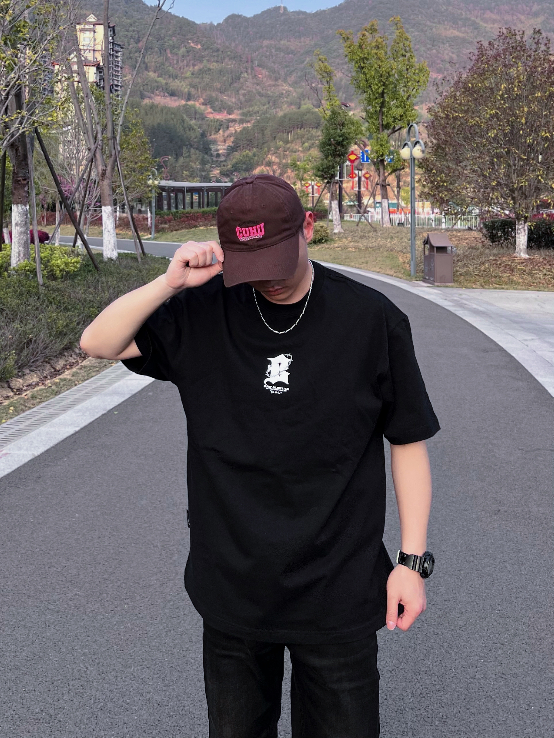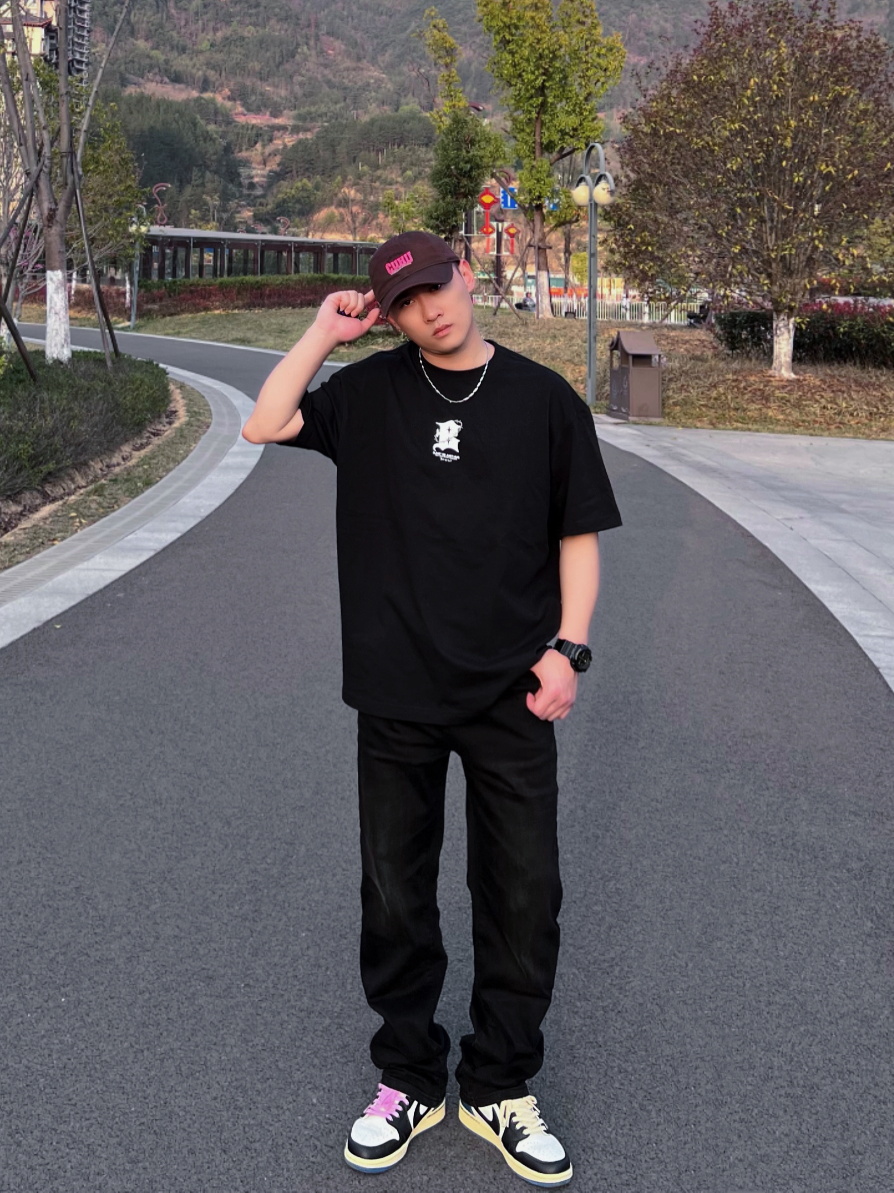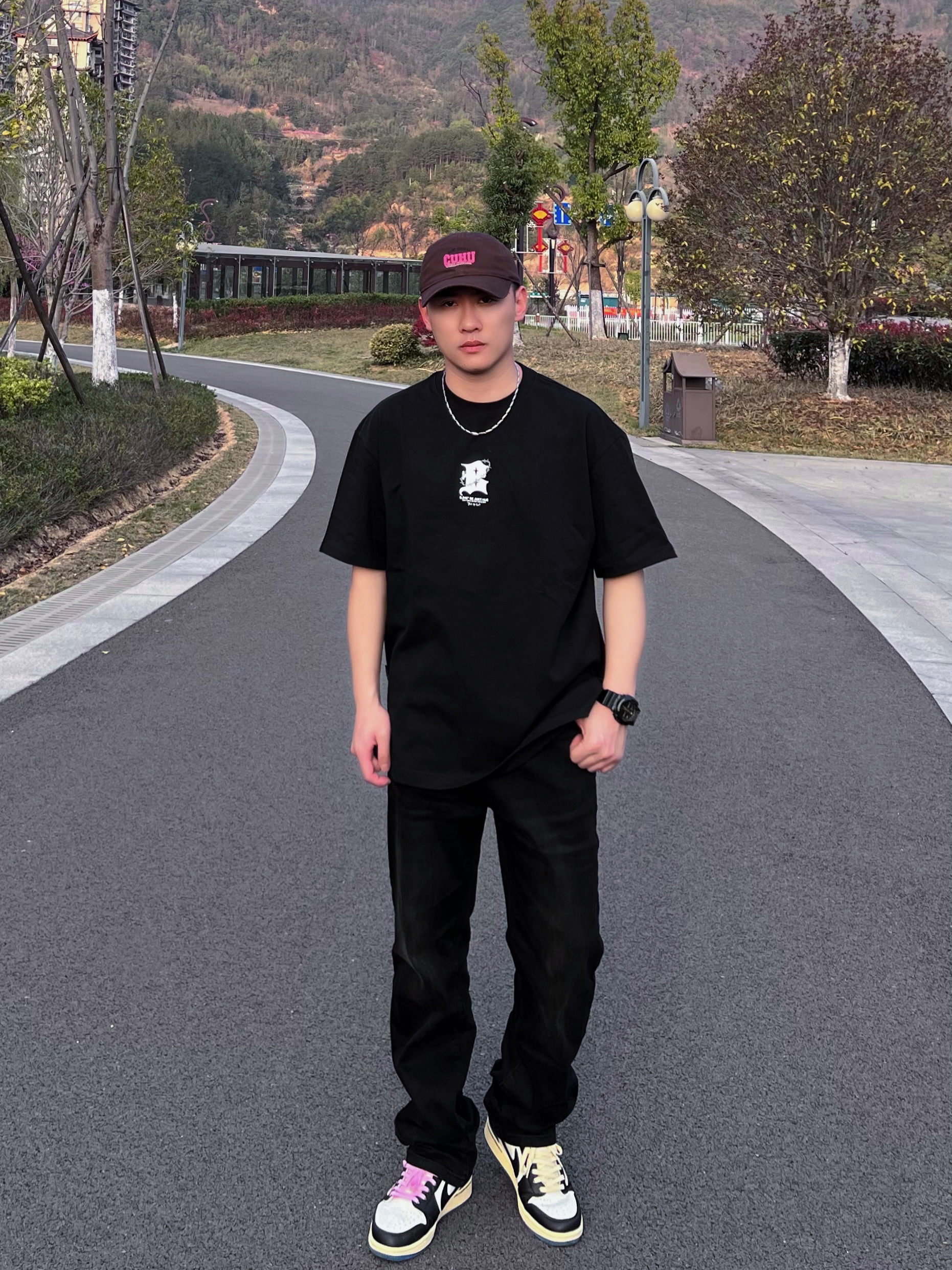 哈喽,兄弟们黑色系有时候很酷,今天带来的是高街风格的穿搭分享,一起康康👀吧! 😎搭配颜色/单品:黑色短袖/黑色牛仔/板鞋/简单项链一条/帽子🧢,这套一眼看去就是高街风格。 😎特点:短袖版型属于宽松的,这种重磅材质的短袖会显肩宽头小,裤子显瘦。 👔: BJHG 😎参考尺码:173/66kg L 😎风格建议:高街/休闲/黑色系