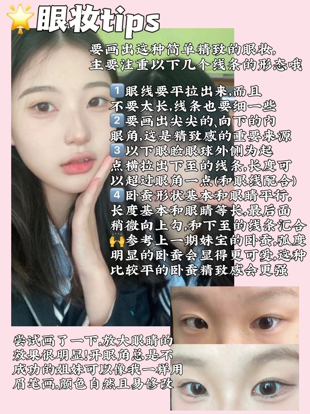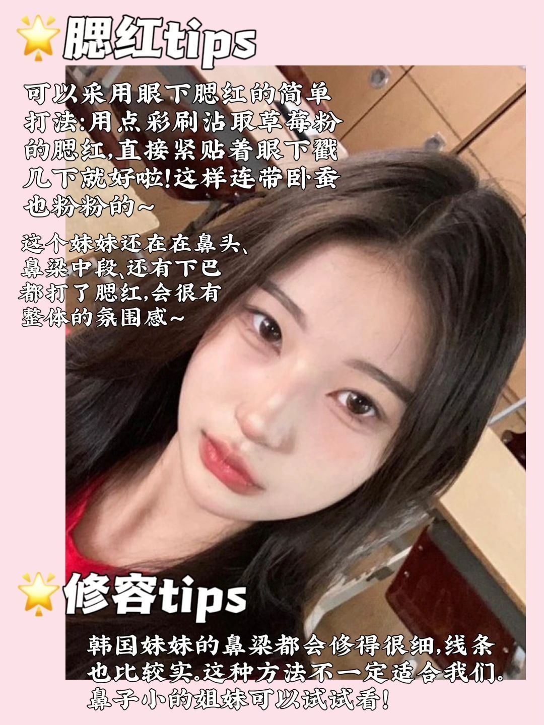 前一阵子这个韩国妹妹的妆容真的好火!但是很抱歉我忙于写论文没来得及更新🥹总结了几条值得学习的妆容tips,希望能给姐妹们提供参考~ 以下是省流文字版总结: 1⃣️眼妆是用偏细的线条组合建构出精致感:平拉且短而细的眼线;尖尖下勾的内眼角;眼球外侧为起点平拉出去,显眼的眼睑下至;形状较平、长度较长的卧蚕。 2⃣️氛围感腮红:眼下腮红带到卧蚕,鼻头、鼻梁中段、下巴也打上腮红,整体塑造氛围感。 3⃣️比较...