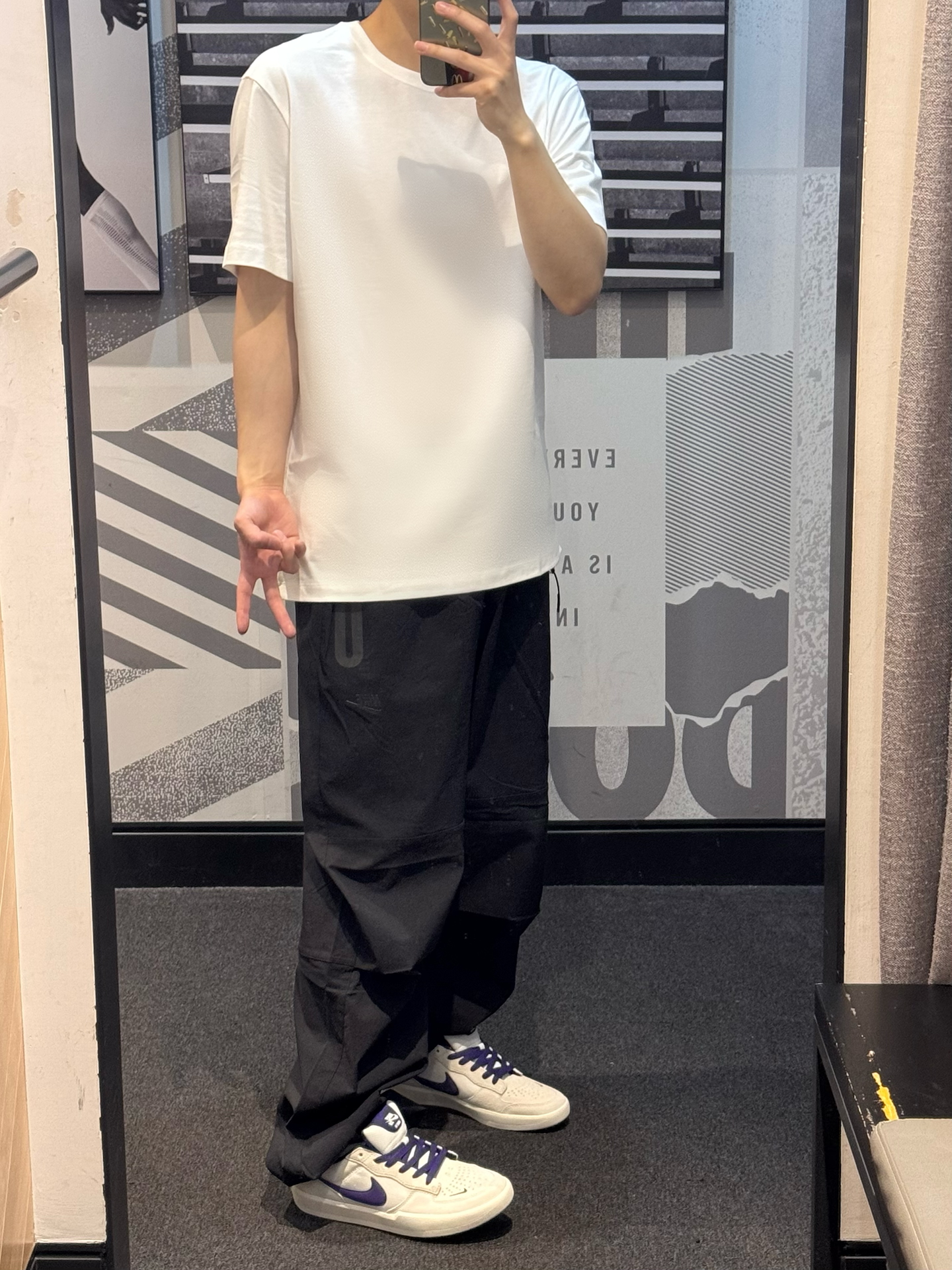 ☀️夏天要的就是清爽干净 纯白T恤有配饰点准看着也不会很单调🍃 ➕而且表面的印花还是压印的 就很细节👀 裤子灰白款但是偏白😆 特别是夏天、直筒款的穿着很舒服✌🏻