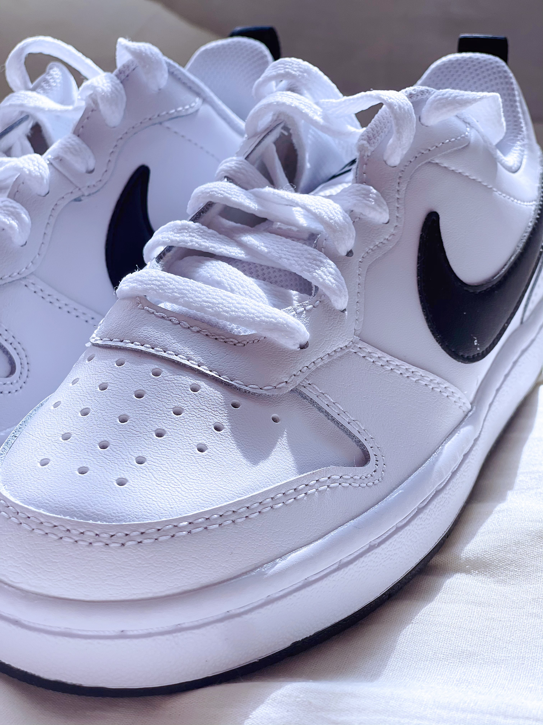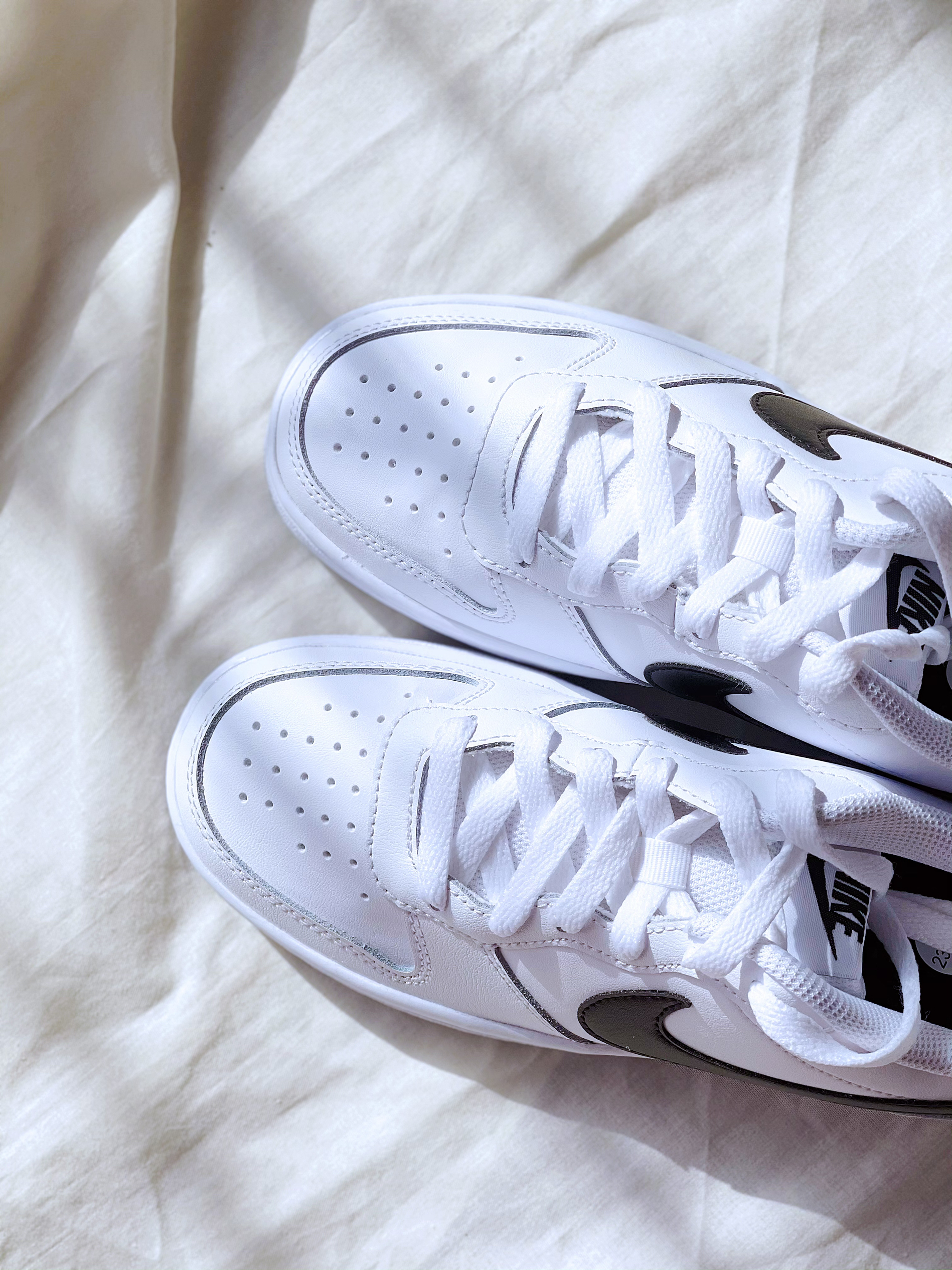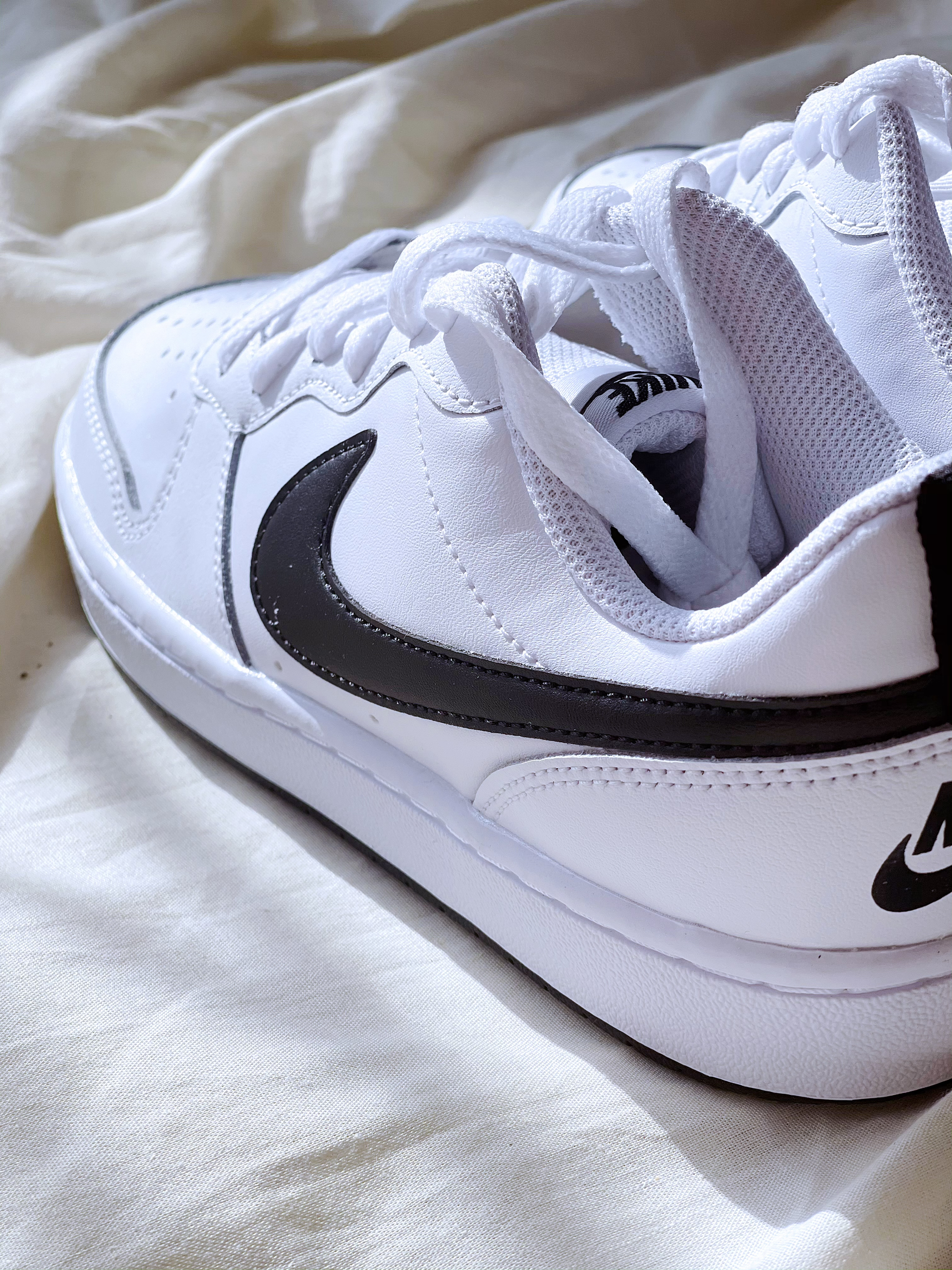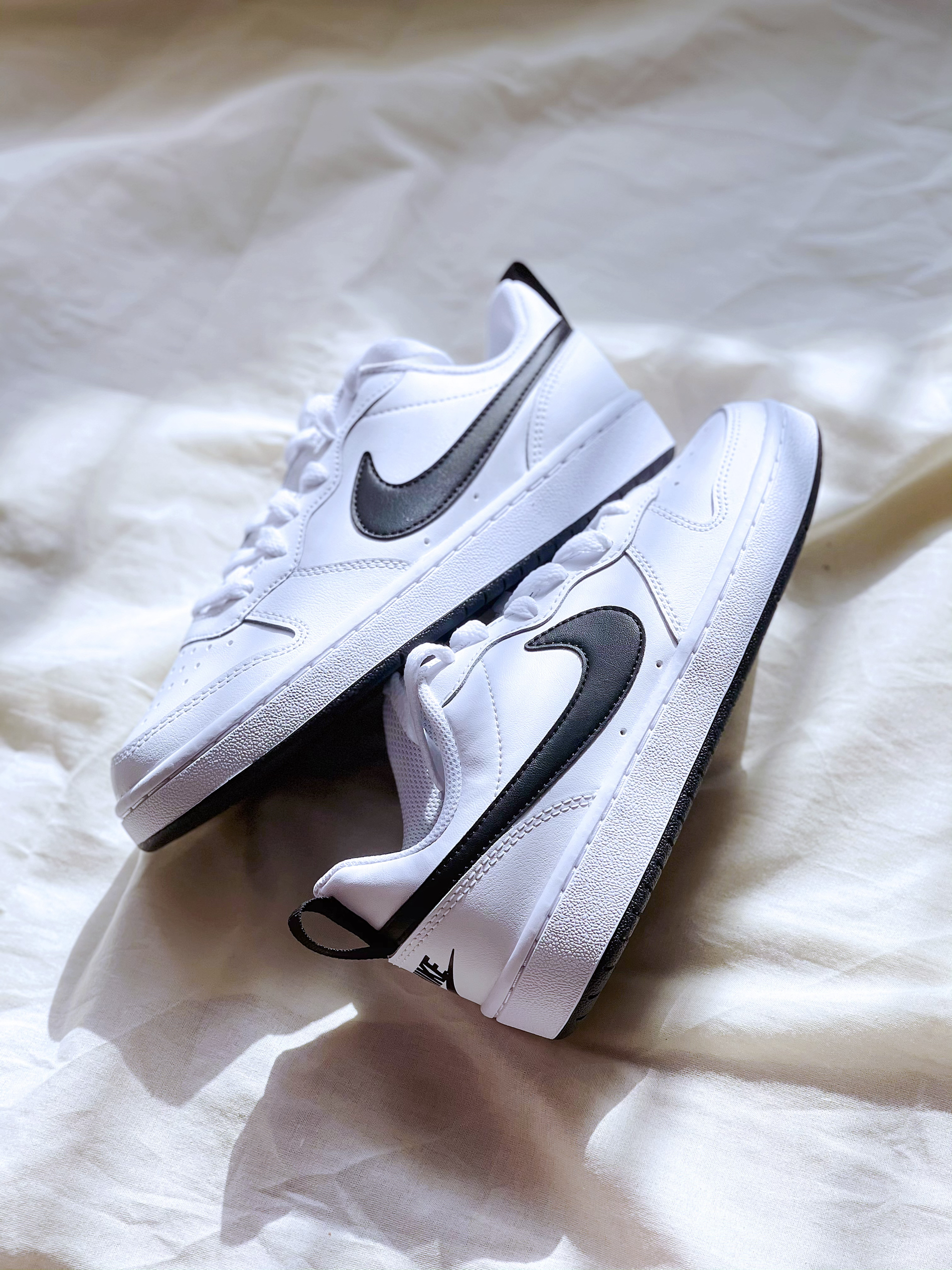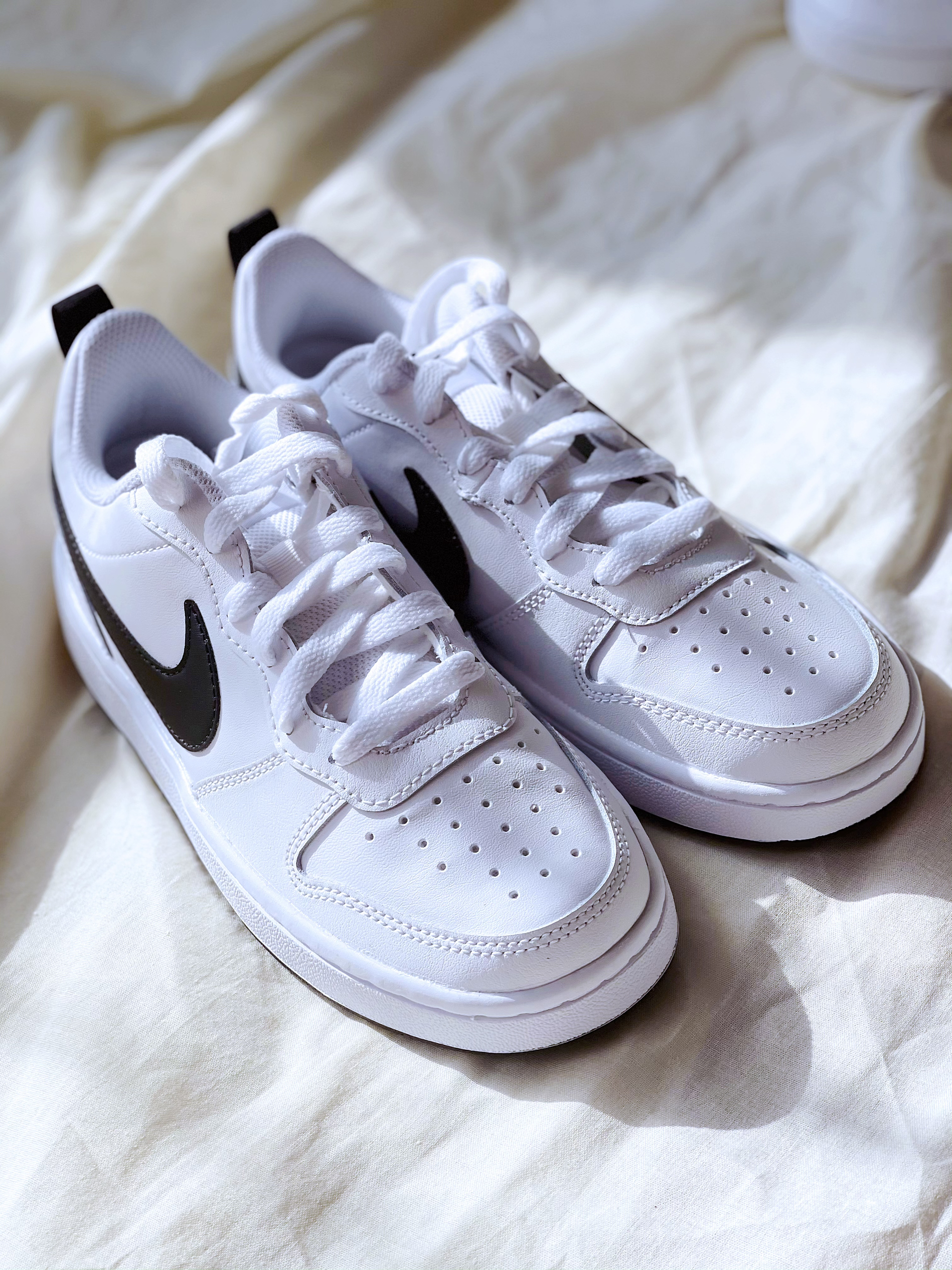 Court Borouth low 白黑色 百搭小白鞋,鞋型比AF1相似,但是更加秀气,也可以说是Dunk的平替。 这双白黑色,鞋面用了白色大面积皮质,黑色的SWOOSH,整个这个鞋子看着清新,很校园。 价格300+,搭配各种色系各种类型的裤子都好搭,喜欢的赶紧入手吧。