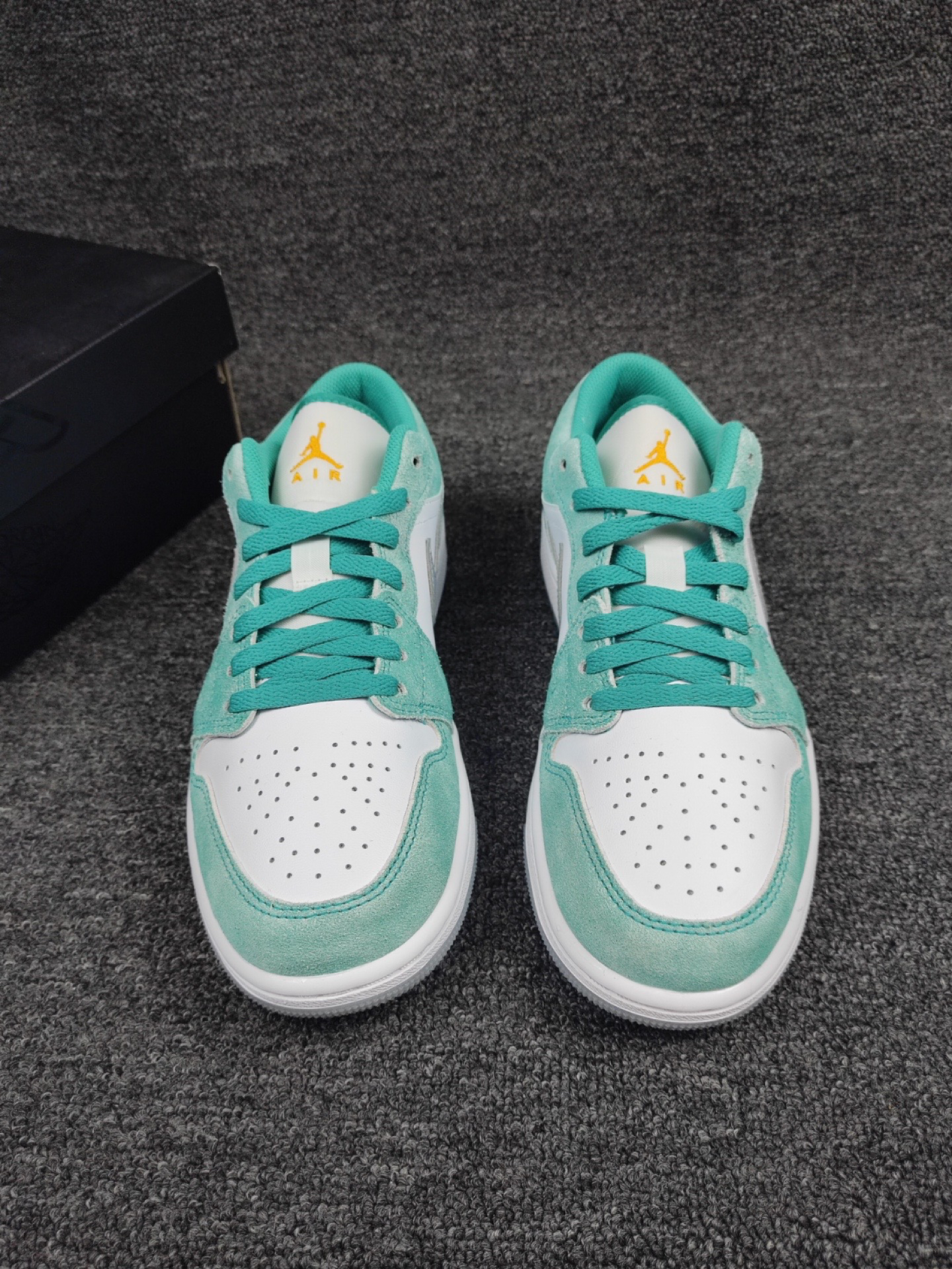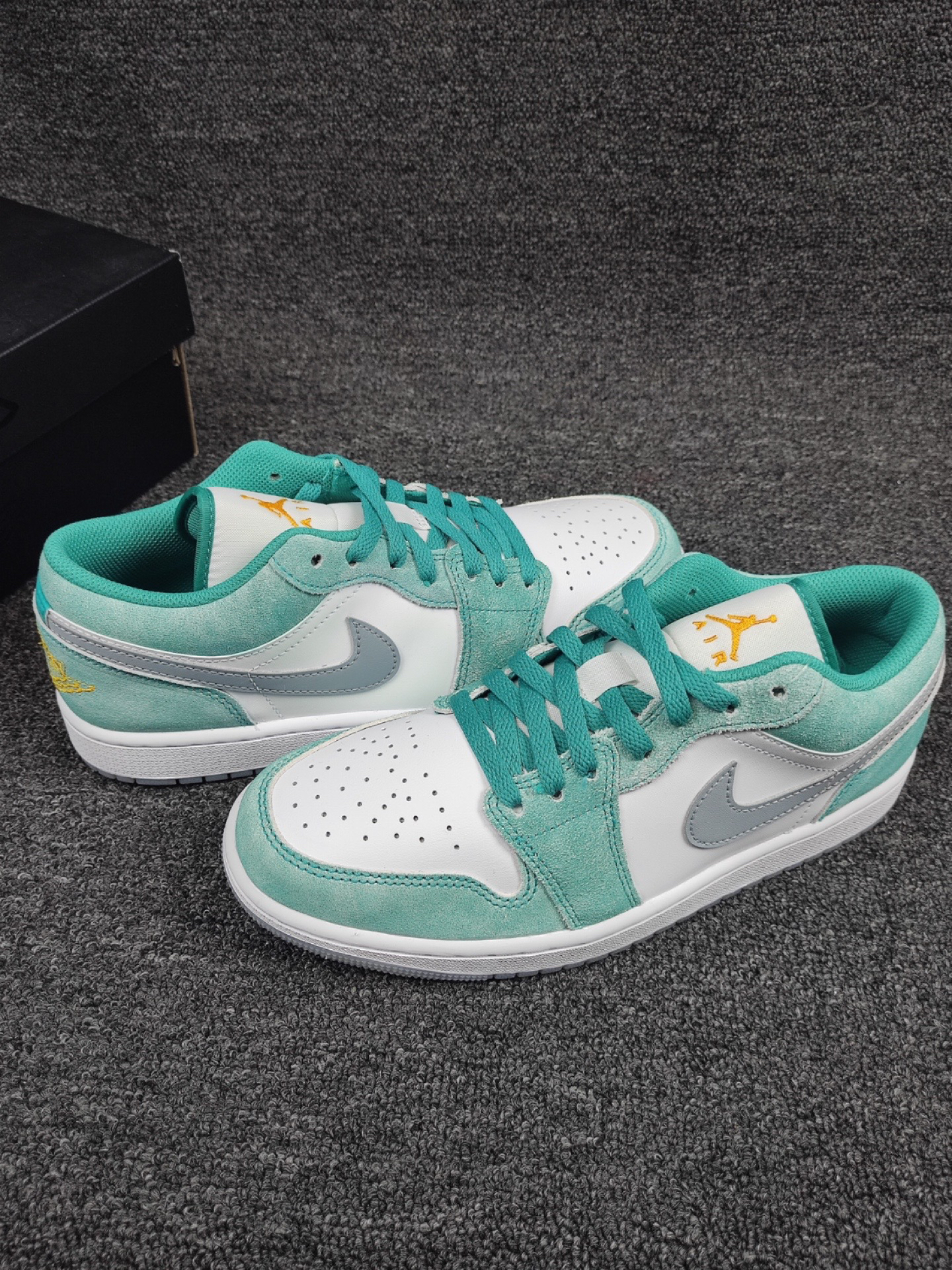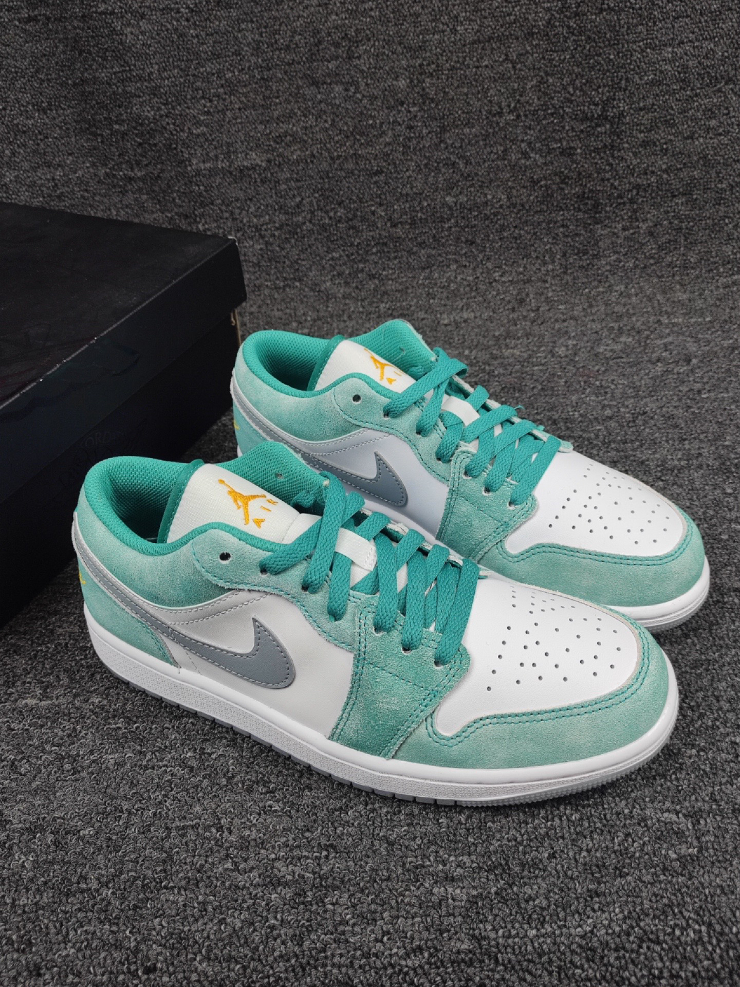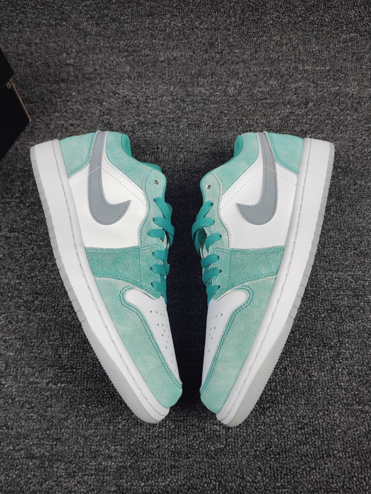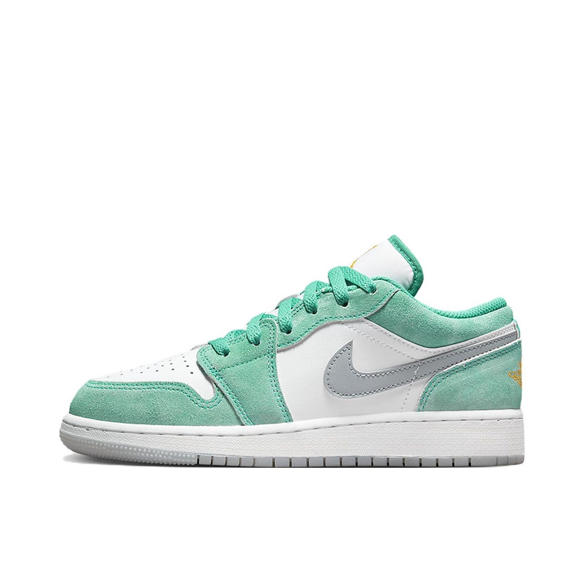 这双水洗白绿AJ1 Low,颜值也太赞了吧! 祖母绿绿搭配白色打造,细节处点缀黄色, 水洗质感的麂皮搭配皮革材质,质感出色, 绝对是春夏一定要入手的小绿鞋。