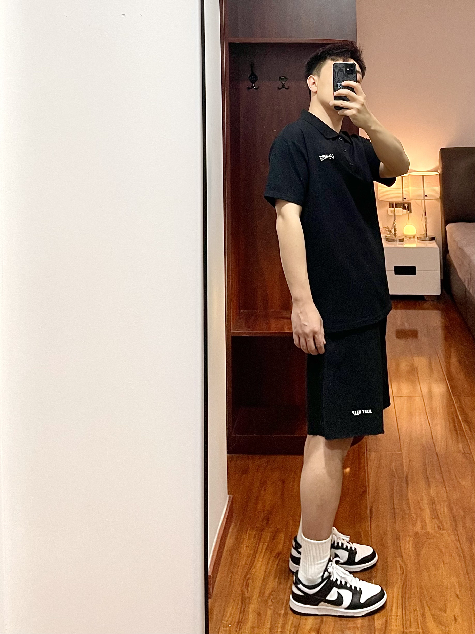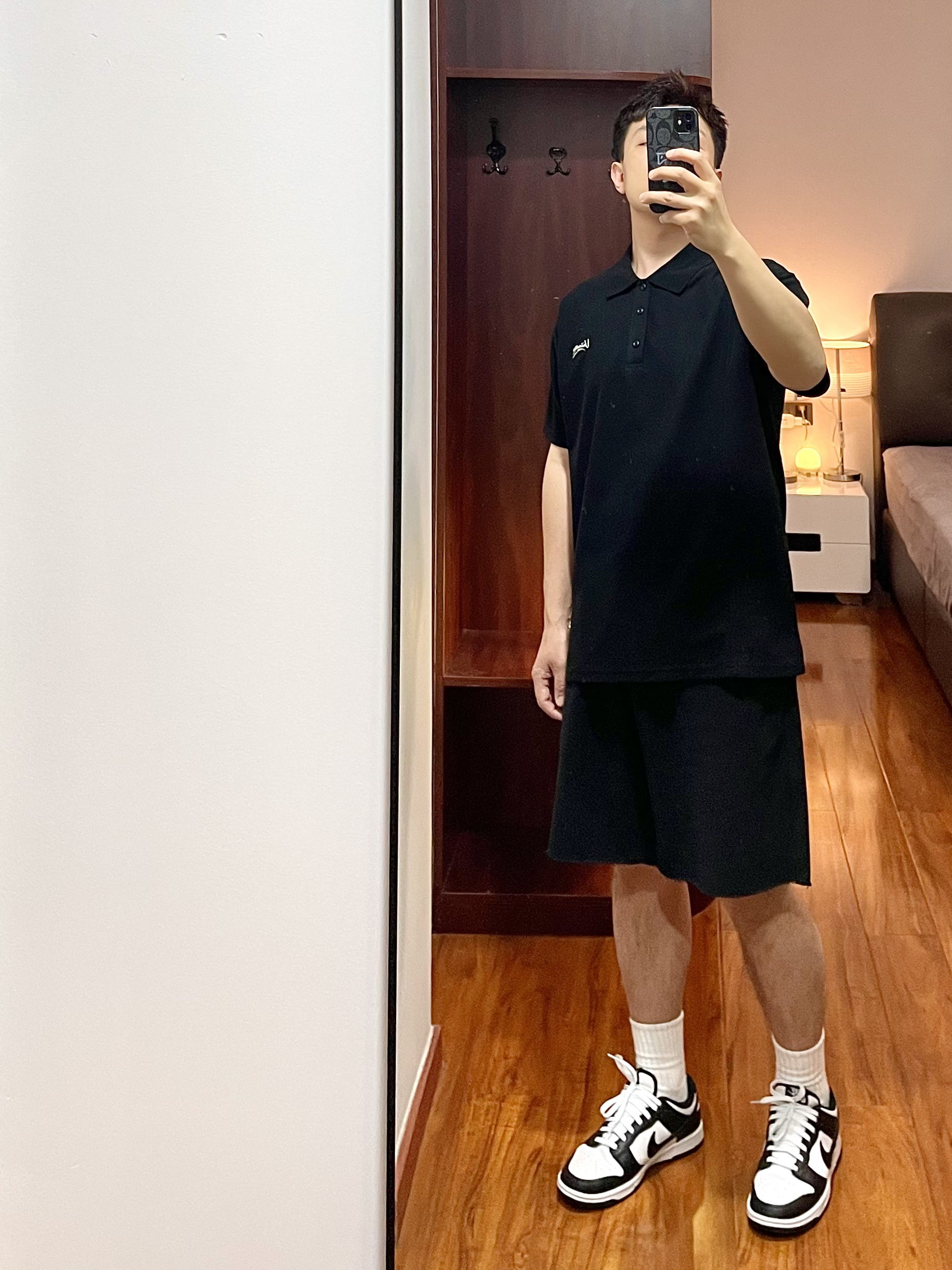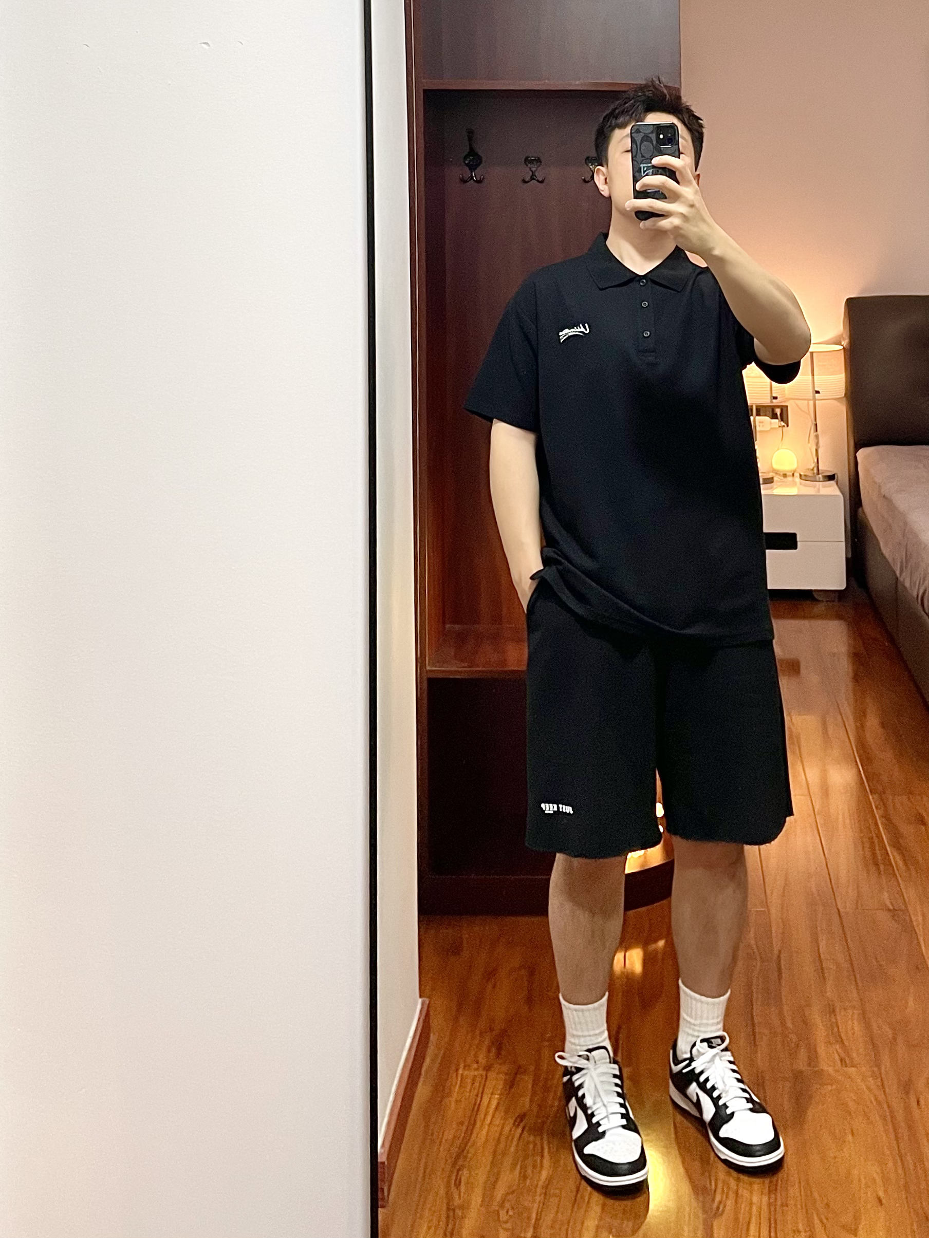 170cm/67kg 一个普通人的穿搭分享 👕:鹿家门 Polo衫 L码 黑色的Polo衫,版型合适宽松,衣服的设计在正面有切割线整体版型立体。 👖:鹿家门 短裤 L码 黑色休闲风的短裤,日常出门健身运动穿都合适,裤脚边做了磨毛破坏处理整个裤子更有特色。 👟:Nike dunk 日常穿着的黑白熊猫,换了白色鞋带。
