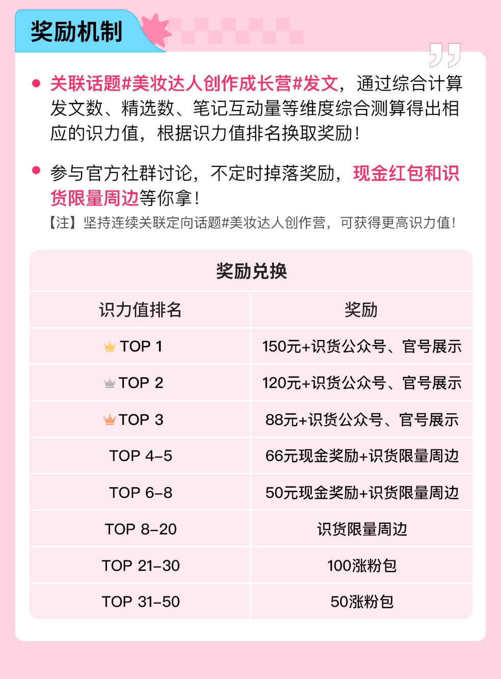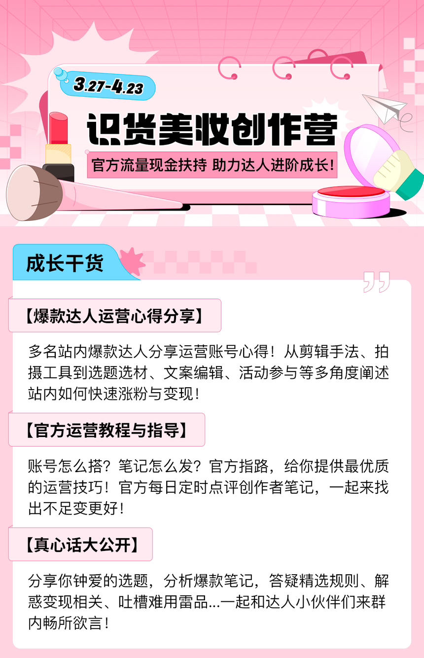 官方流量现金扶持,助力学生党达人进阶为识货美妆头部达人! 🌟<成长干货>🌟 1)活动一【爆款达人运营心得分享】 多名站内爆款达人分享运营账号心得!从剪辑手法、拍摄工具到选题选材、文案编辑、活动参与等多角度阐述站内如何快速涨粉与变现! 2)活动二【官方运营教程与指导】 账号怎么搭?笔记怎么发?官方指路,给你提供最优质的运营技巧!官方每日定时点评创作者笔记,一起来找出不足变更好! 3)活动三【真心话...