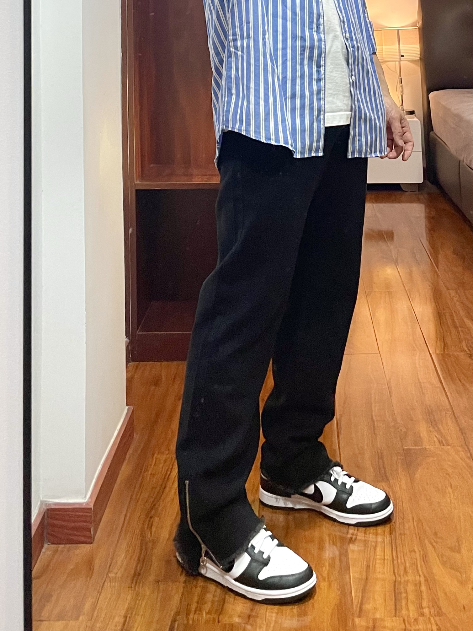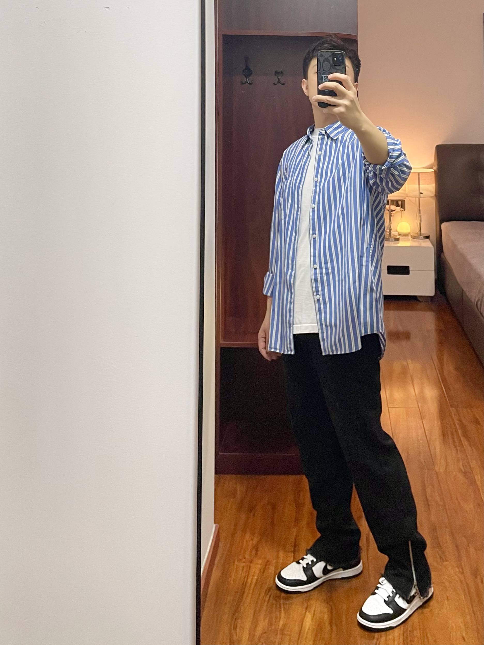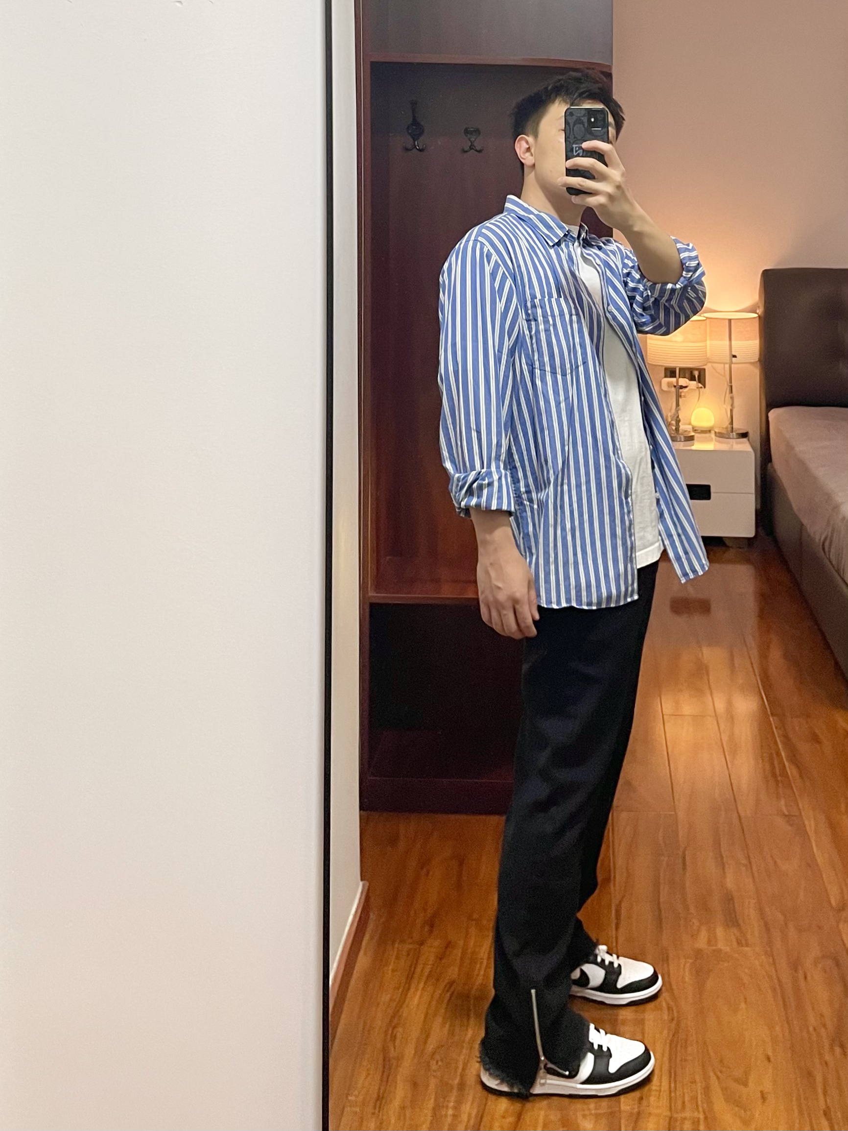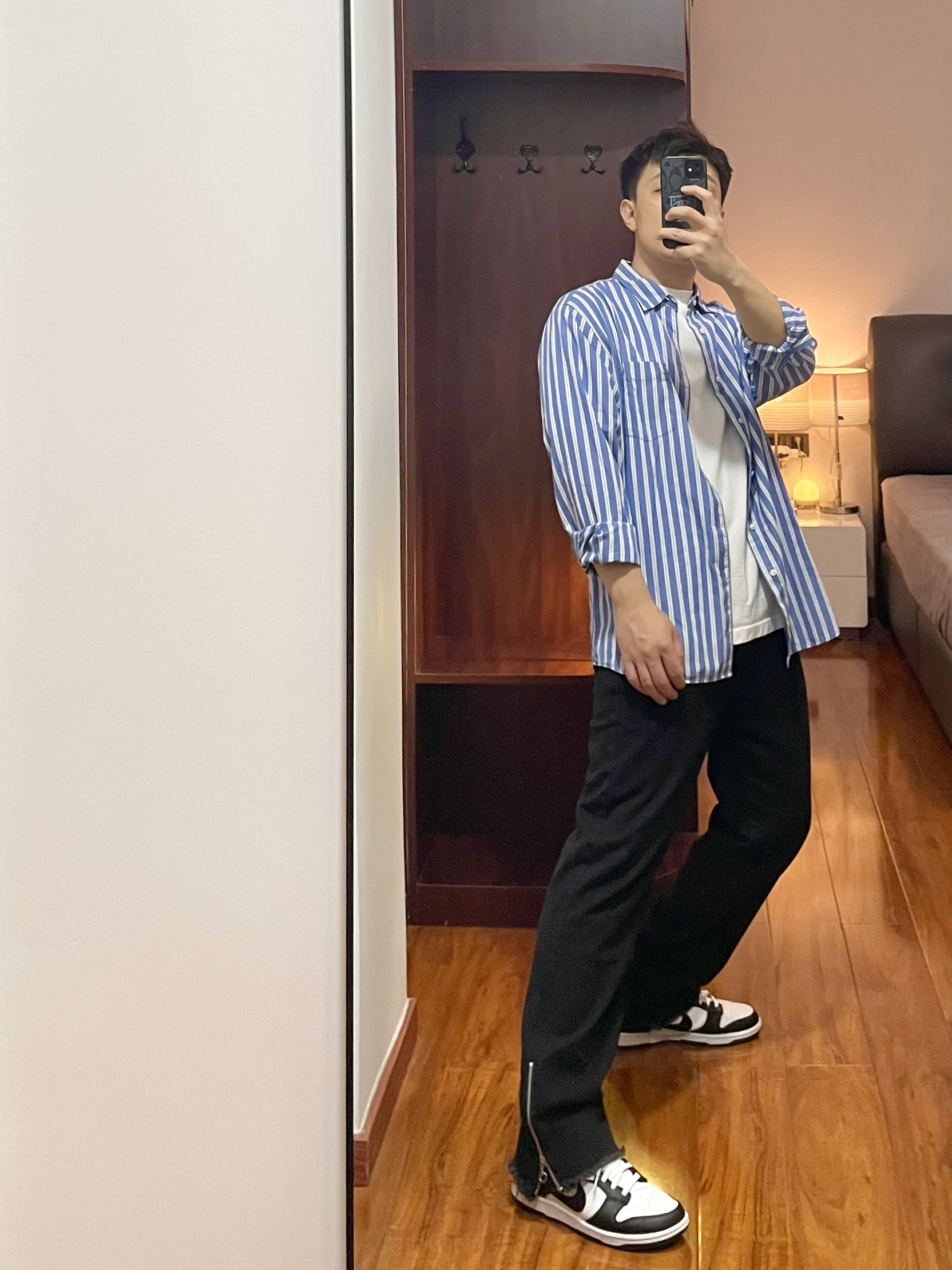 170cm/67kg 一个普通人的穿搭分享 👔:优衣库 条纹衬衫 L 简单的条纹衬衫,蓝白色很清爽,内搭一件白色T休闲舒适。 👖:CRUSH KEY 牛仔裤 L 黑色百搭的牛仔裤,裤脚处有辣拉链,风格很高街,版型宽松腿粗可穿,上身效果很显比例。 👟:Nike dunk 41 熊猫dunk不可或缺的穿搭单品,百搭的鞋型。