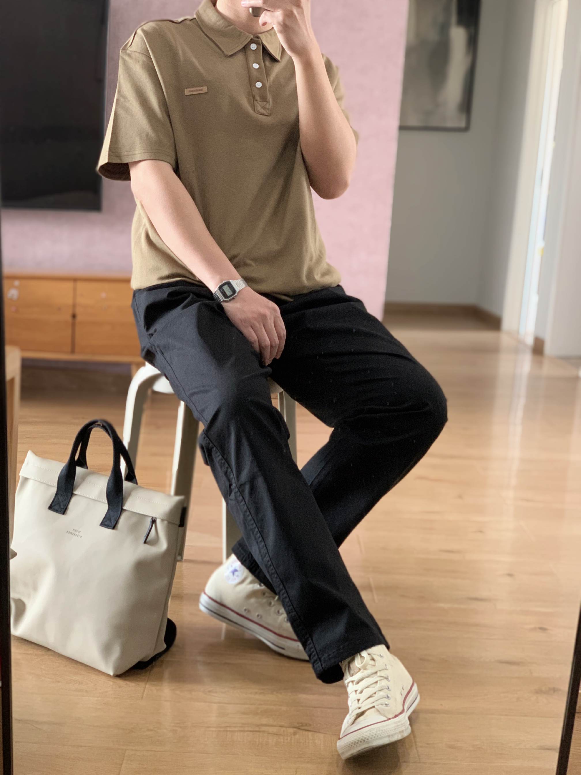 hey 这里是每天记录穿搭的社畜日记😘 穿腻了黑白灰的polo衫 不妨尝试一下很有男人味的军卡其色 搭配黑色裤子是体制内标配了 鞋子选择了一双帆布鞋 就不会过于庄重沉闷 搭配一个同色系的手提包。 军卡其polo+黑色休闲裤+米色帆布鞋 这样简单舒适的通勤穿搭! 还不快喊男朋友来抄作业!