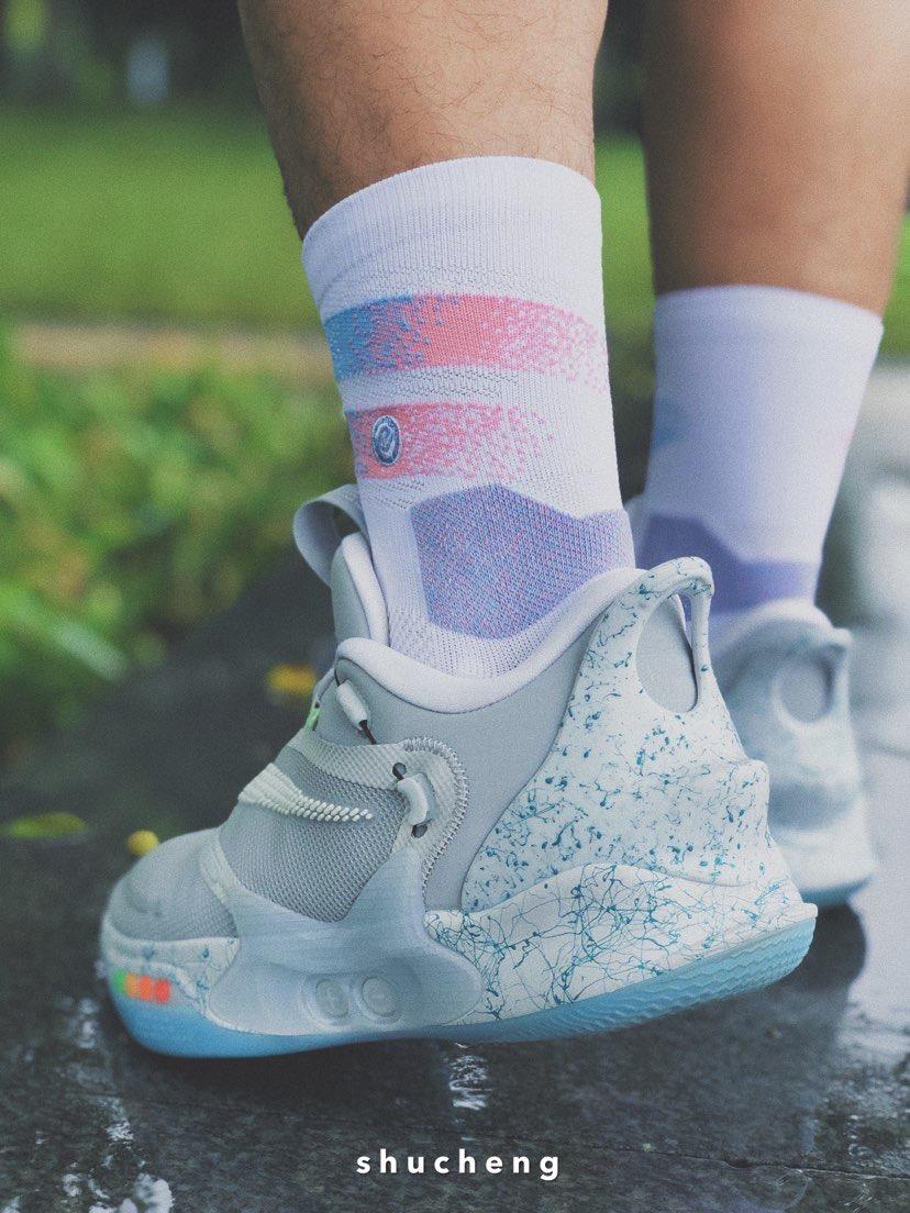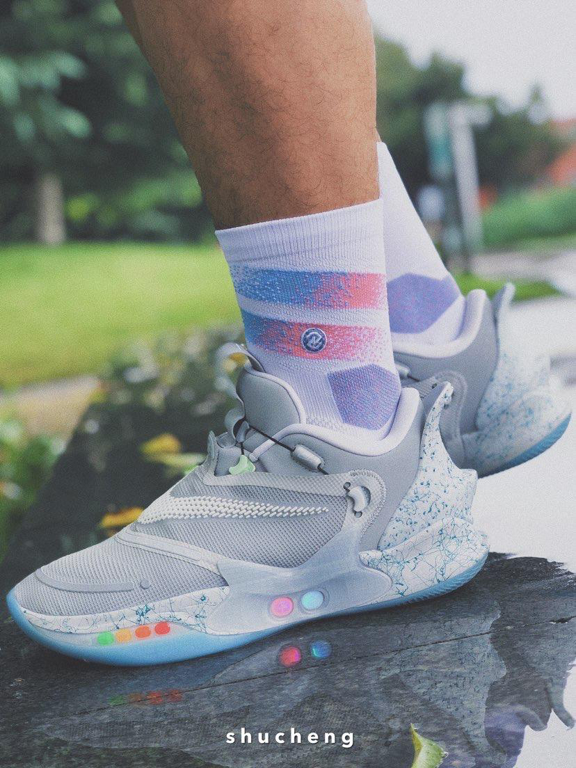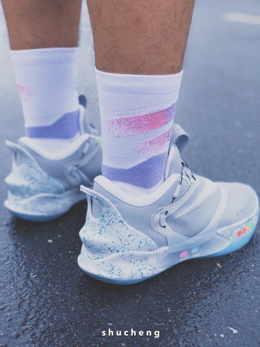 🎨外观配色 此款Adapt BB 2.0致敬了传奇电影《回到未来》中的道具鞋款Nike air mag。 在当时air mag只是一个充满科幻色彩的道具罢了,没想到在今天,Nike将电影中自动系鞋带的鞋子变成了现实! 灰白色的配色方案完美的致敬了air mag,鞋头外侧部分用了彩色的色块点缀,致敬了air mag的后跟部分的彩灯,外底通体大理石泼墨纹路的设计和air mag更是如出一辙。 鞋子最好...