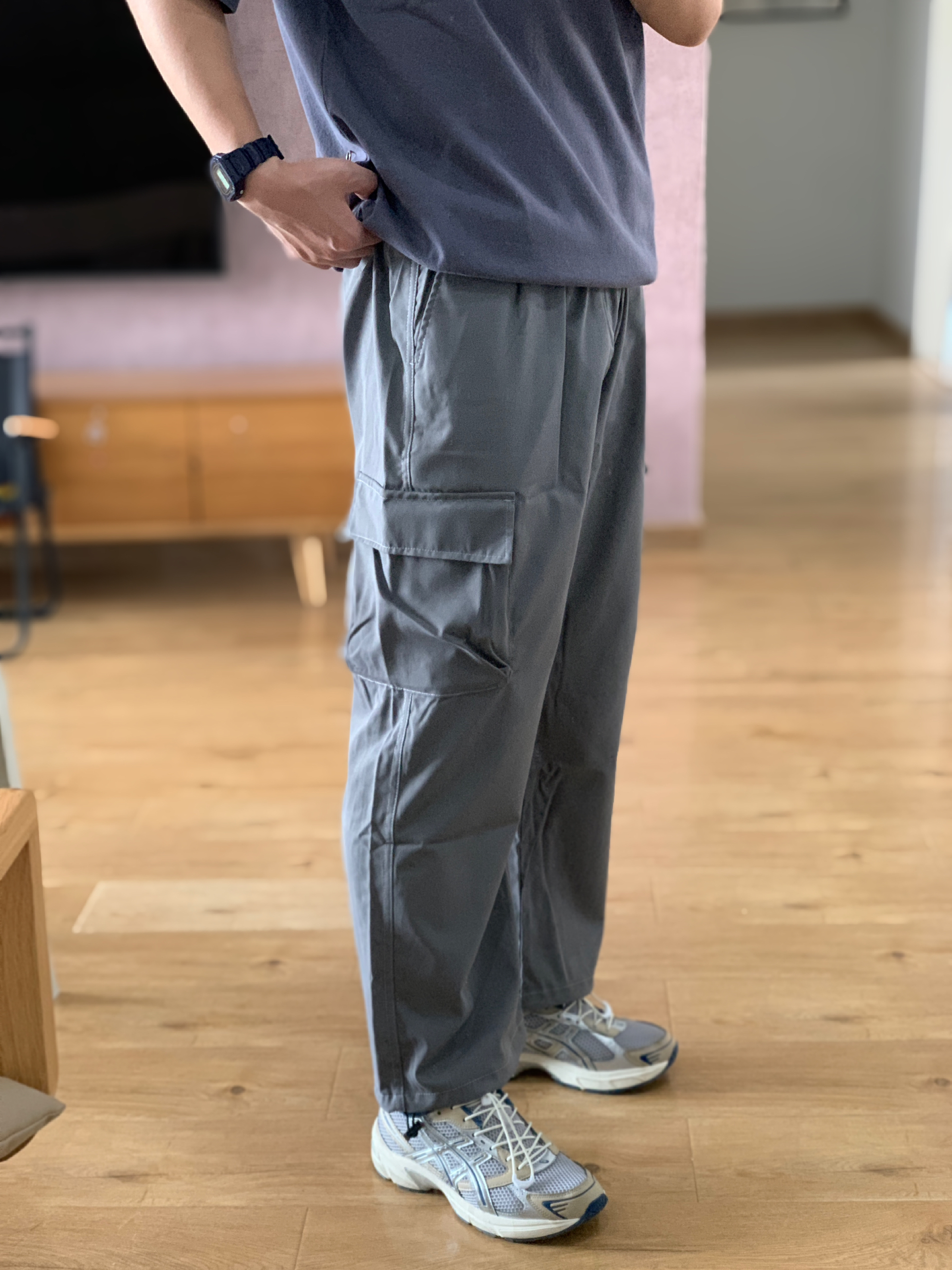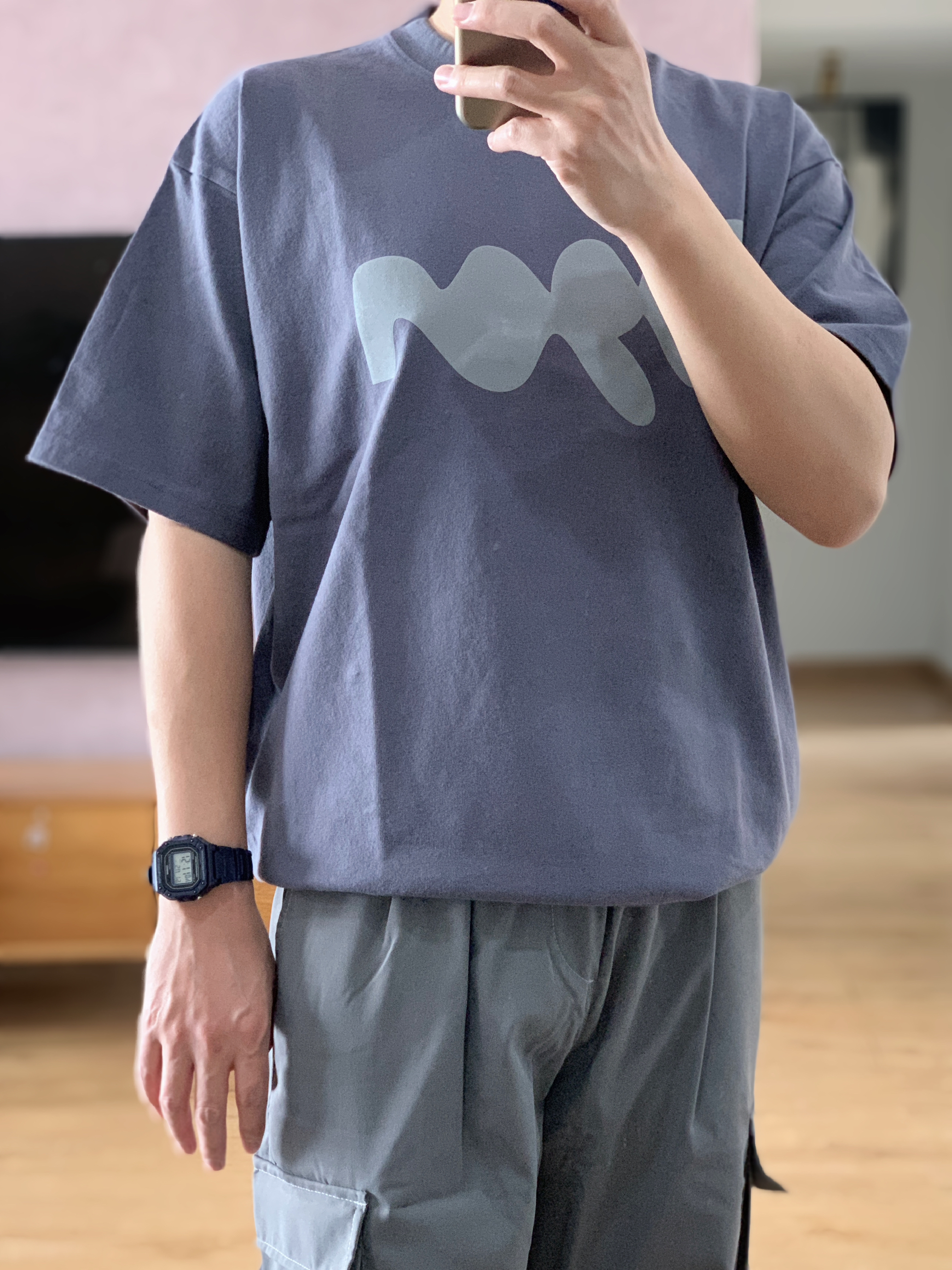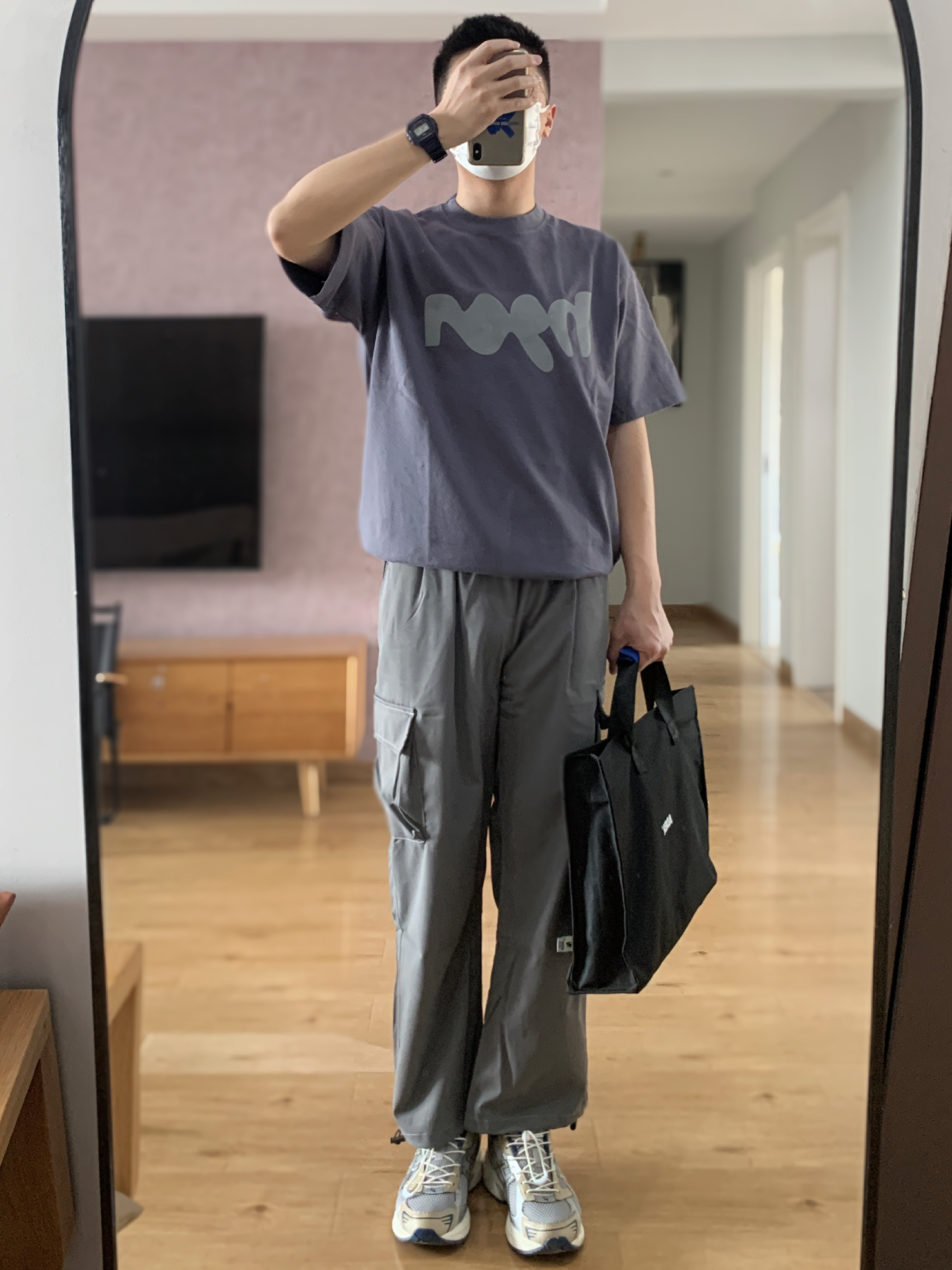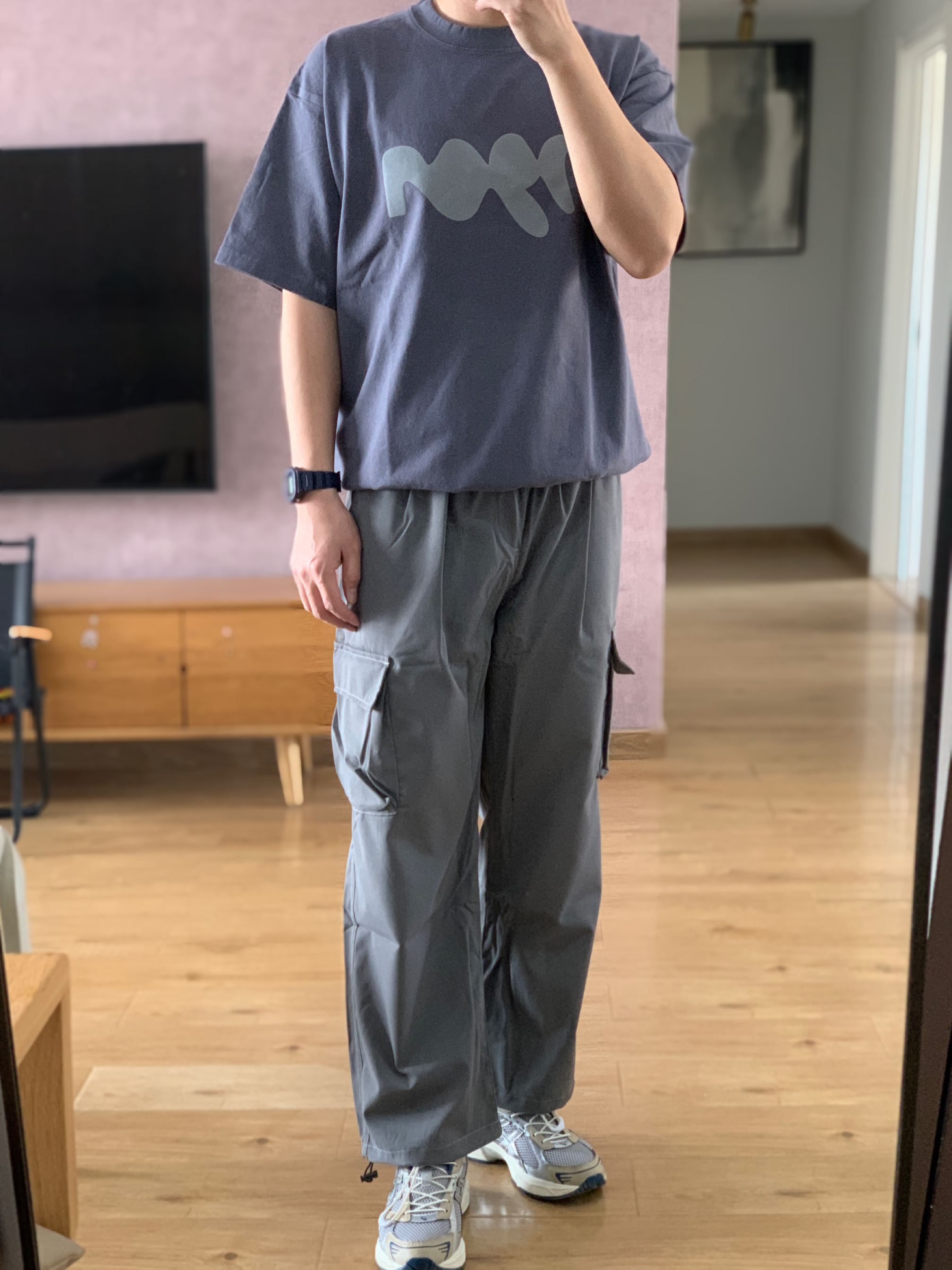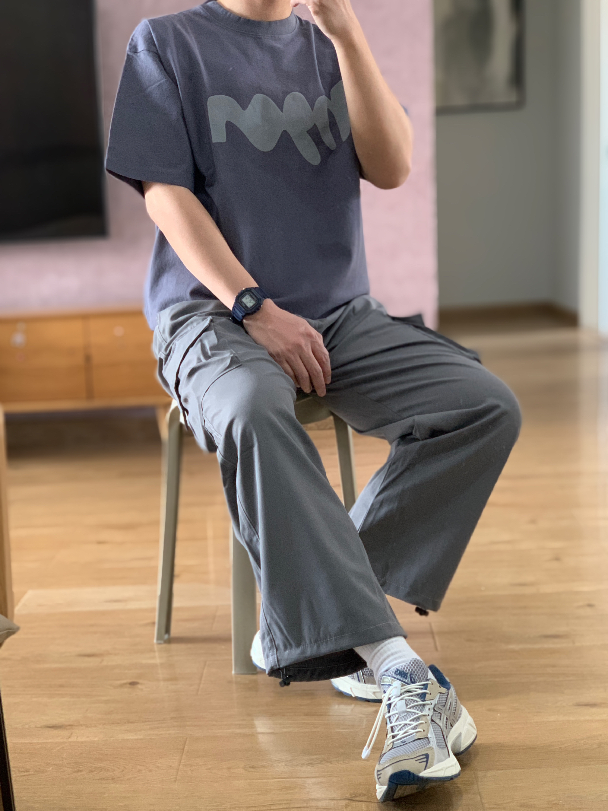 hey 这里是每天记录穿搭的社畜日记😘 穿腻了衬衫polo今天穿休闲一点 低饱和的灰蓝色短袖有点儿小高级 搭配一条钢铁灰的阔腿工装裤 灰蓝配色是我一直很喜欢的搭配 鞋子选择了配色相近的复古跑鞋 这样简简单单干干净净的穿搭真的不挑人 👟:Asics Gel-1130 米灰色/银色