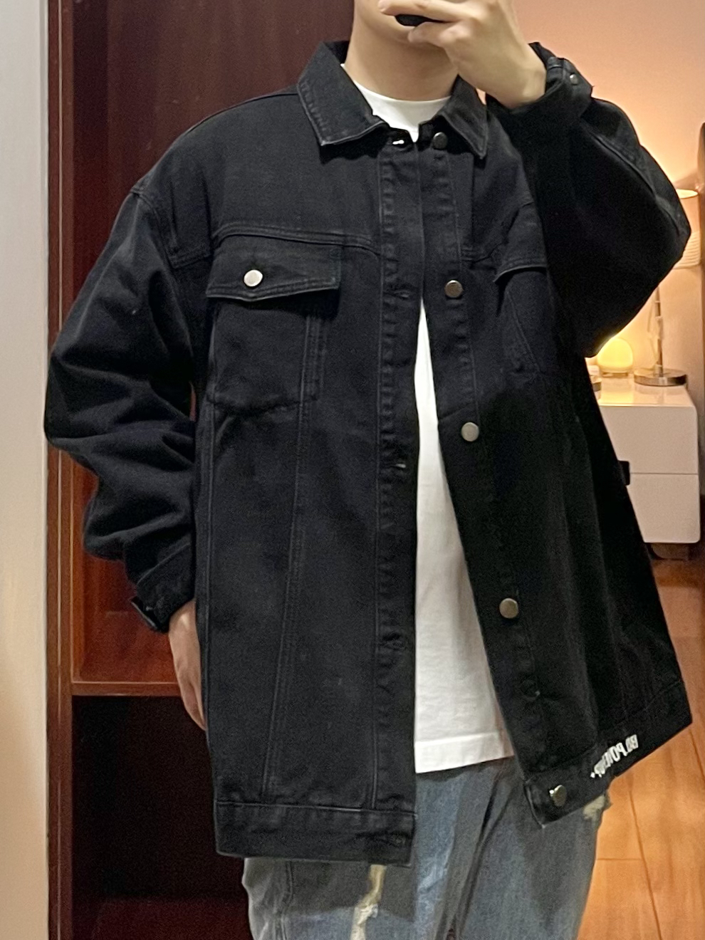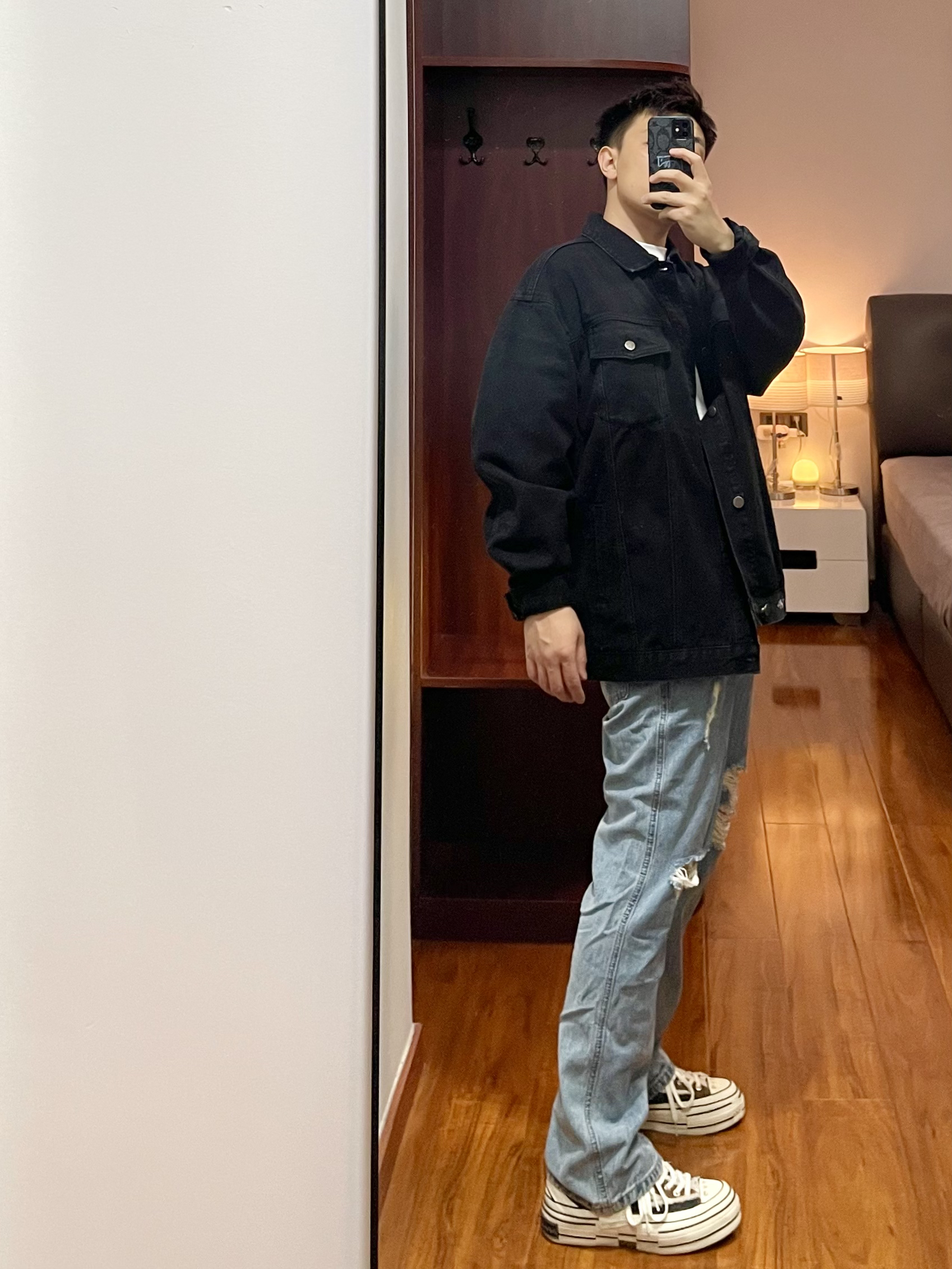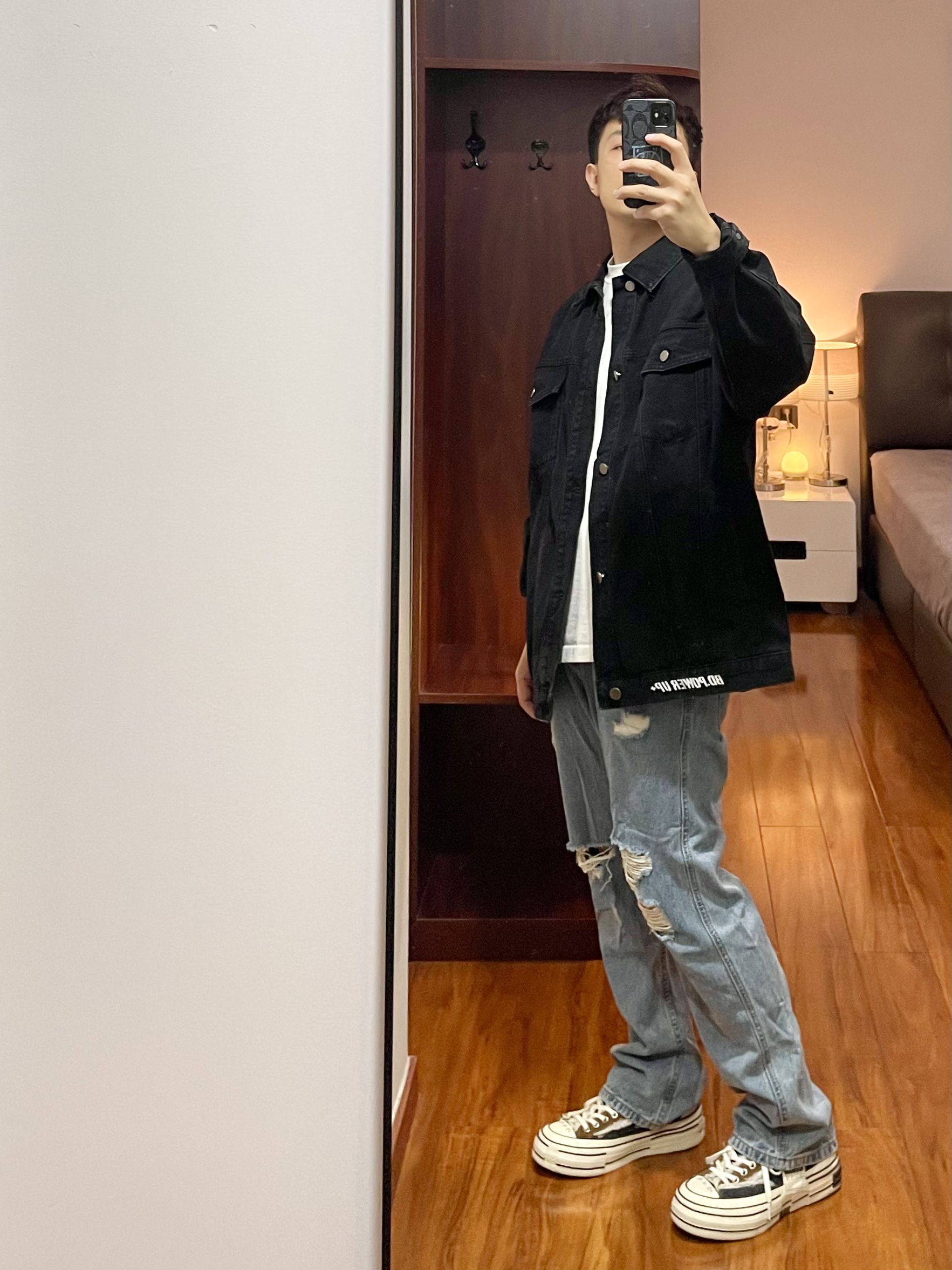 170cm/67kg 一个普通人的穿搭分享 👔:BD.POWER 牛仔外套 M 黑色宽松版型的牛仔夹克,版型厚实硬挺,春秋季你内搭一件T恤就够了,背面有字母印花,上身效果硬朗帅气。 👖:破洞牛仔裤 浅色宽松版型的破洞牛仔裤,版型直筒宽松。 👟:xvessel 牛仔拼接 休闲鞋款,搭配直筒裤很合适。