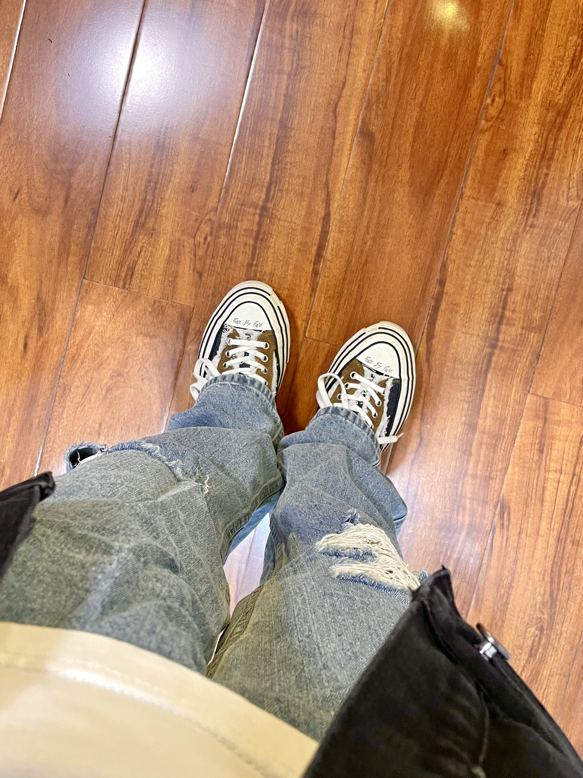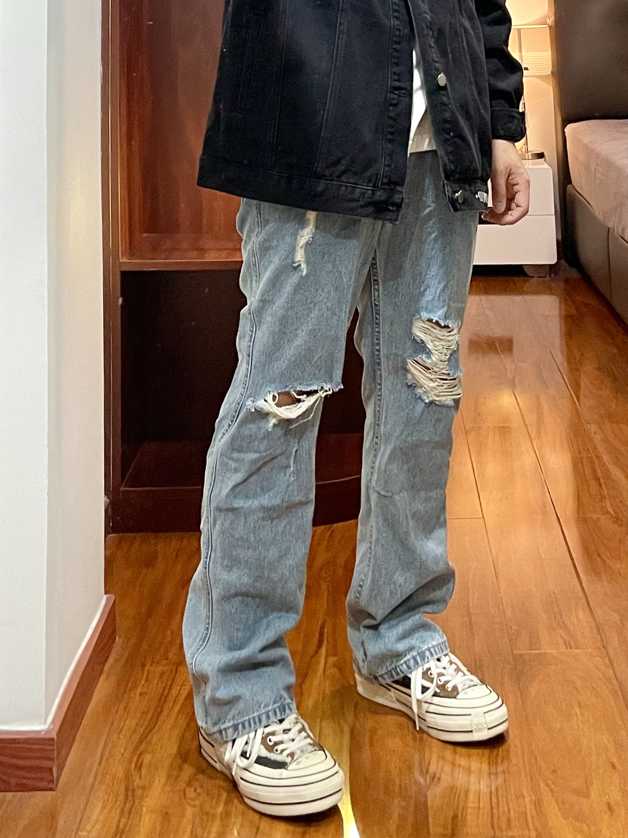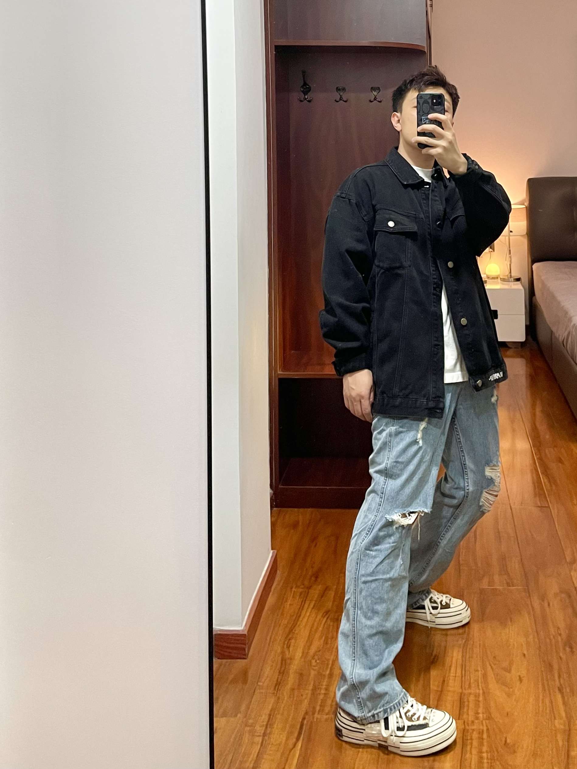 170cm/67kg 一个普通人的穿搭分享 👔:BD.POWER 牛仔外套 M 黑色宽松版型的牛仔夹克,版型厚实硬挺,春秋季你内搭一件T恤就够了,背面有字母印花,上身效果硬朗帅气。 👖:破洞牛仔裤 浅色宽松版型的破洞牛仔裤,版型直筒宽松。 👟:xvessel 牛仔拼接 休闲鞋款,搭配直筒裤很合适。