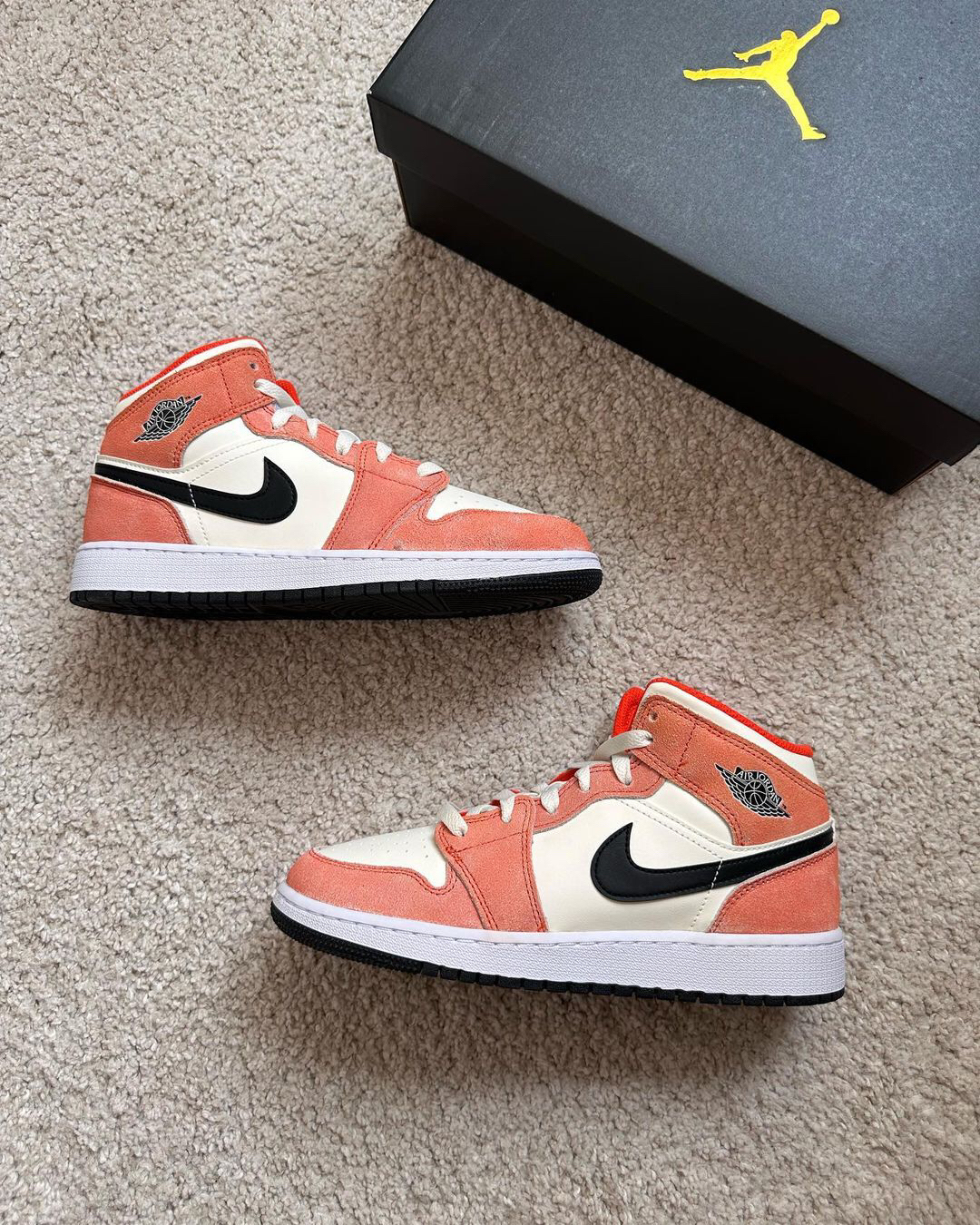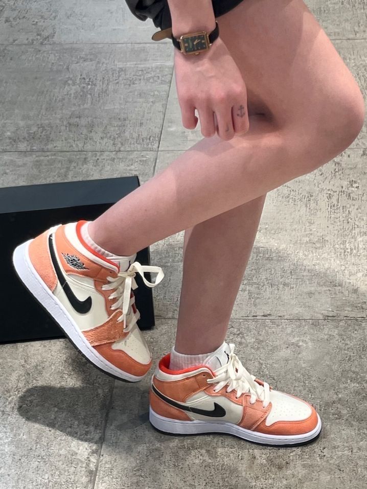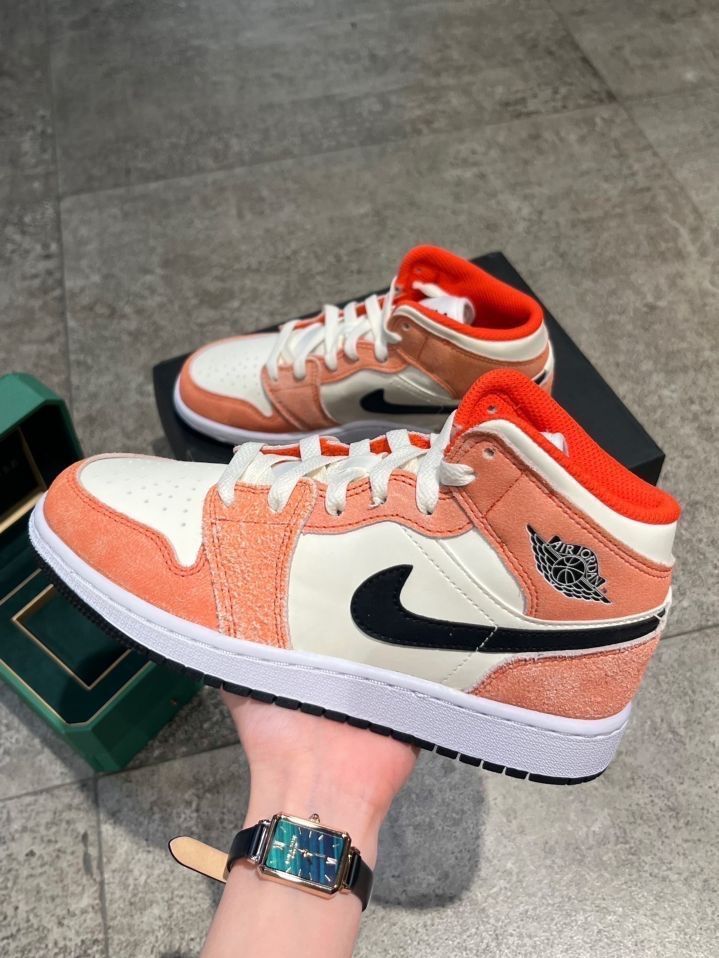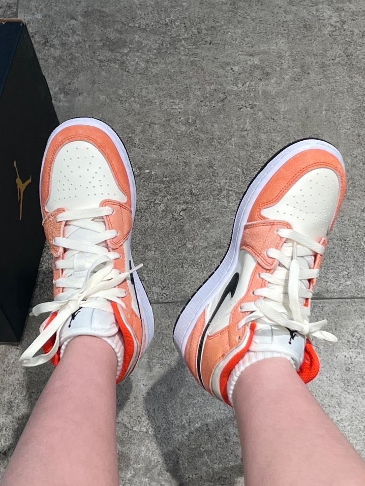 👟:AJ1 Mid粉橙色🍤 这双粉橙色的鞋和春夏更配哦~ 早春穿搭很适合浅色和亮色系! 皮革鞋底➕橙色绒革覆面 水洗做旧的感觉很复古~ 学生党在校园里穿着敲有活力 现在的价格也很香~喜欢的小伙伴们可以下手啦~