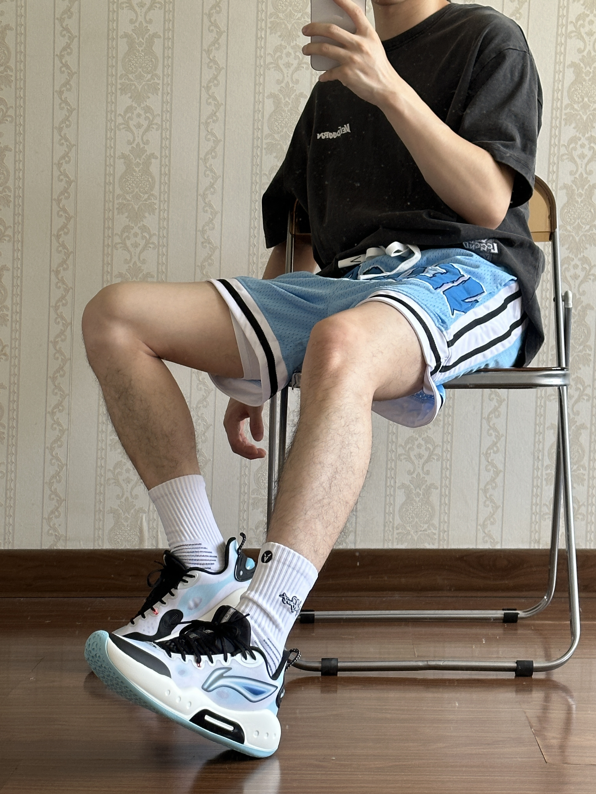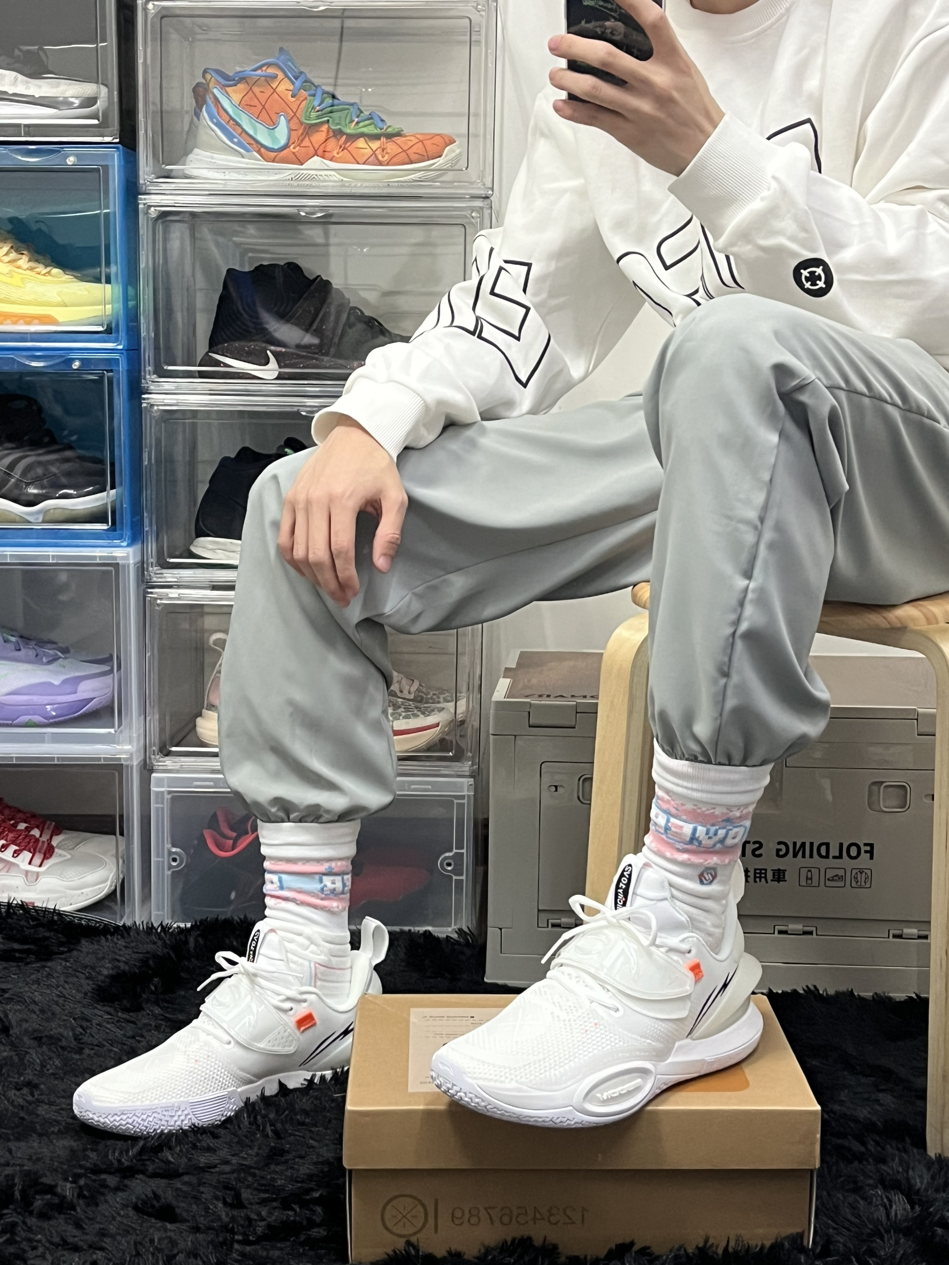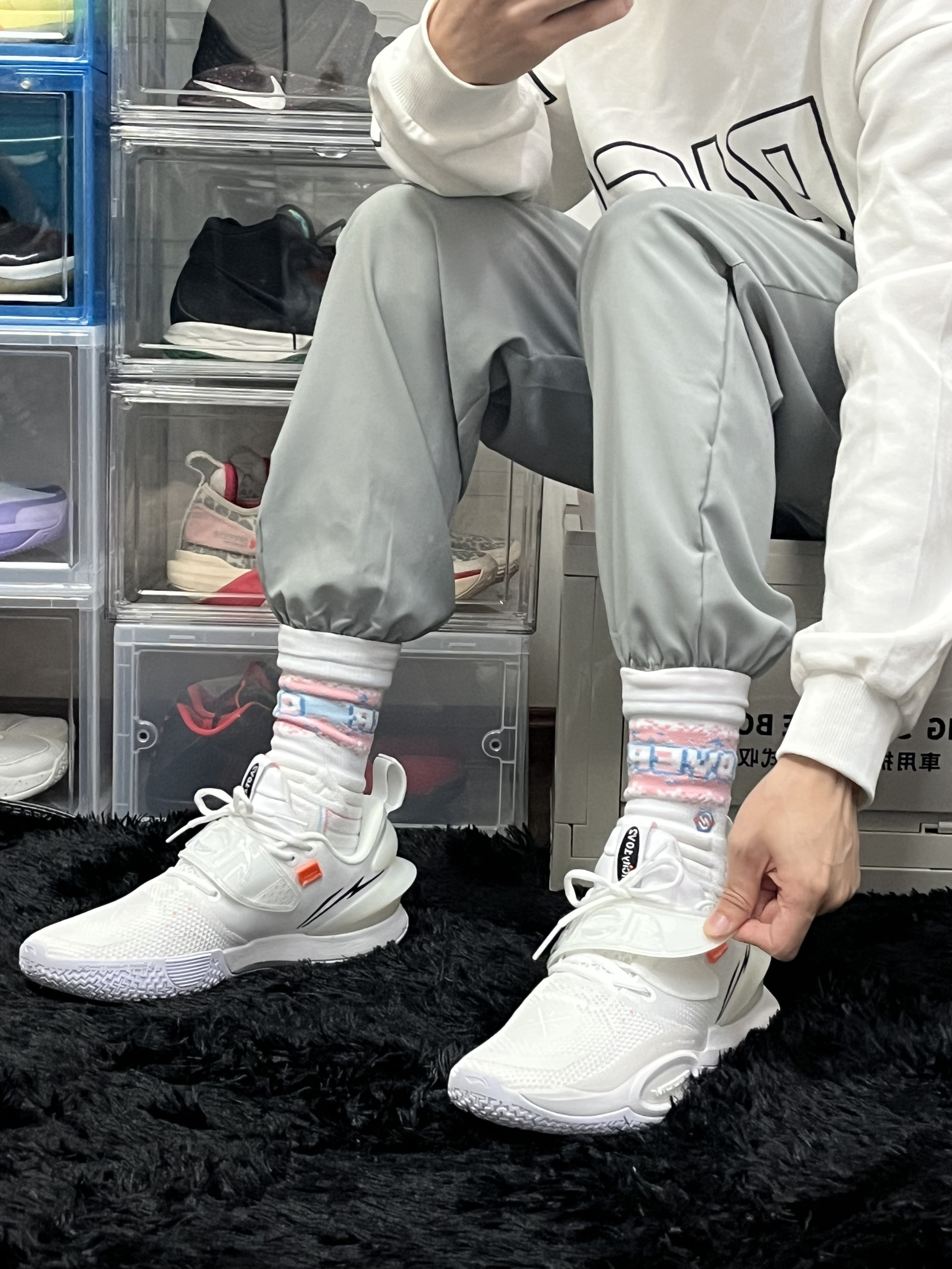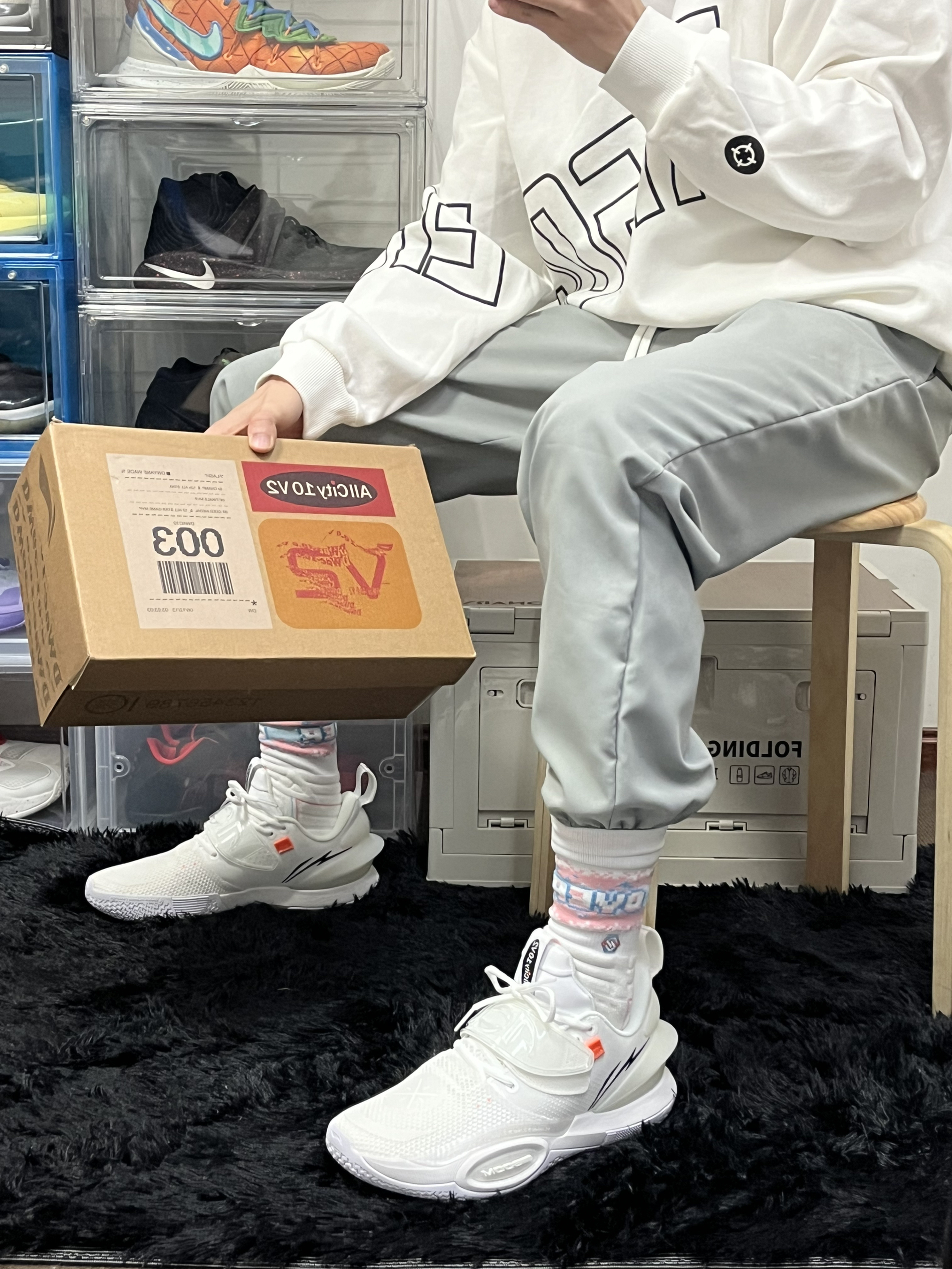 这双全白配色的v2真滴帅 纯白涂装搭配上橙色和黑色点缀 简约却又不失设计感 侧边像闪电⚡️的李宁logo让它变得更酷炫了 ✨ 这双V2搭配上魔术贴 包裹感超强 如果是宽脚高脚背的兄弟们要买大半码 🥼 纯白色的球鞋简直不要太好搭 无论是搭配运动还是休闲装都可以完美驾驭 总结👌 个人认为它是一双又帅又能打的实战鞋 颜值高 实战没什么毛病 5开的价格性价比还是不错的