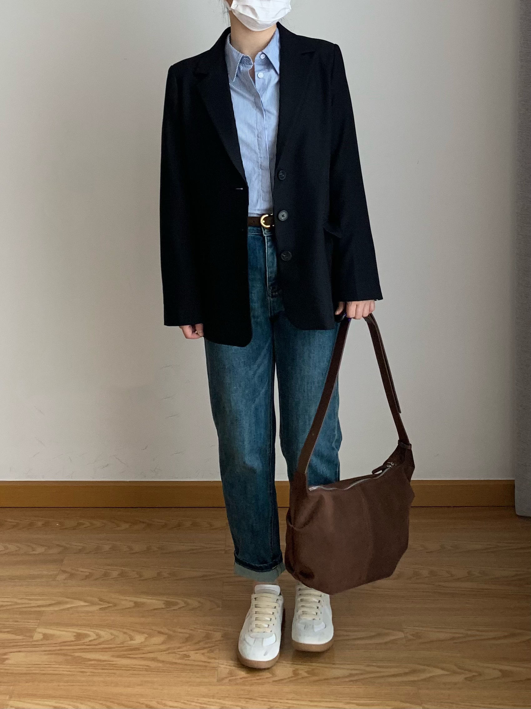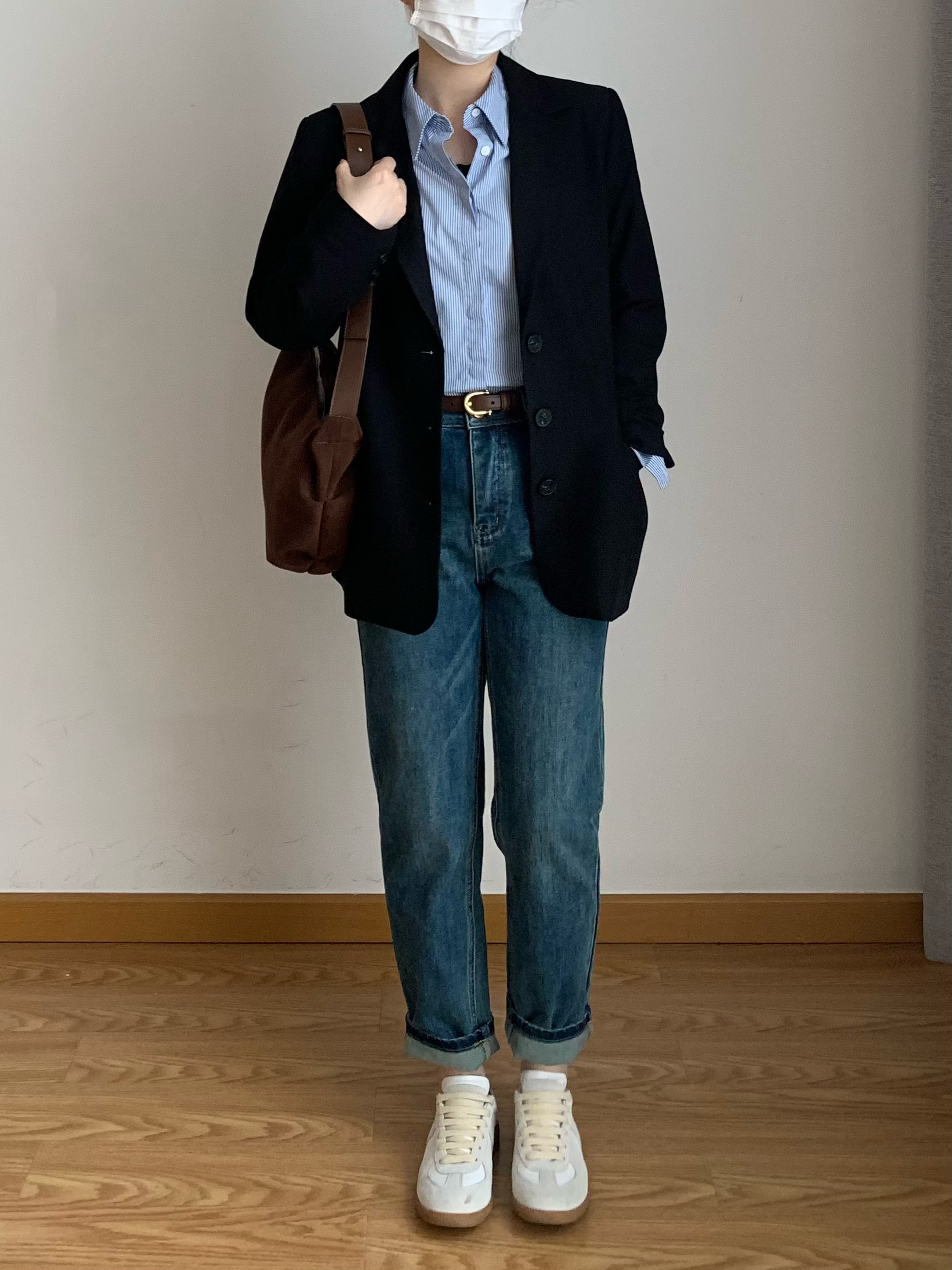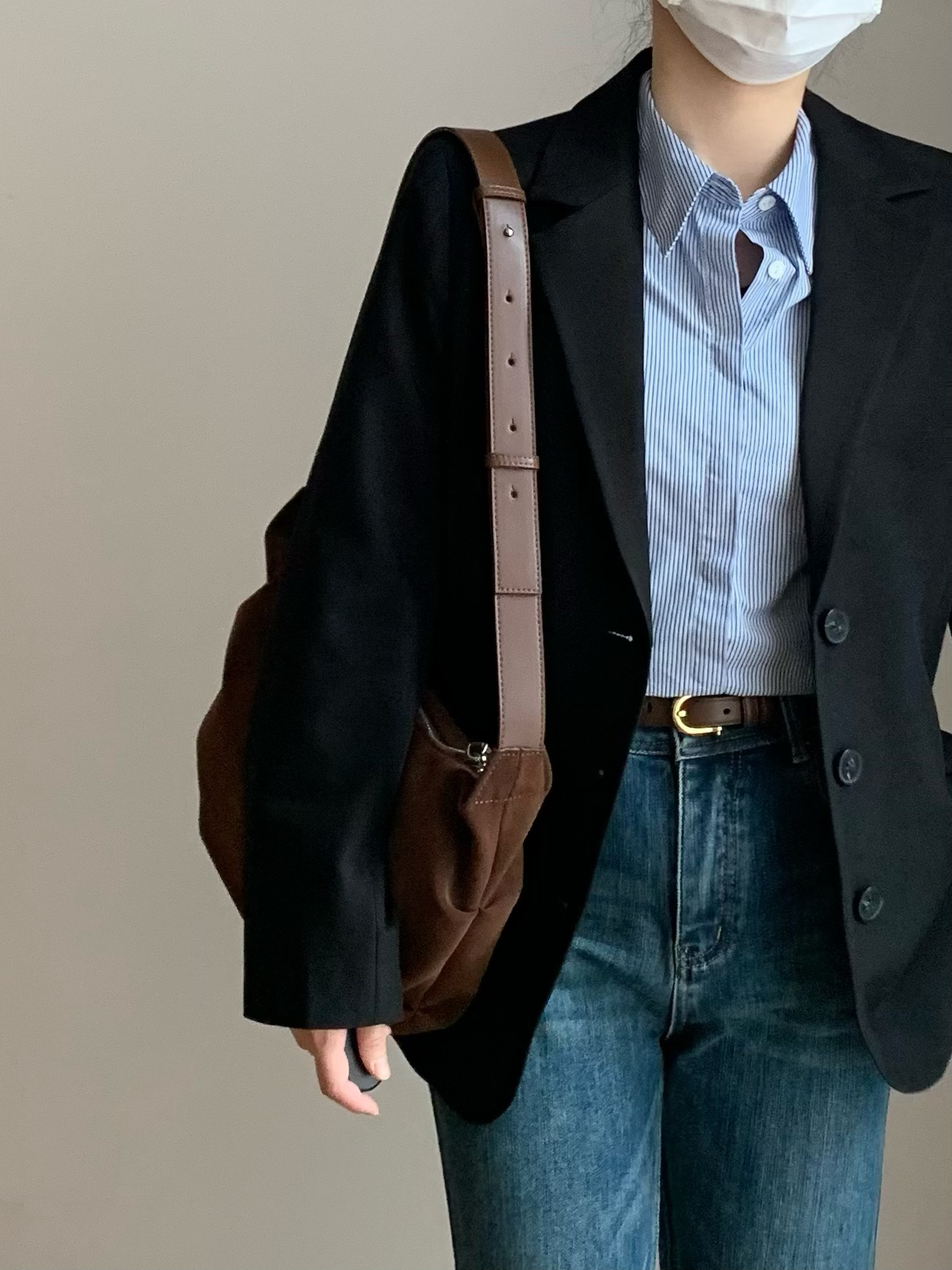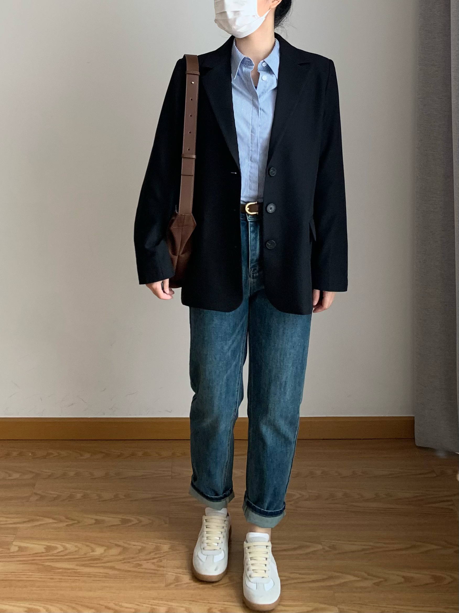 黑色西装x蓝色条纹衬衫x黑Tx高腰牛仔裤 oversize的西装和稍微修身的条纹衬衫形成对比,松弛中带些利落感~ 西装适合宽肩的小个子或者高瘦一些的女生~整体剪裁简单干净 衬衫版型比较挺括,作为通勤或者休闲单品都蛮不错 ~ 最后搭配棕色单肩包增加趣味感~ 🧥 外套:Belagirls昼夜 👔 衬衫:Lazy Zoe 👖 下装:WR