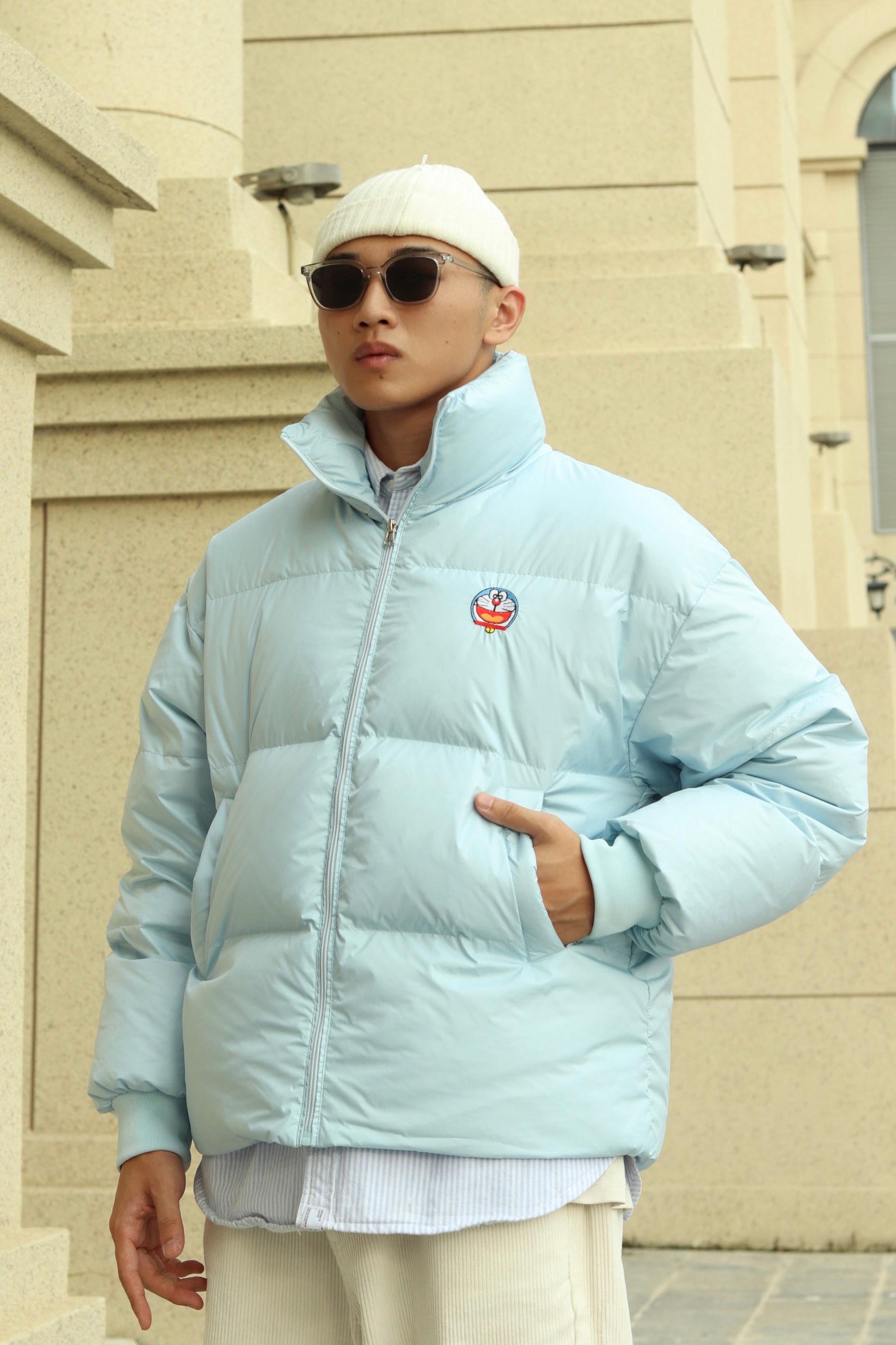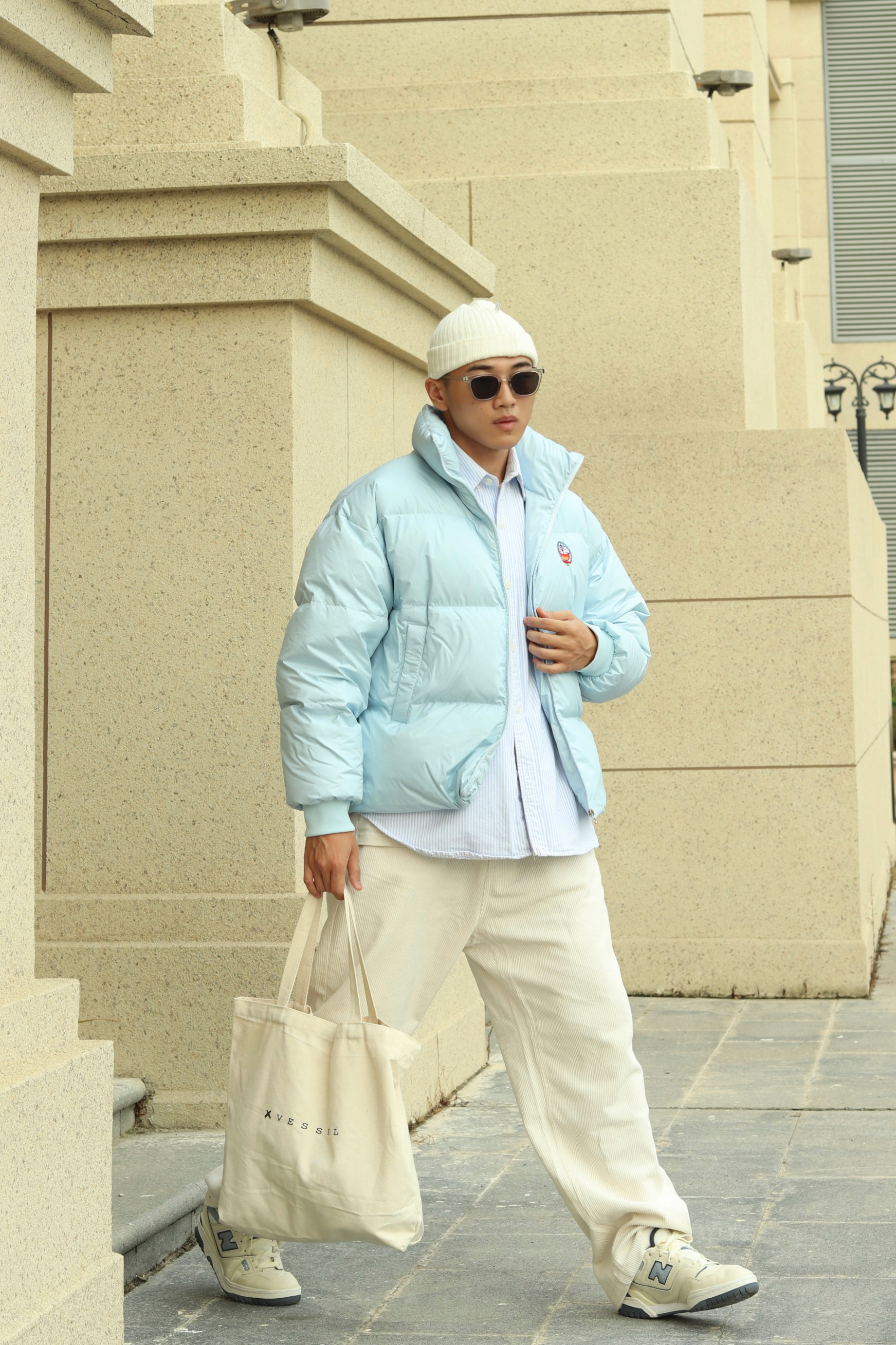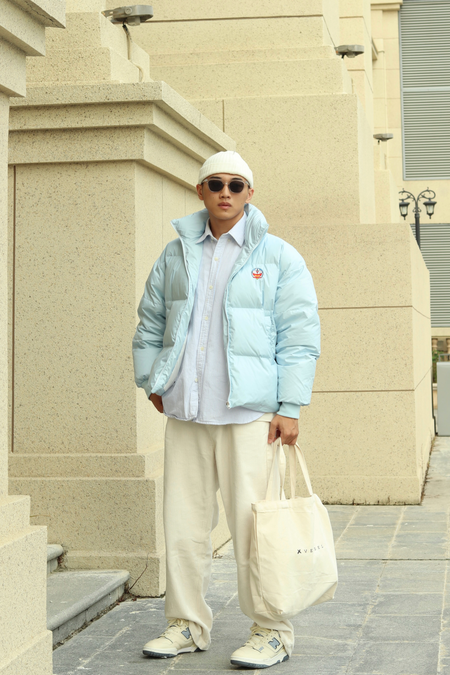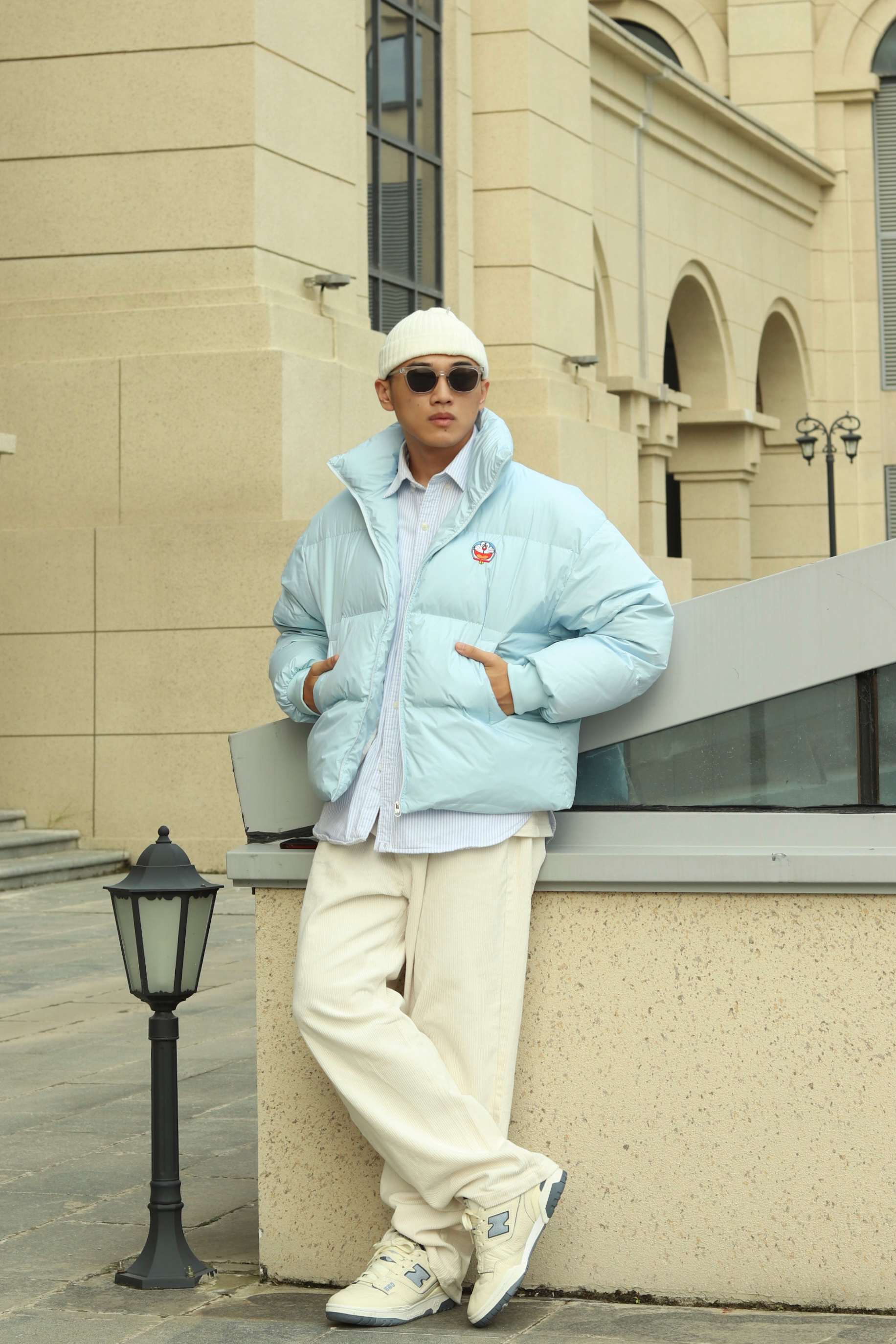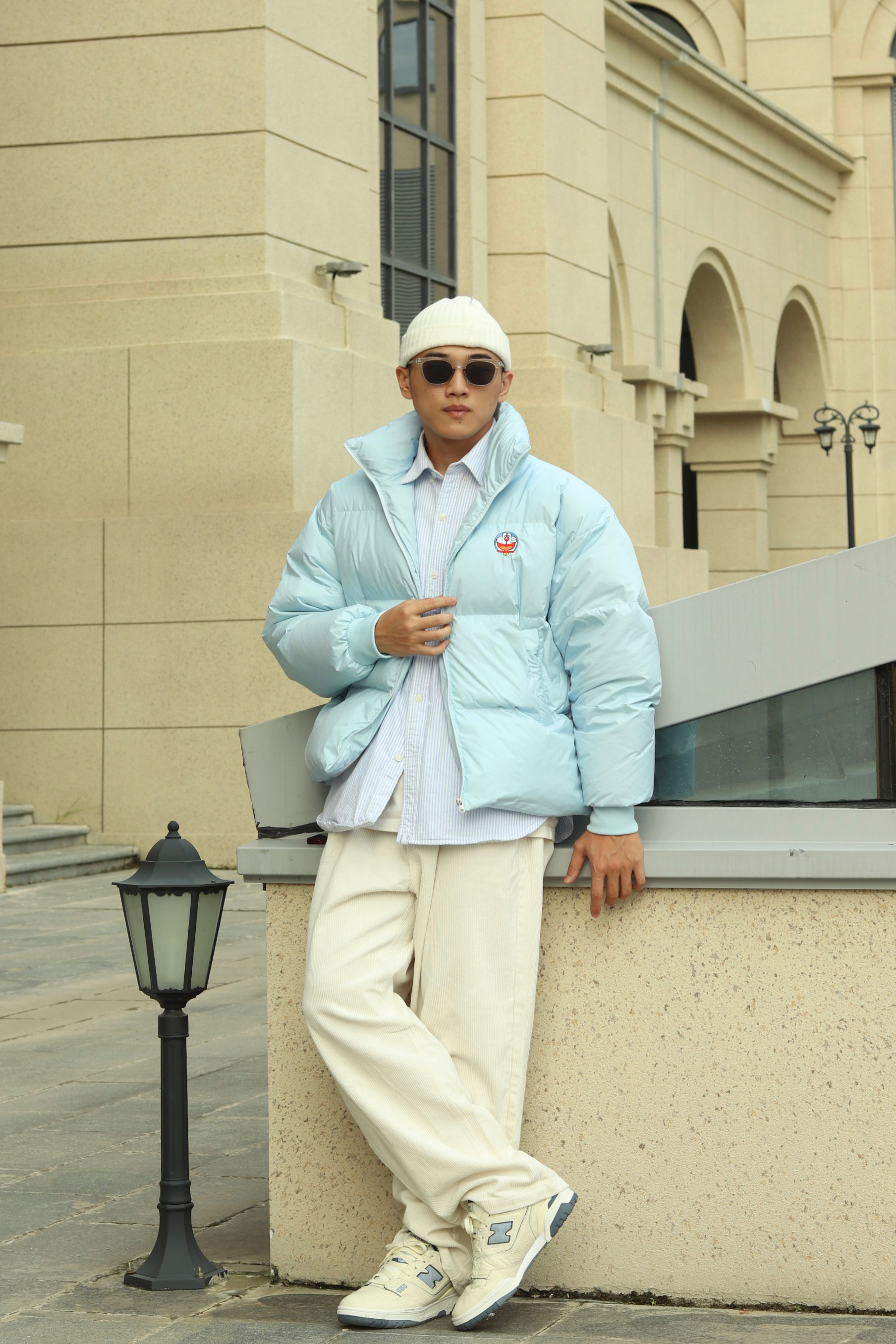 halo大家 这里是不会唱歌的章鱼章鱼哥 今天章鱼给大家分享一下 白蓝色系的一套穿搭 上身白色内搭叠穿蓝色条纹衬衫 外套一件天蓝色机器猫棉服 裤子一条米色灯芯绒长裤 再搭配一双美式nb550 最后一顶白色冷帽完成穿搭 穿搭小tips 整体白蓝配色为主 一身顺色搭配用蓝色进行点缀