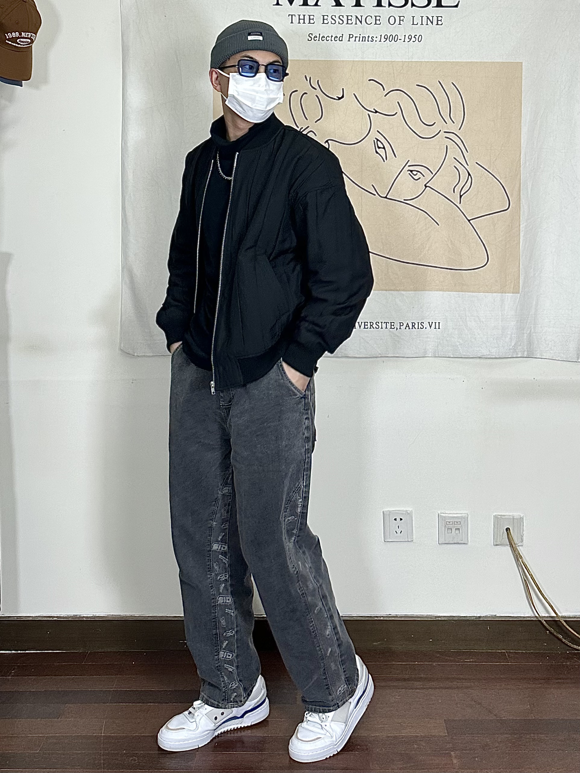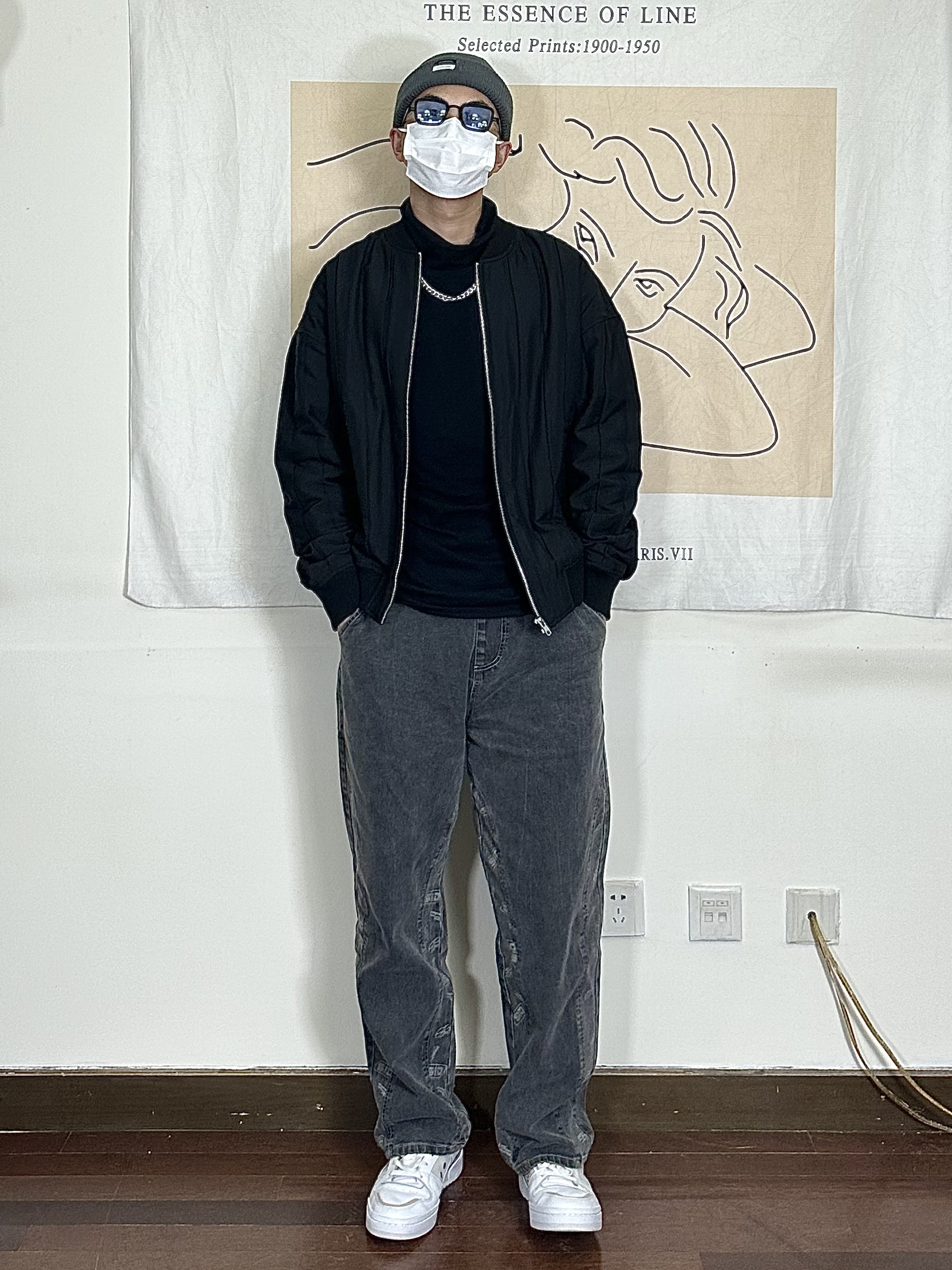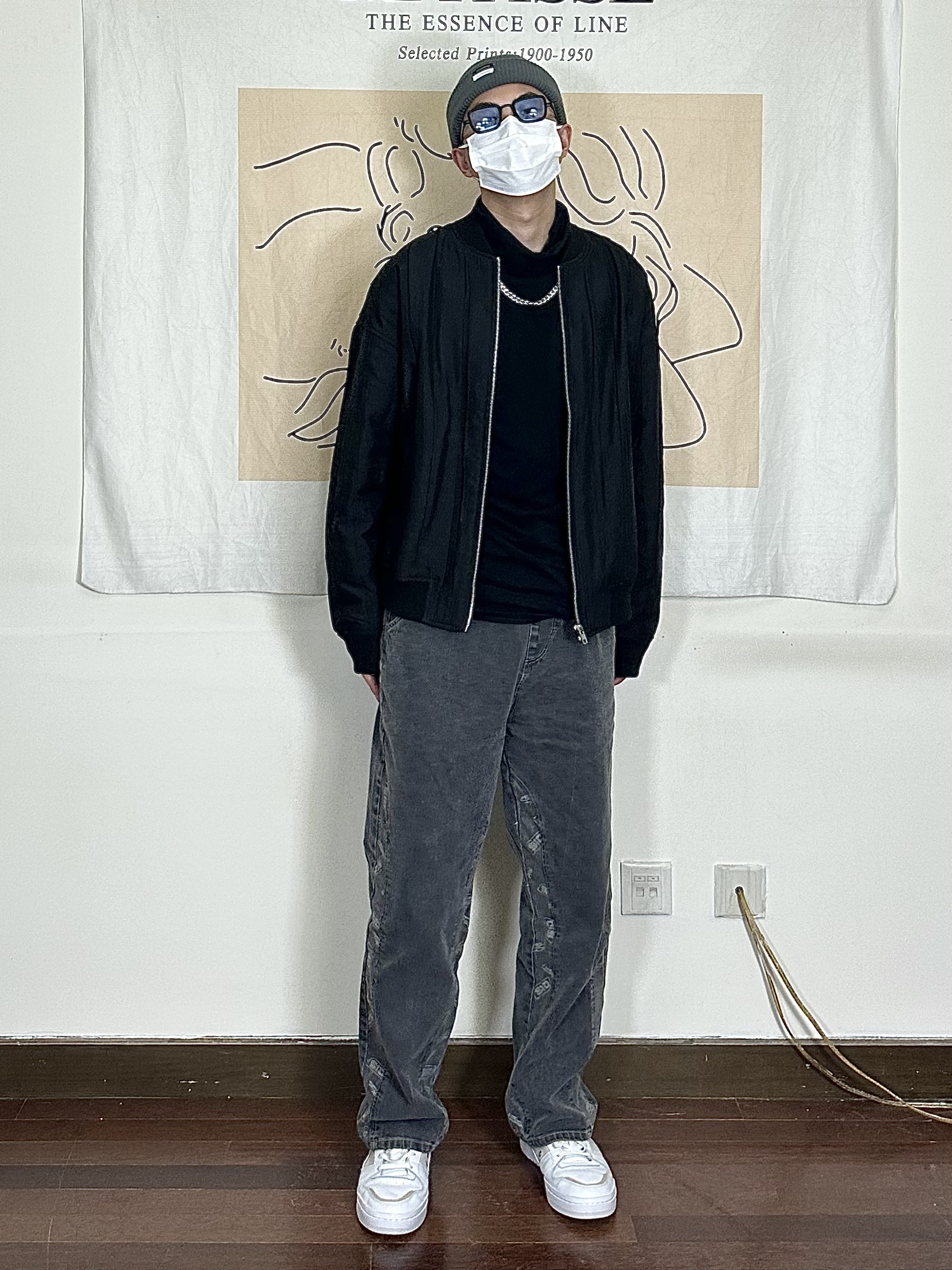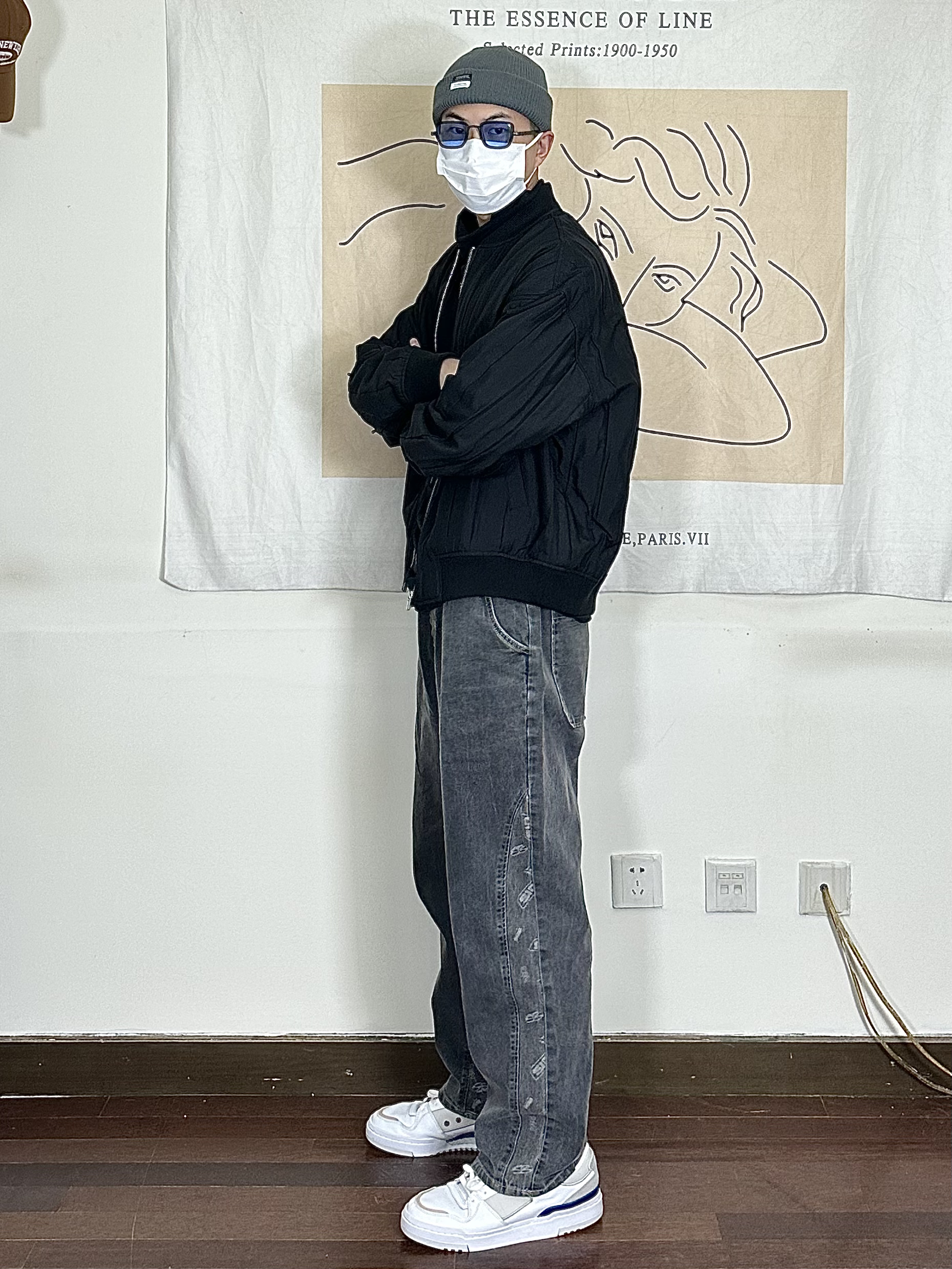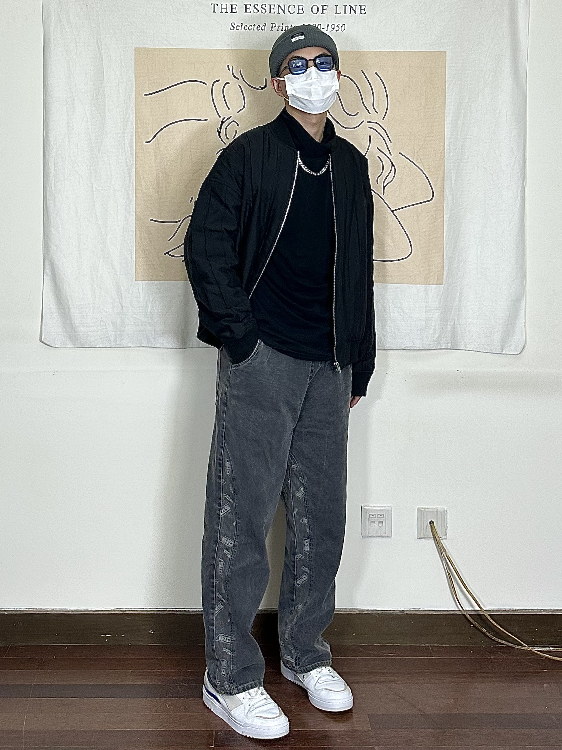 身高|体重:178/140 🧍♂️ 穿搭风格:黑色系简约 👔 上衣:黑色夹克 👖 下装:阔腿刺绣裤子 👟 鞋子:板鞋 🎒配饰:帽子