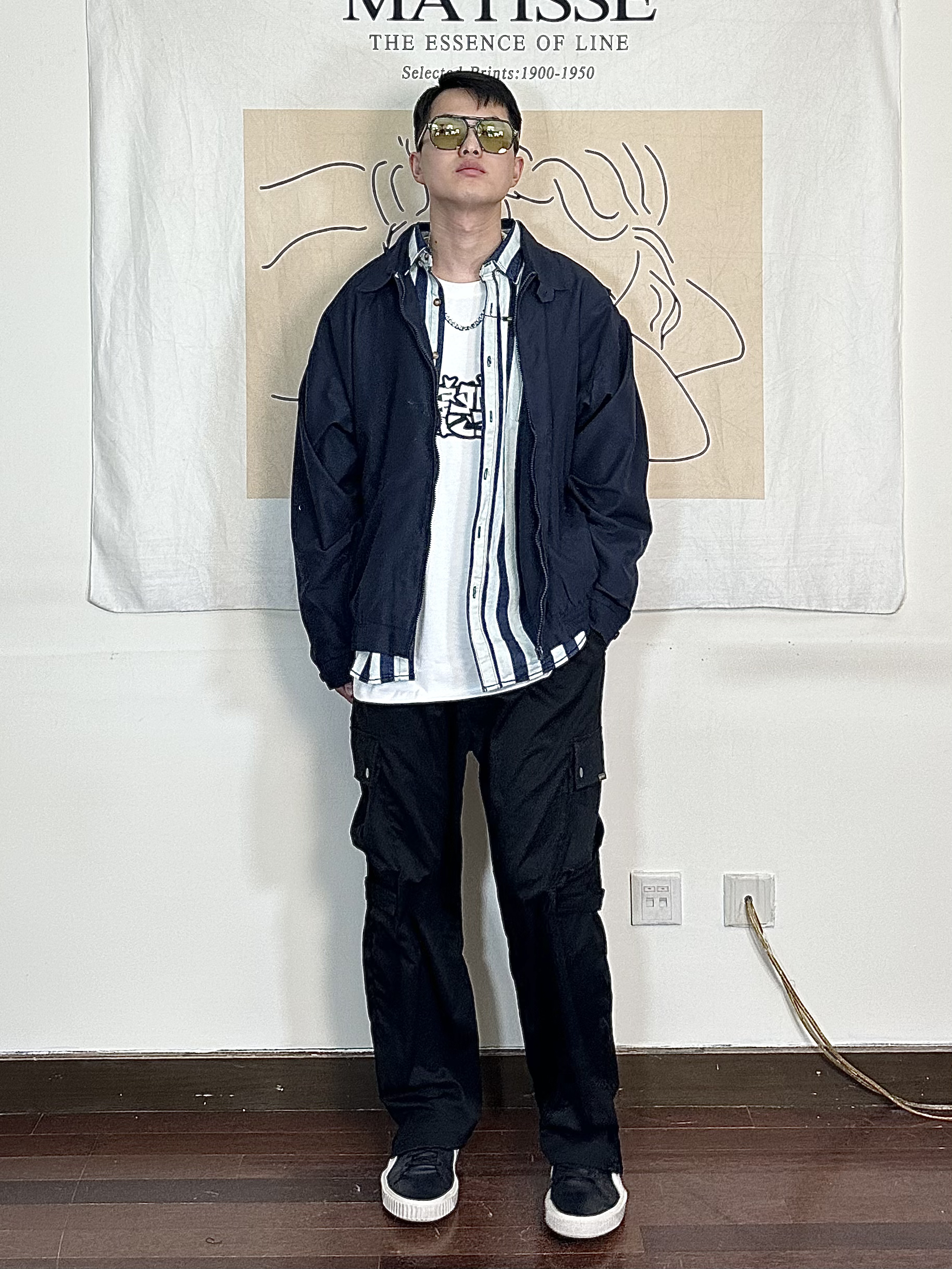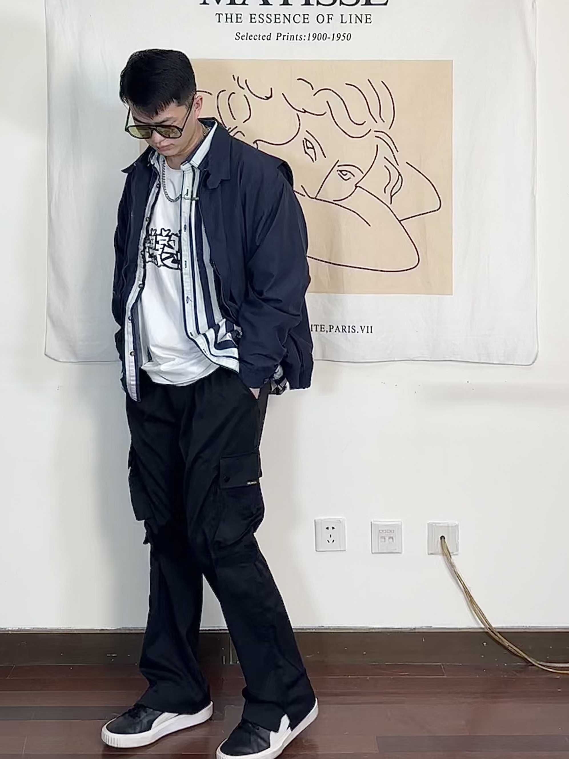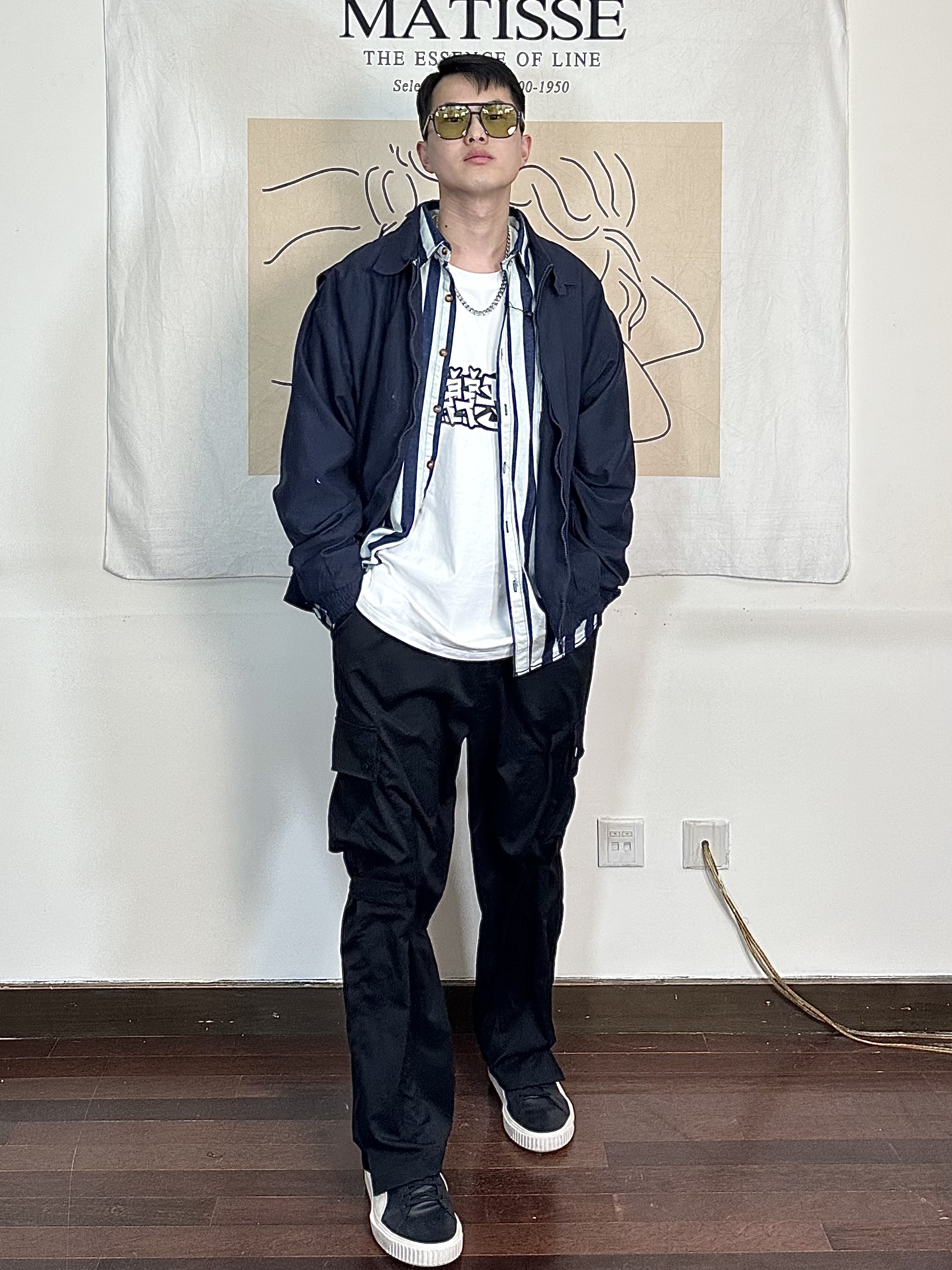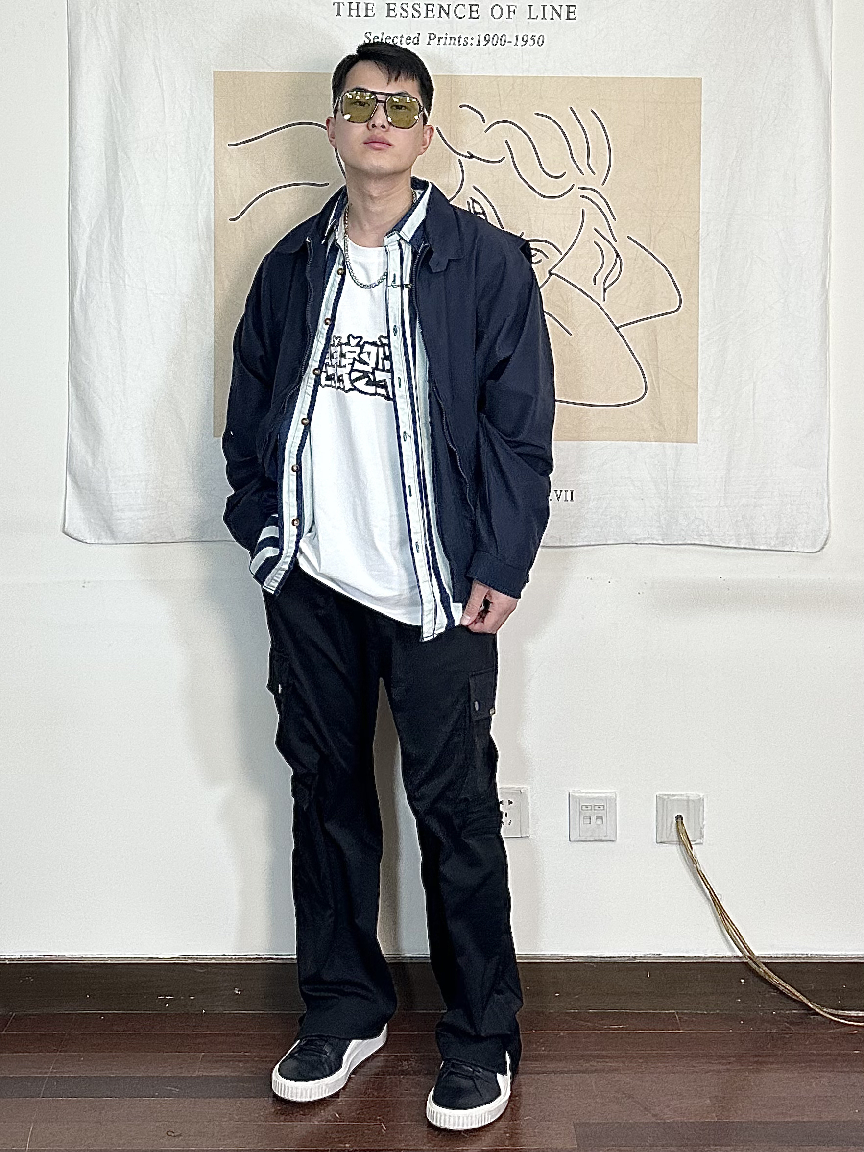 身高|体重:178/140 🧍♂️ 穿搭风格:叠穿新风格 👔 上衣:条纹衬衣➕蓝色外套 👖 下装:阔腿开衩裤子 👟 鞋子:板鞋 🎒配饰:墨镜🕶️