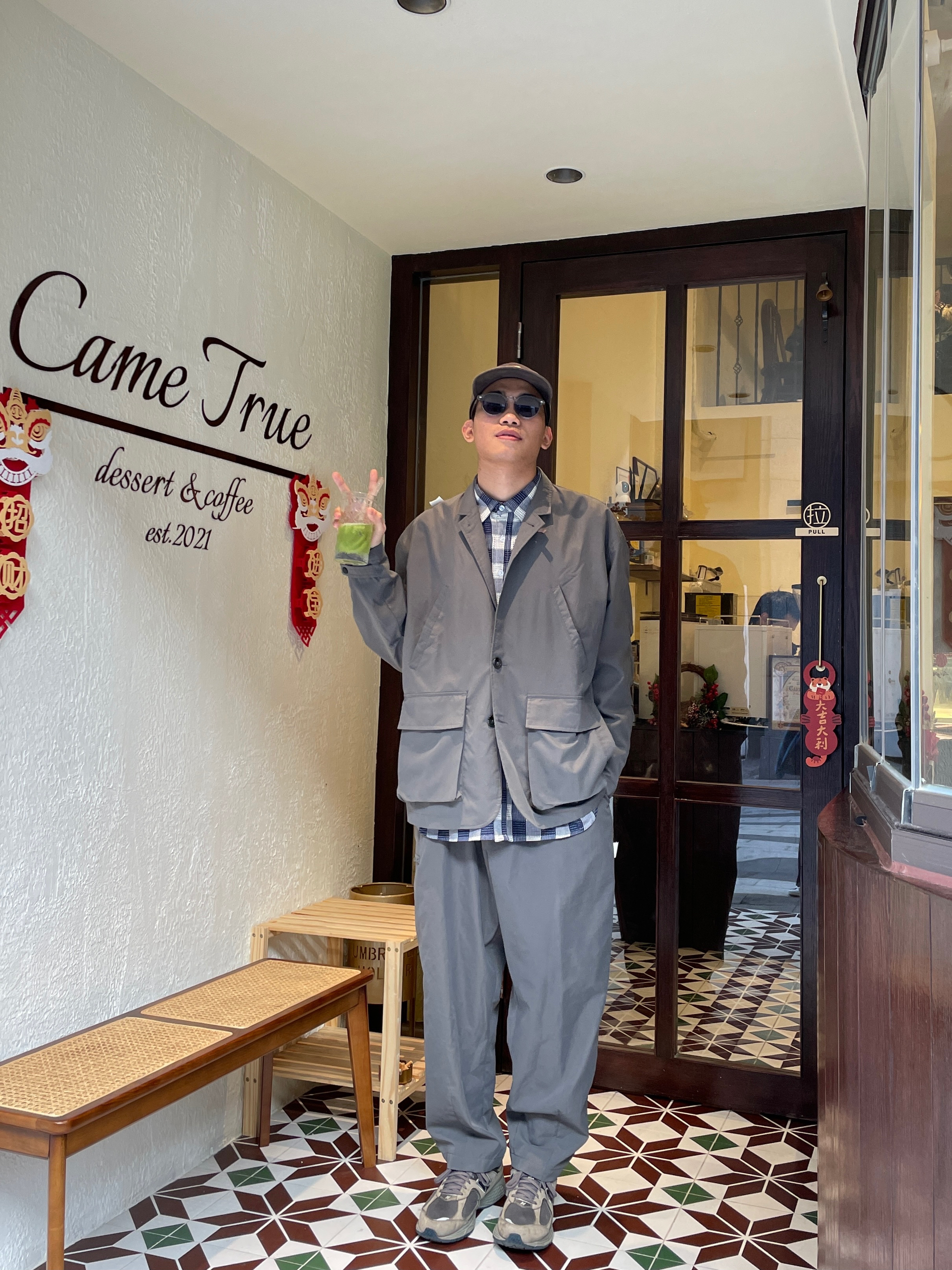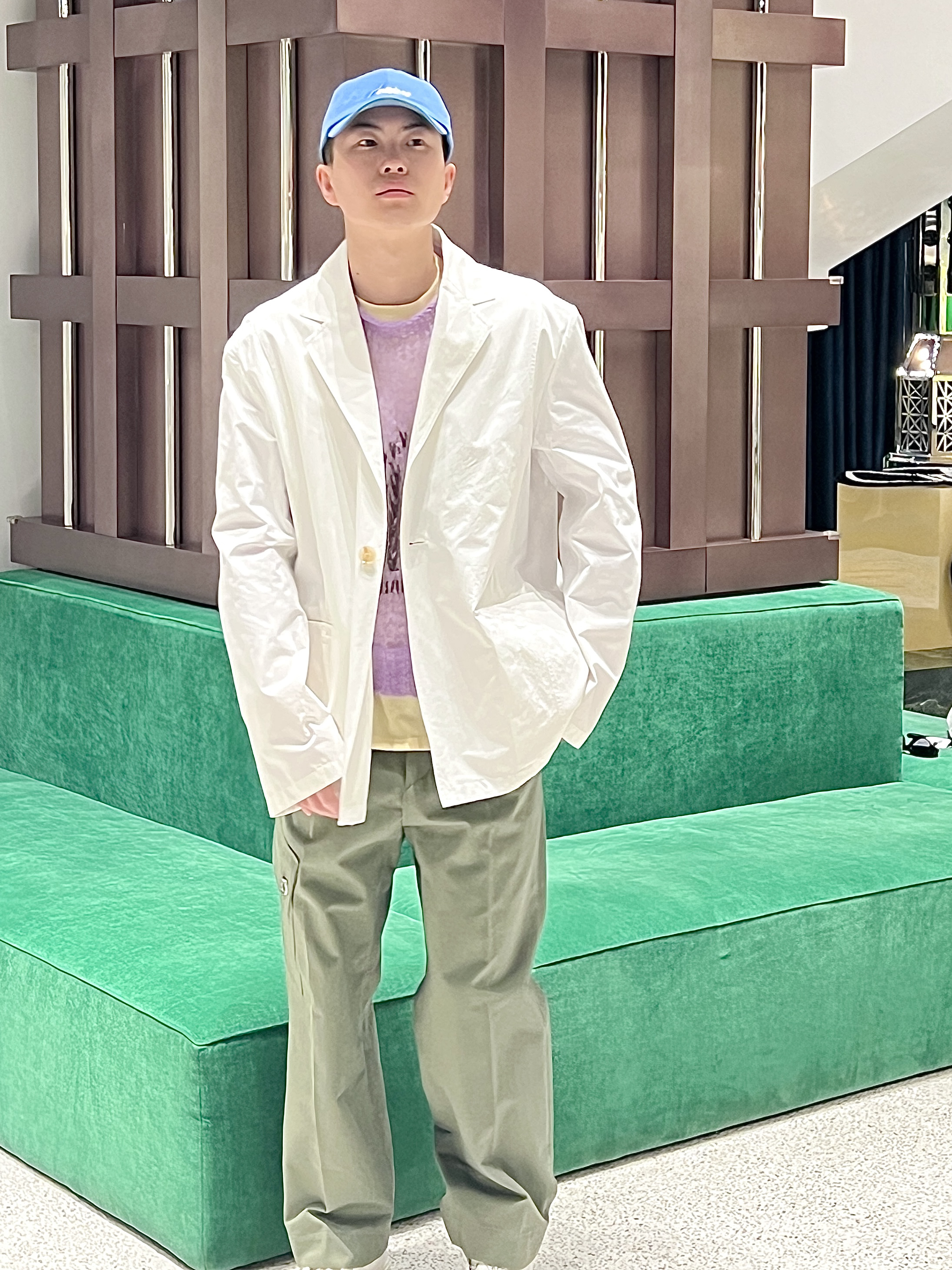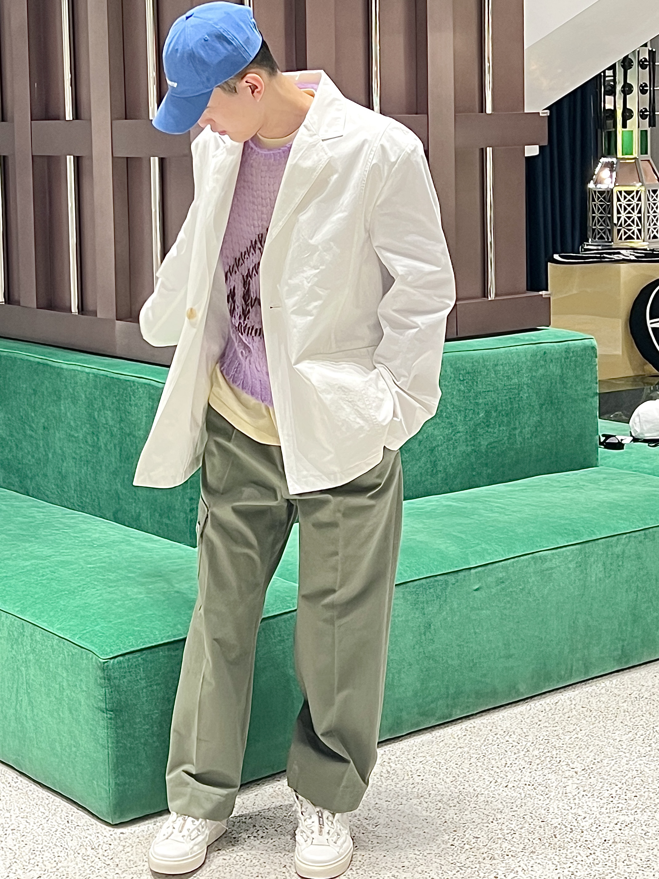 身高|体重:178/140 🧍♂️ 穿搭风格:西服外套穿搭 👔 上衣:白色西服外套 👖 下装:绿色裤子 👟 鞋子:板鞋 🎒配饰:帽子
