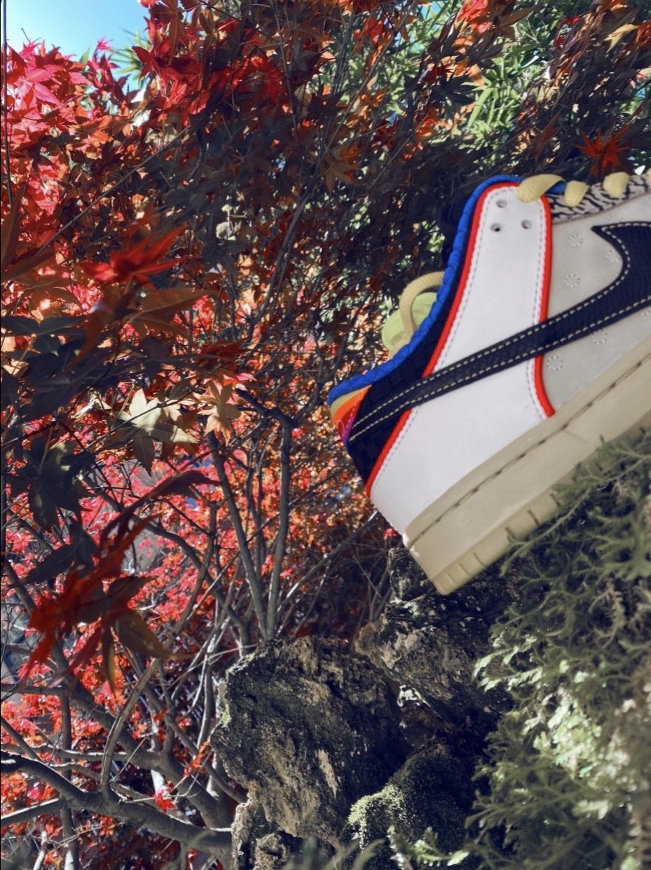 🎨鞋身部分(鞋腰➕swoosh➕鞋跟overlay)✨外侧鞋身:鞋腰采用的是白色麻布织物材质,鞋带孔处采用的黑色麂皮绒布料,鞋跟部分,采用个性鲜明的不同底色爆裂纹,swoosh方面采用的是多彩渐变的漆皮,可谓细节丰富。