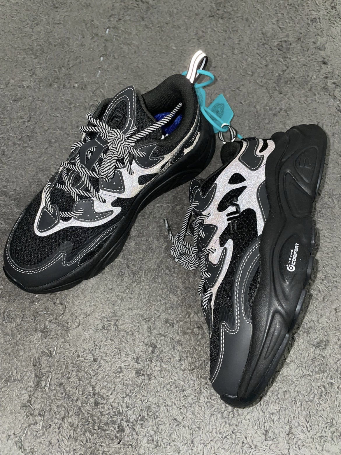 这双斐乐的老爹鞋真的一眼心动💓 鞋面采用圈状针织拼接鞋面 穿起来真的不要太舒服!!! 鞋面还有不规则全反光热熔膜 夜间灯光照耀下真的超级炫酷👍 还特别增高显腿长!而且真的特别百搭! 各种裤子都可以搭配!!!