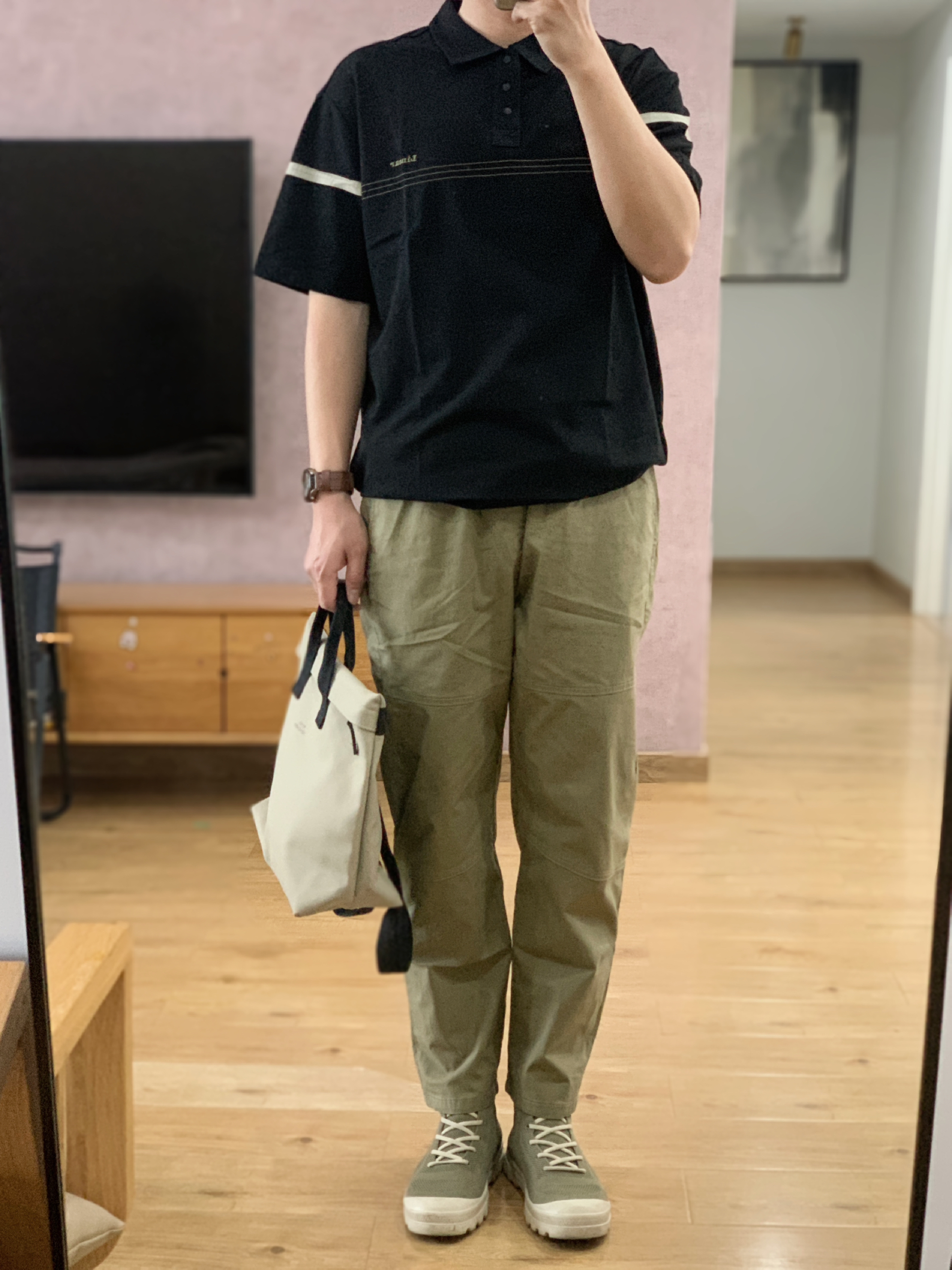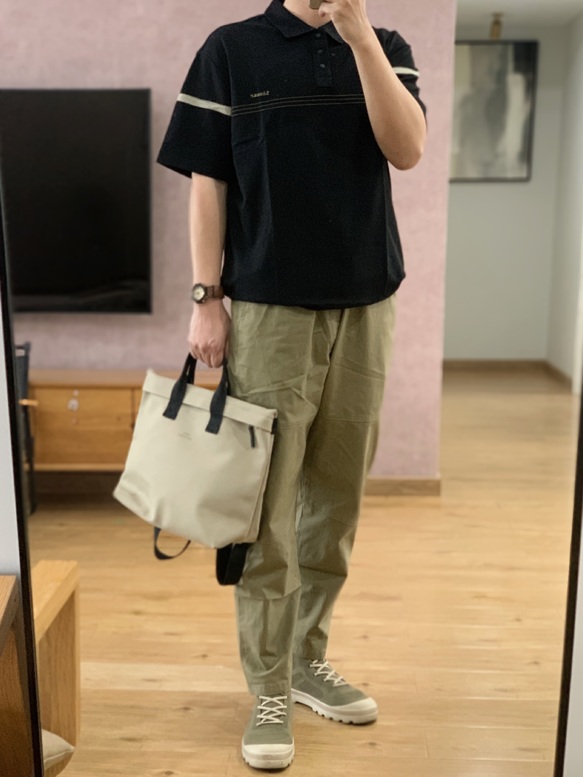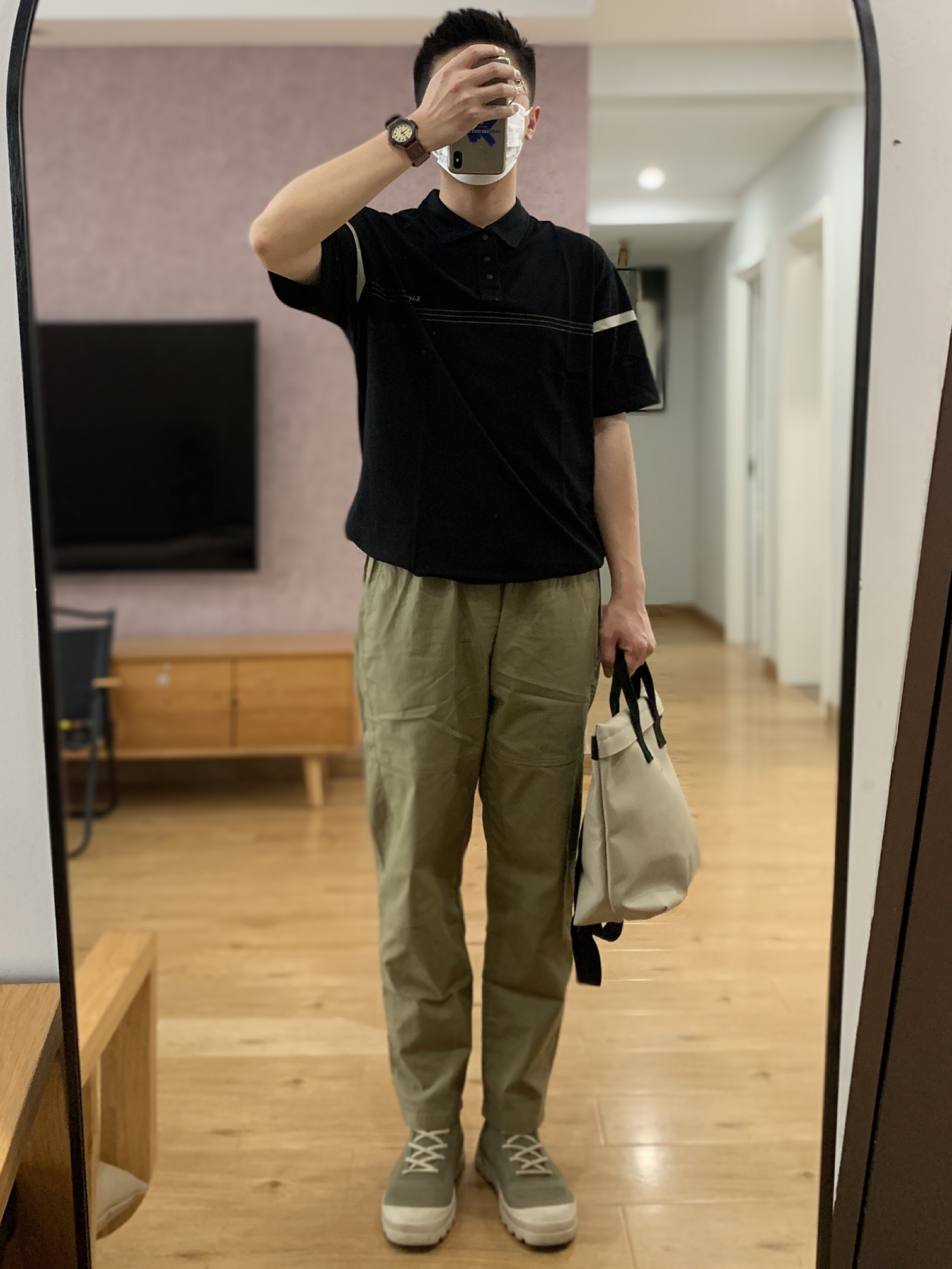 😘hey 这里是每天记录穿搭的社畜日记 📏合身版型的polo衫 微锥的休闲裤更加利落 🎨三色穿搭:黑色+卡其+军绿 整体配色 低调内敛适合通勤 🤔穿搭巧思 卡其裤子跟军绿色的鞋子去搭配黑色polo 同时颜色也呼应了上衣拼的卡其色 手表选择相同色系的森林人 背包也是卡其色的手提包(好爱这个包) 黑色polo+卡其休闲裤+军绿袜鞋 🙏以上都是我的个人拙见,欢迎交流讨论