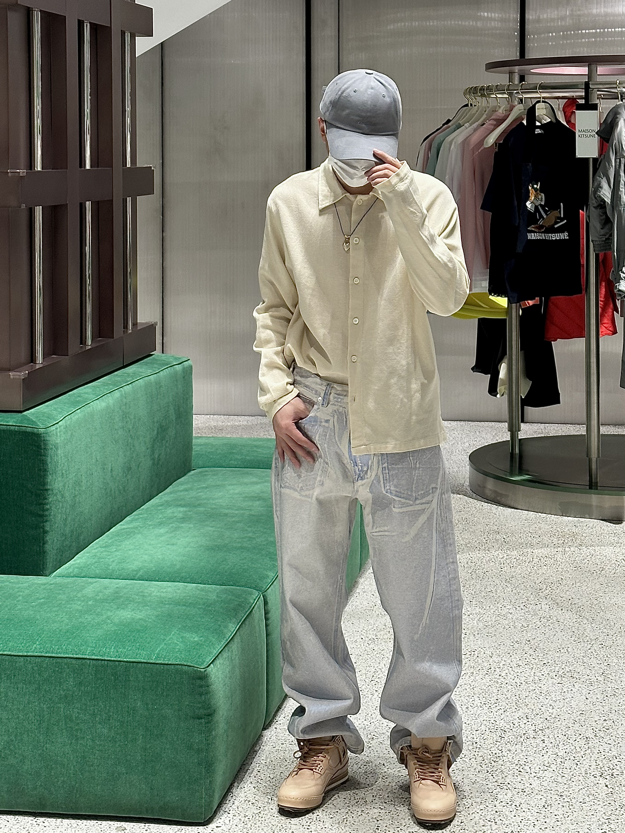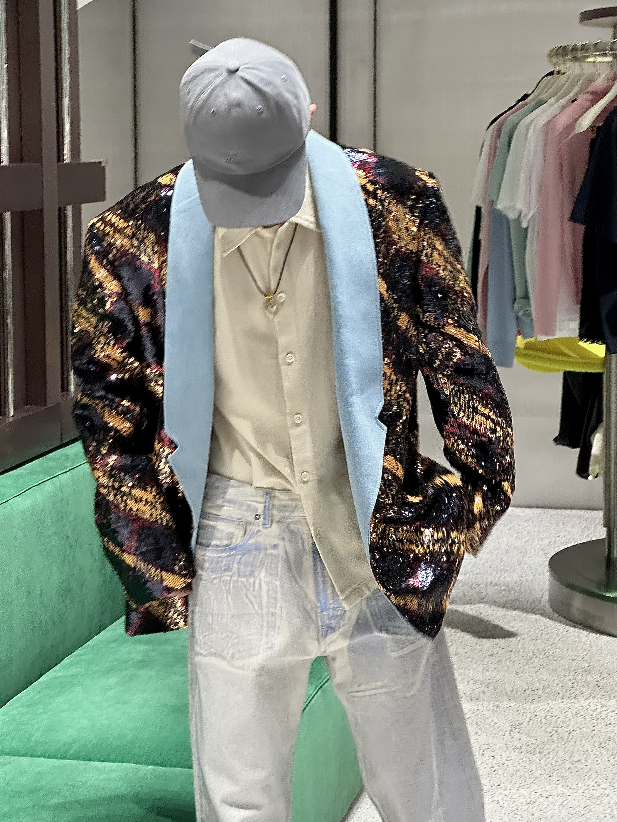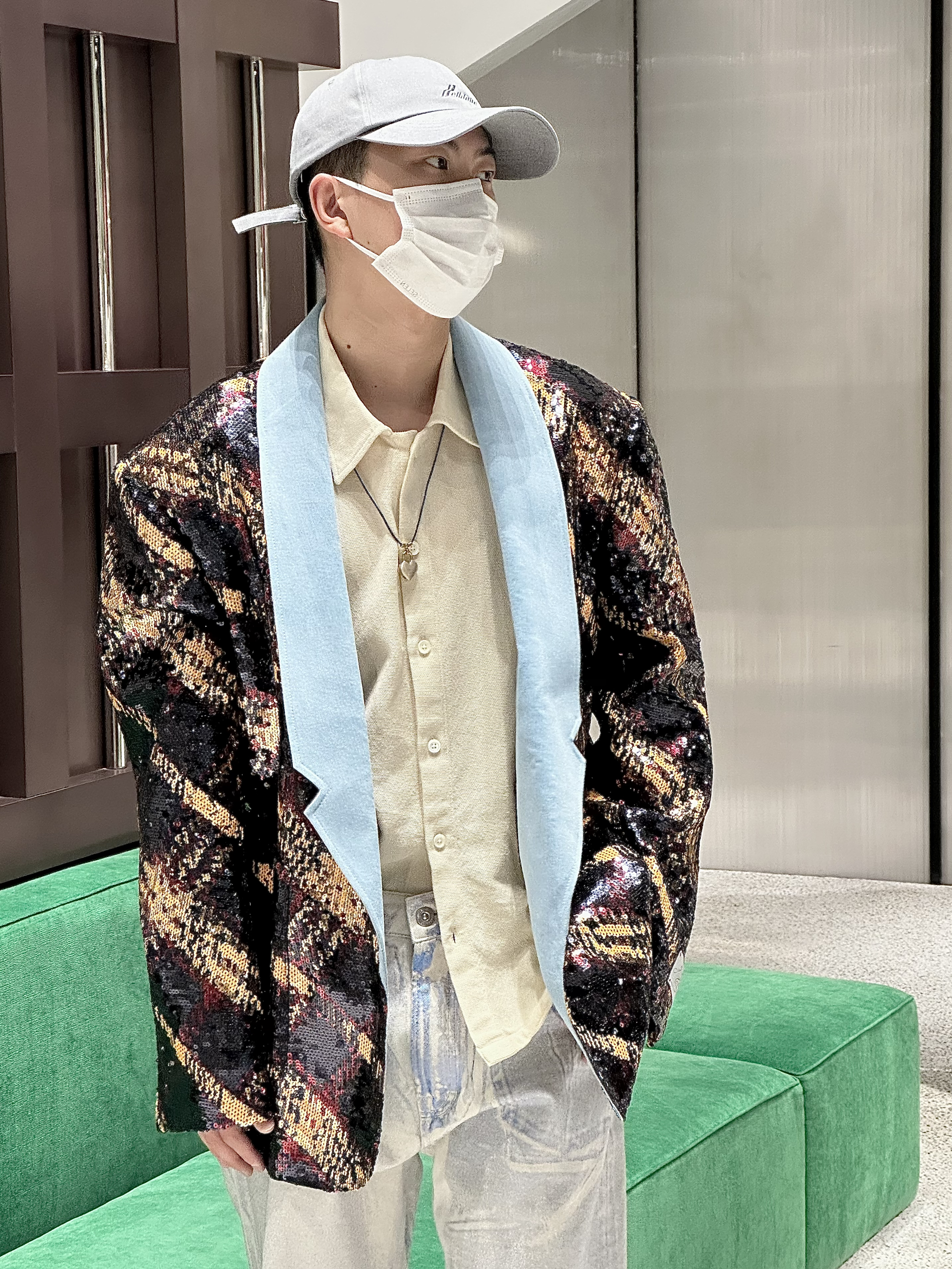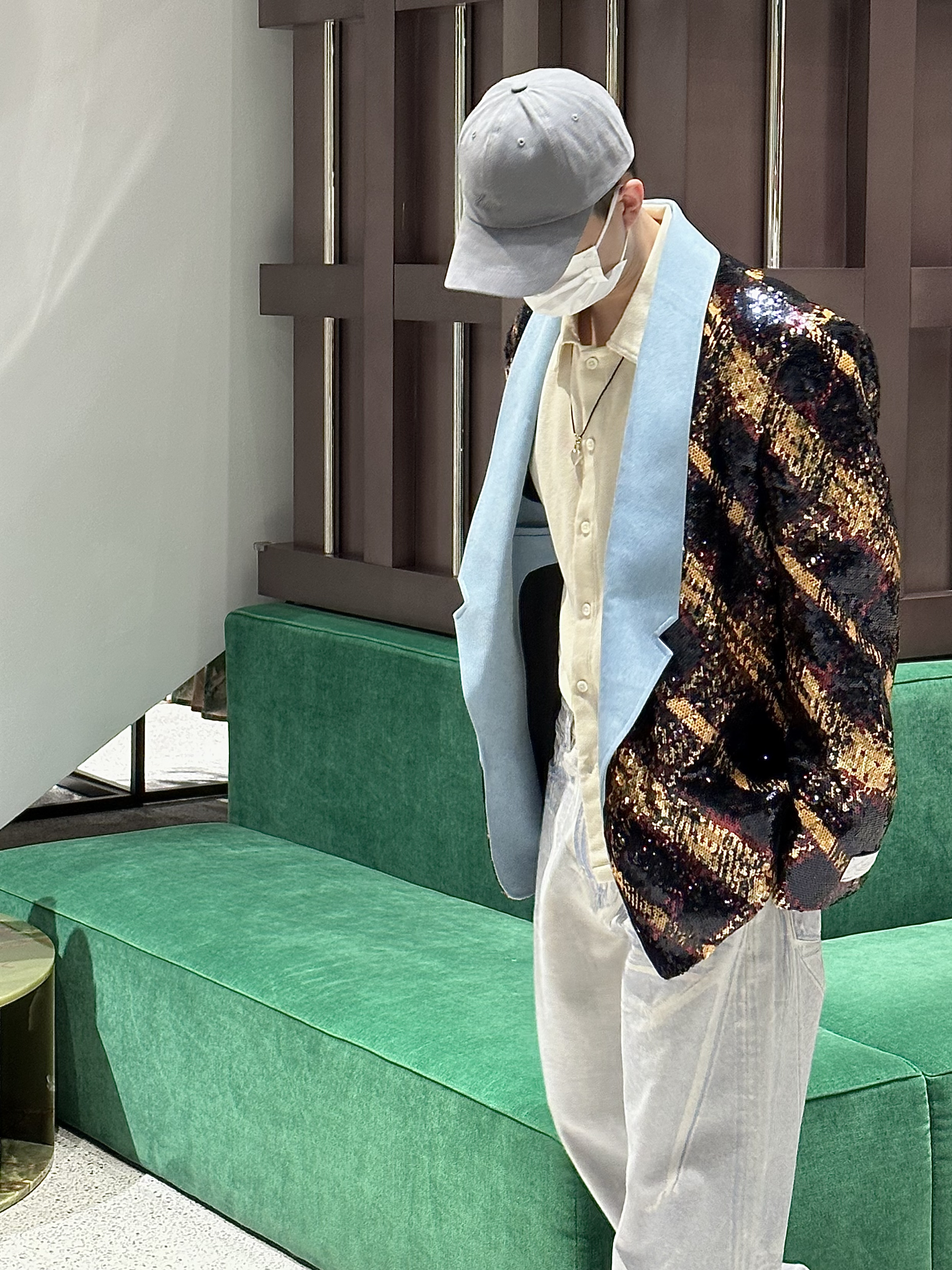 身高|体重:178/140 🧍♂️ 穿搭风格:华丽西装外套风格 👔 上衣:亮闪闪西装外套 👖 下装:牛仔裤 👟 鞋子:板鞋 🎒配饰:帽子灰色