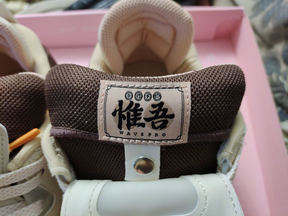 第二双惟吾pro,女朋友送的😆 细节实在是比我那双翠绿色的好太多了。 亮点吧我觉得有鞋舌和logo 鞋舌上的盖子是一块半透明的,鞋舌前边写的“手作冰粉”,后边写的“匠心手作”。 logo里的液体刚开始让我觉得很新奇,不知道是什么设计元素,以为单纯只是一种创新设计,后来看到鞋舌上的手作冰粉,才知道可能是冰粉里的红糖水。 整体颜值真的很顶,值得入手。