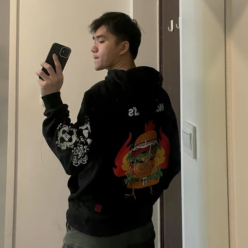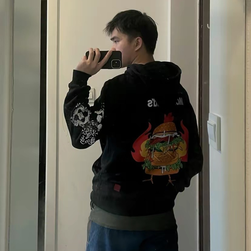 🍃挺喜欢背后的汉堡图案设计,除了袖子上的印花有 点拉胯整体还是ok的。卫衣真的很个性,同学都说很有意思! 🎍尺码建议:这件不算是宽松的卫衣版型,买比平时大一码更舒服。 (图来源于网络)