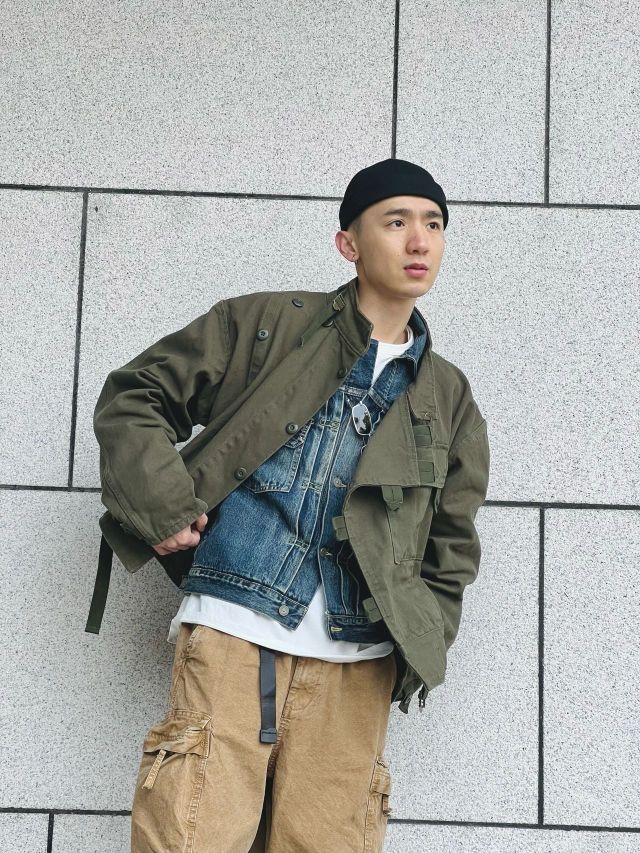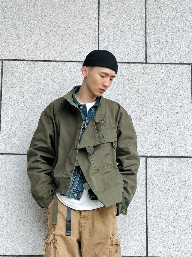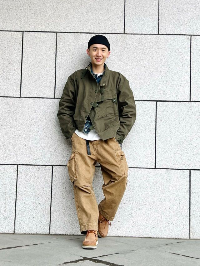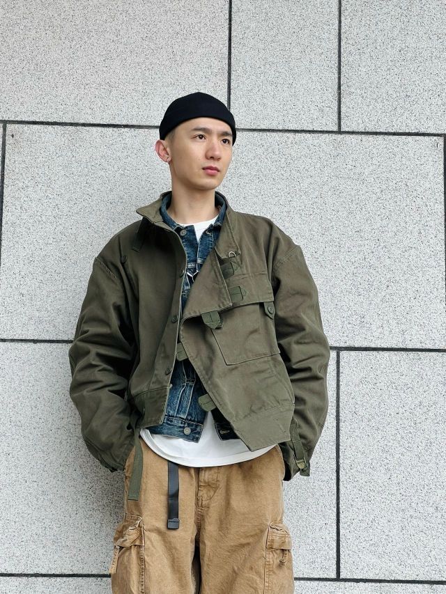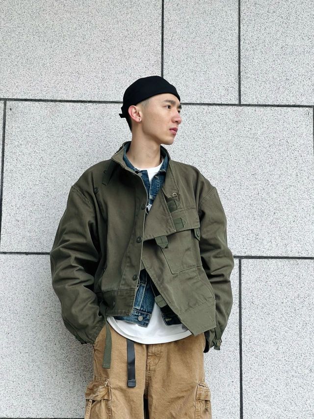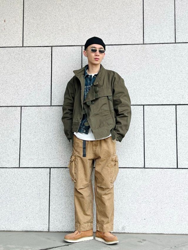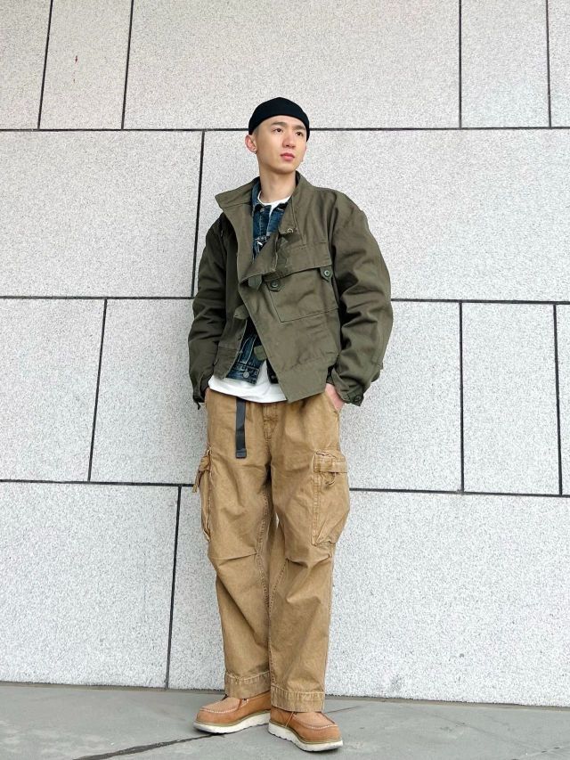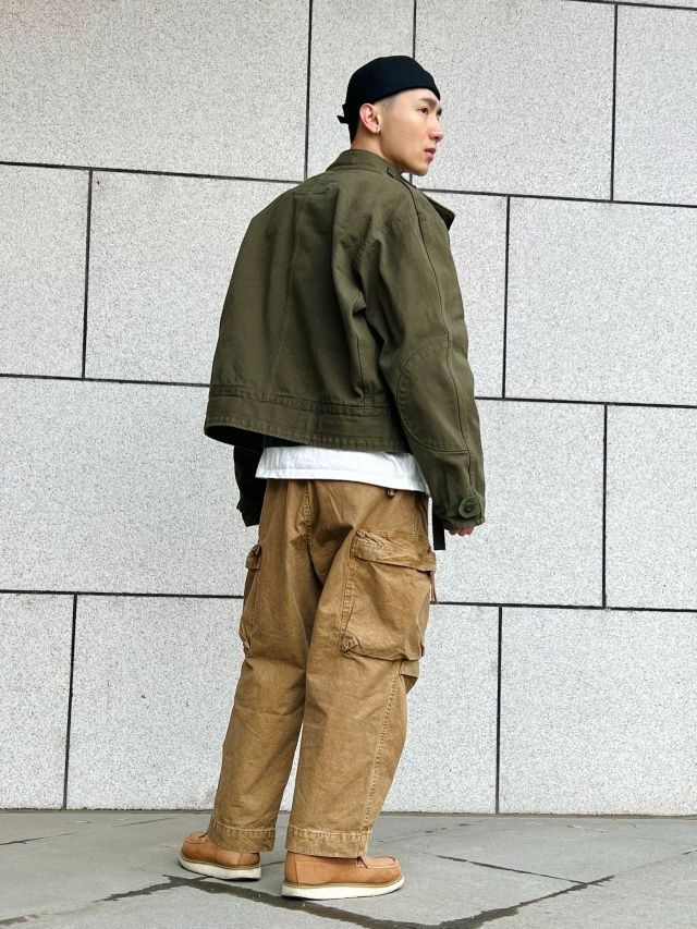 🌈此款上衣工装机车风格极为浓烈。款式以1960年代jun用机车夹克为原型。版型阔版不皱不塌。怎么穿怎么有型。此款夹克vintage爱好者几乎都爱不释手。运用其他的单品搭配会有更多不同的反响 🌈搭配夹克的为vintage户外工装阔腿裤。绿色和卡其相撞总能配的那么完美 🌈整体搭配偏美式vintage的工装机车街头风格,但配上一顶瓜皮帽也会有日系潮流工装风格的感觉出现。 🌈整体的搭配会偏硬汉风格,本人整...