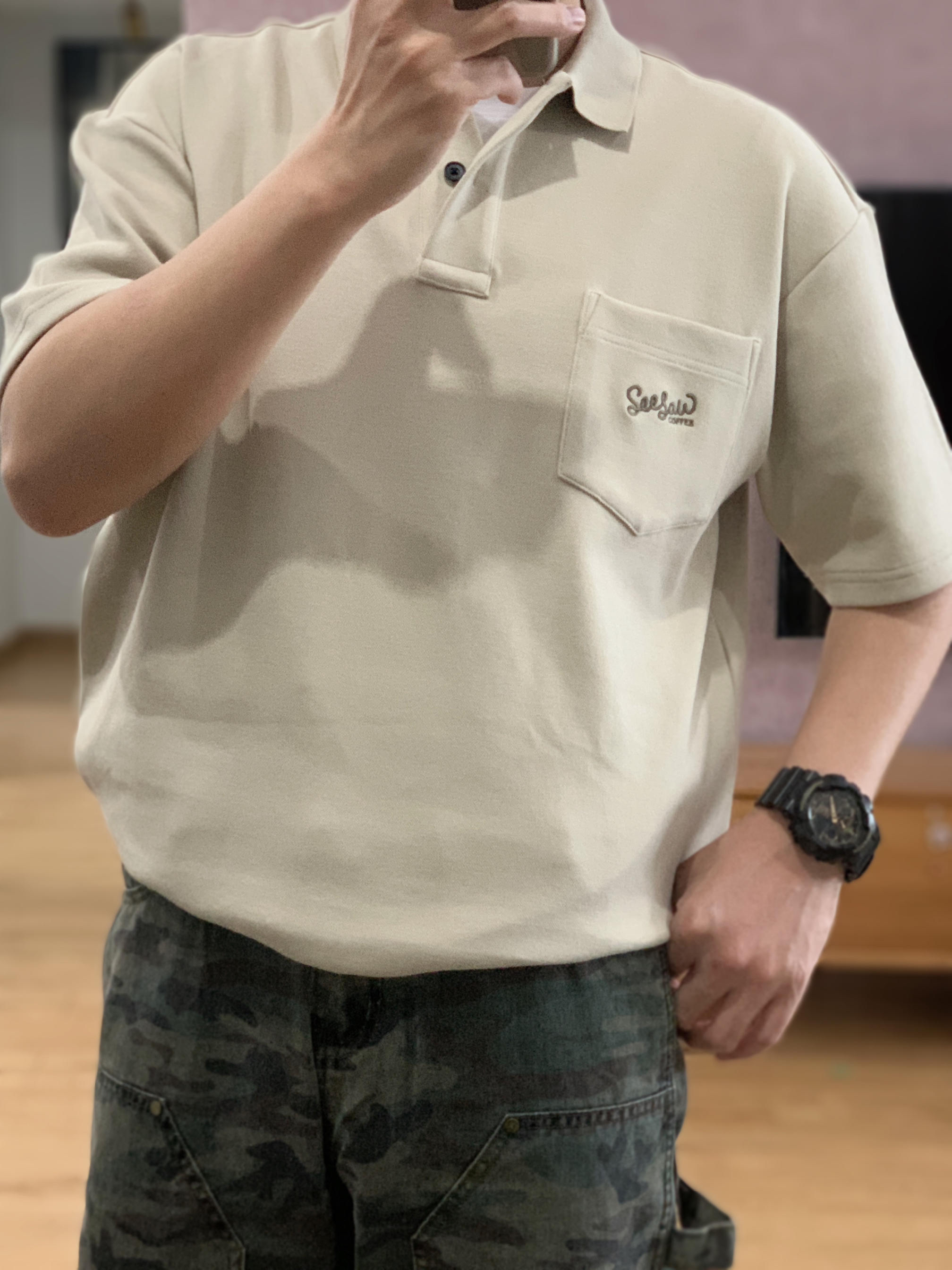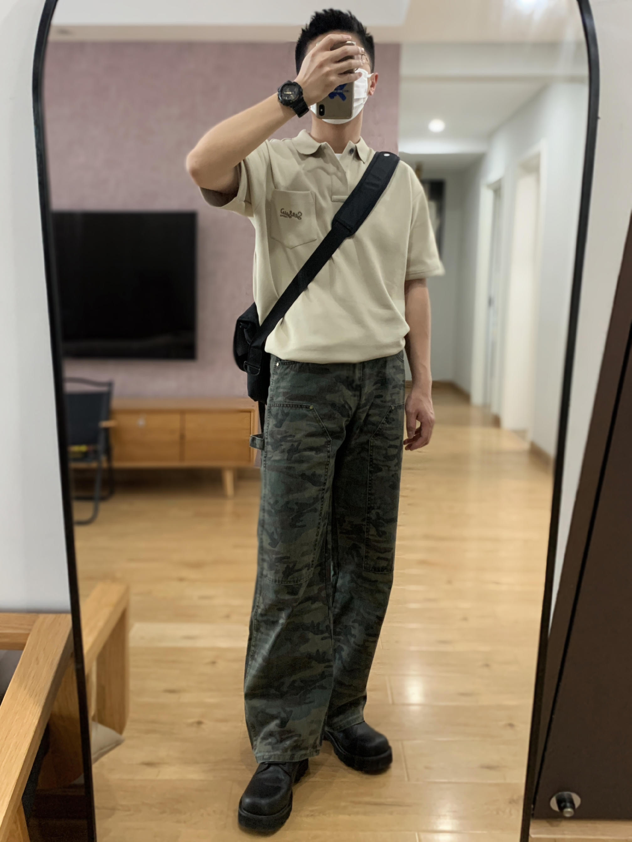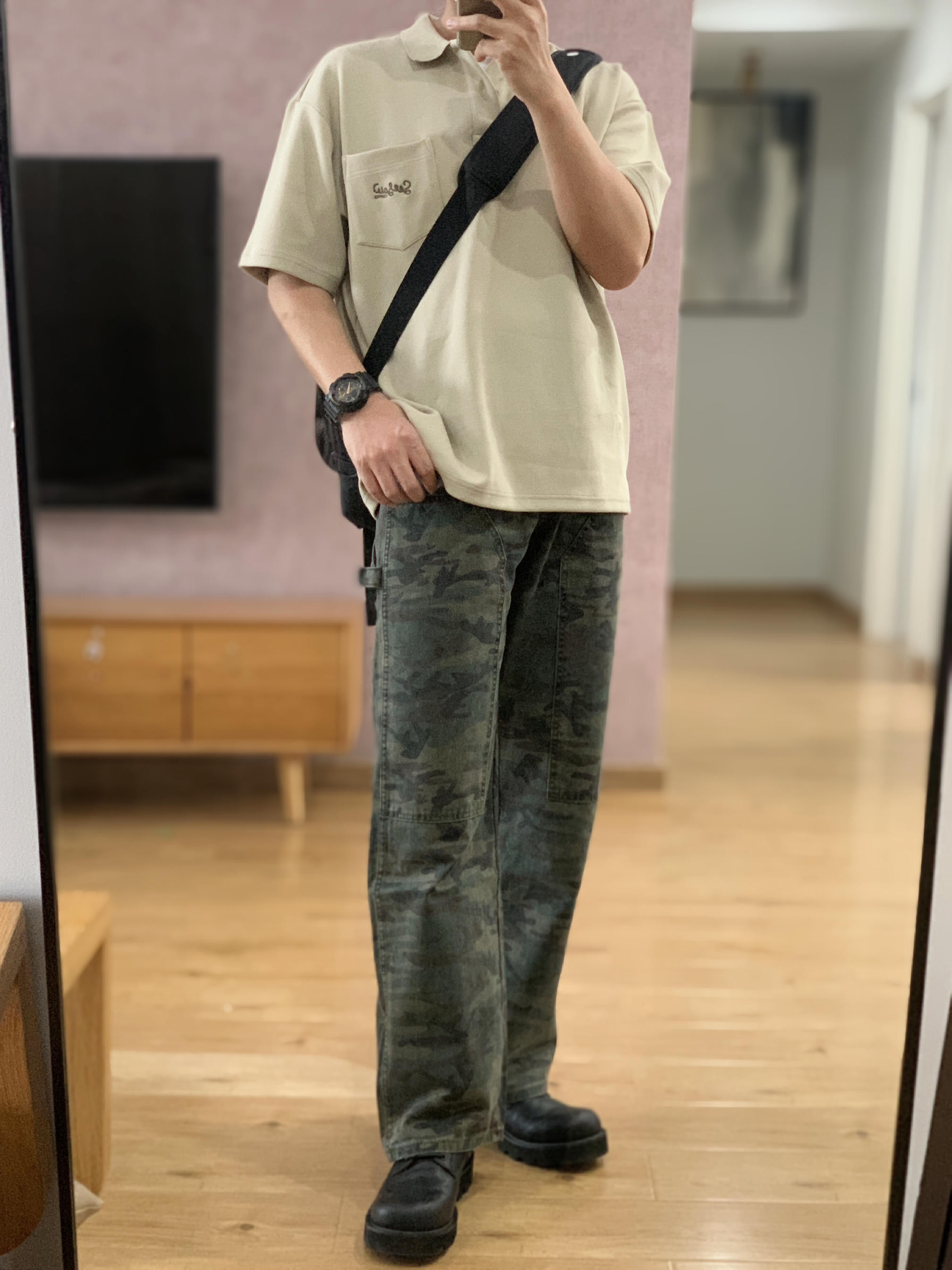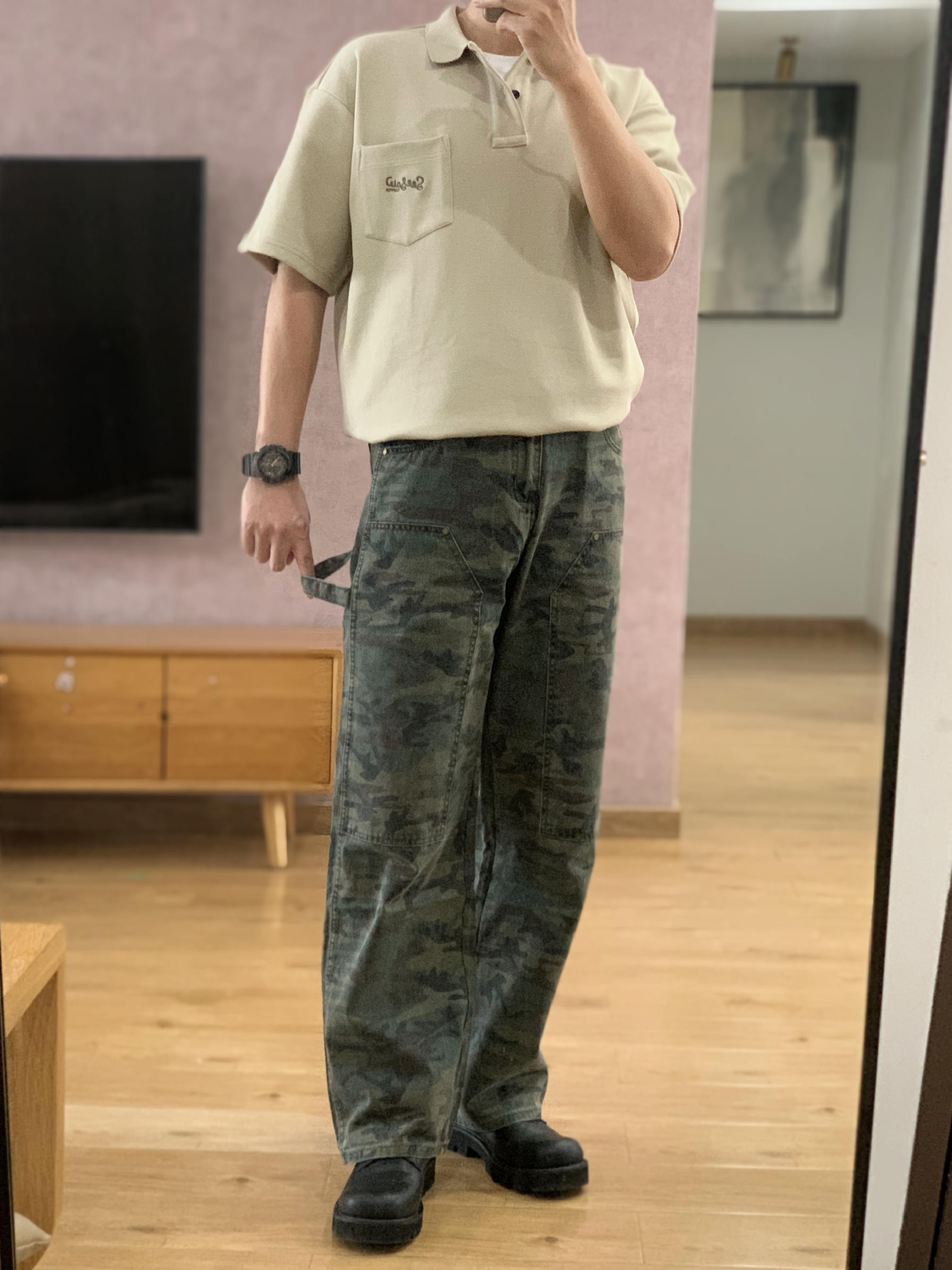 😘hey 这里是每天记录穿搭的社畜日记 📏微宽松的polo衫 内搭一件白色T恤打底 迷彩阔腿裤拿捏时尚感🤏 🎨迷彩色系:卡其+军绿+黑色 (今天用迷彩的三个颜色做色彩搭配) 🤔穿搭巧思 卡其色的polo衫,第一次跟迷彩裤做搭配。 鞋子选择一双黑色德比鞋,在通勤与休闲中反复横跳。 手表呼应迷彩裤选择一块迷彩拼黑色的gshock 再来一个黑色斜挎包 就主打一个可甜可盐🙈 卡其polo衫+迷彩阔腿裤+德...