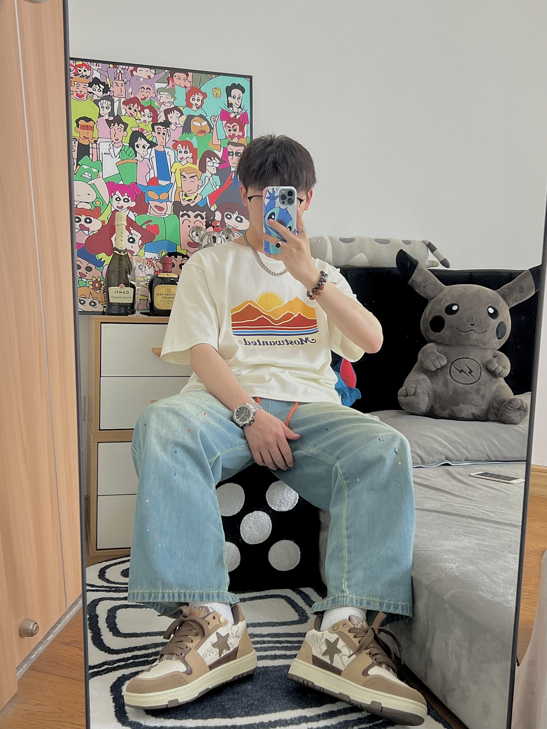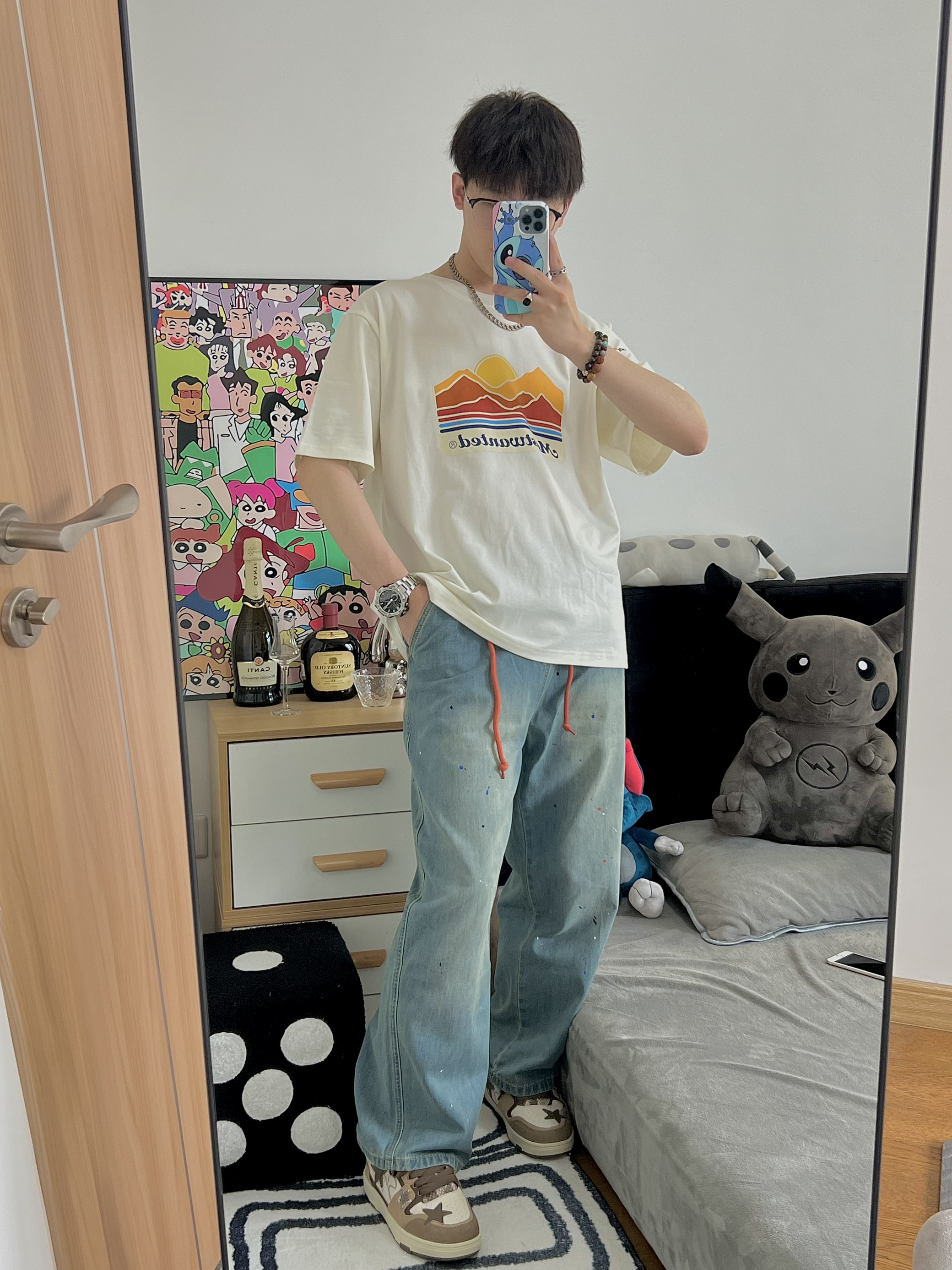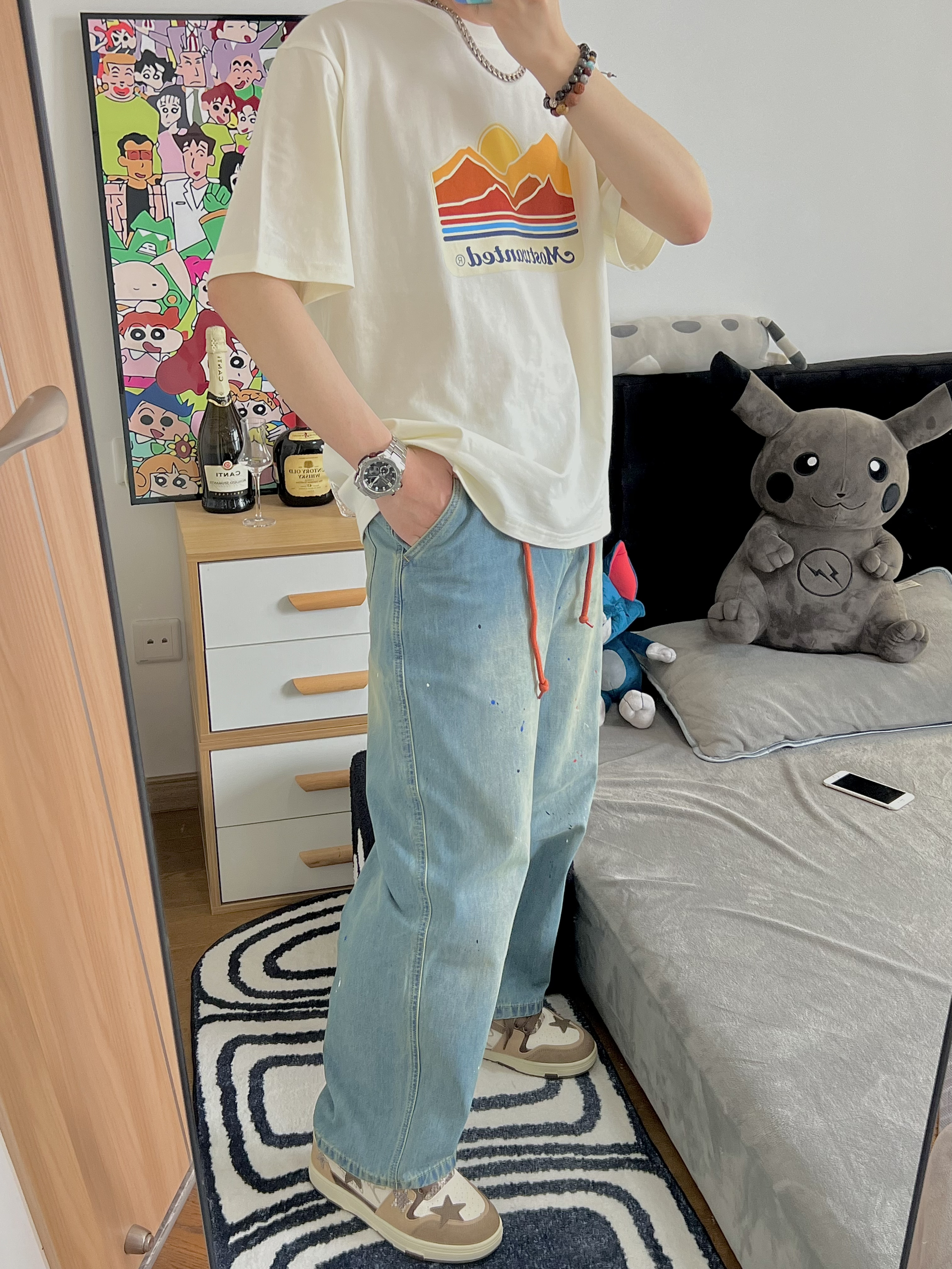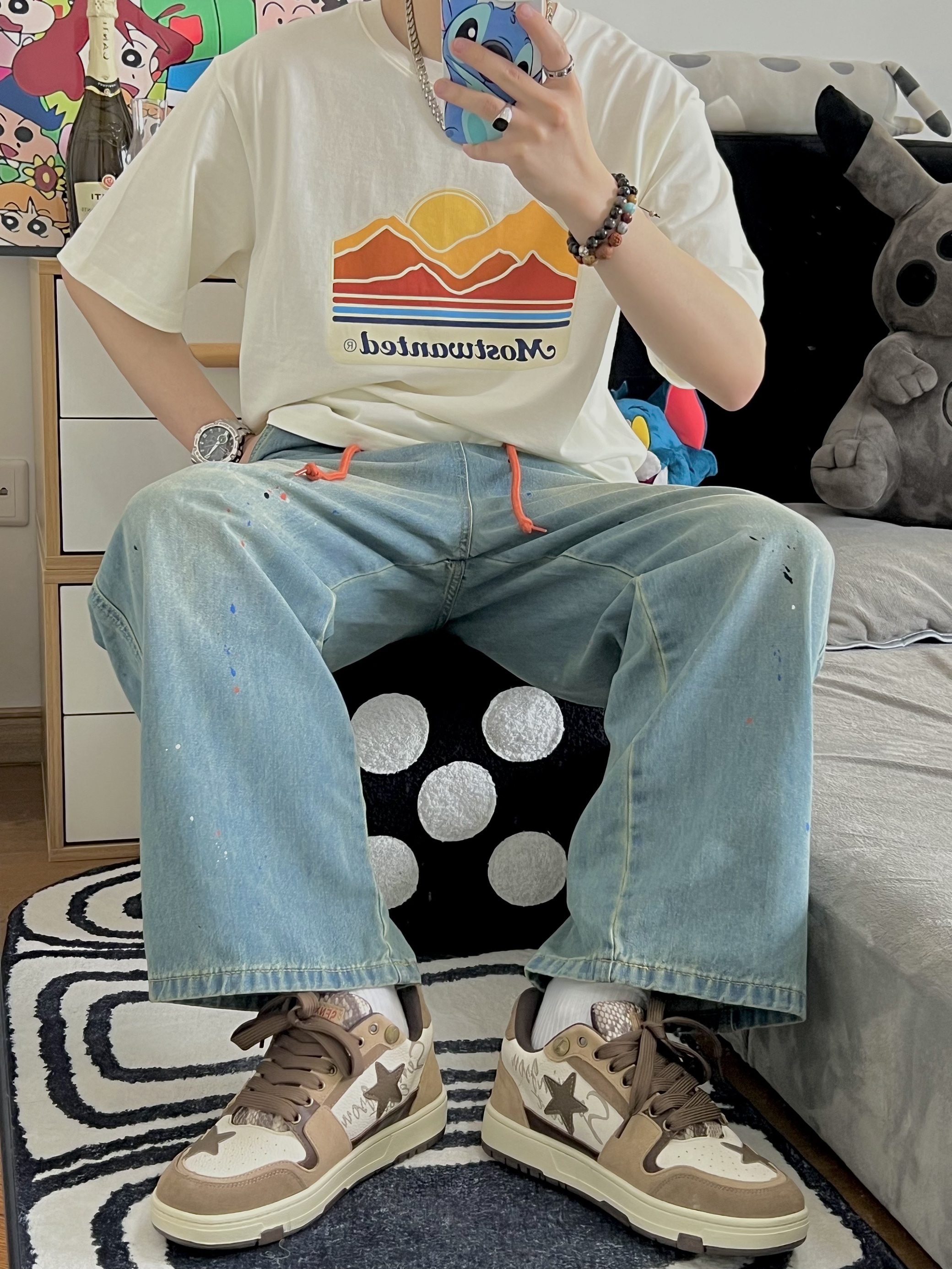 🔅我是小新,每天给你分享不一样的穿搭! @元气小新不元气 176/64kg 上衣穿一件简单的风景T 面料柔软 穿着还是很舒服滴 T恤就是要越简单越大气 再搭配一条泼墨牛仔裤 牛仔裤的两条橘色的带子 恰好和衣服的落日🌅上下呼应 最后搭配一双王鹤棣同款棕色的星星鞋✨ 我用这一套日系风穿搭来开启这个夏天 冲呀 夏日我来啦! 👕: MostwantedLab 【 L - 宽松 】 👖: Most...