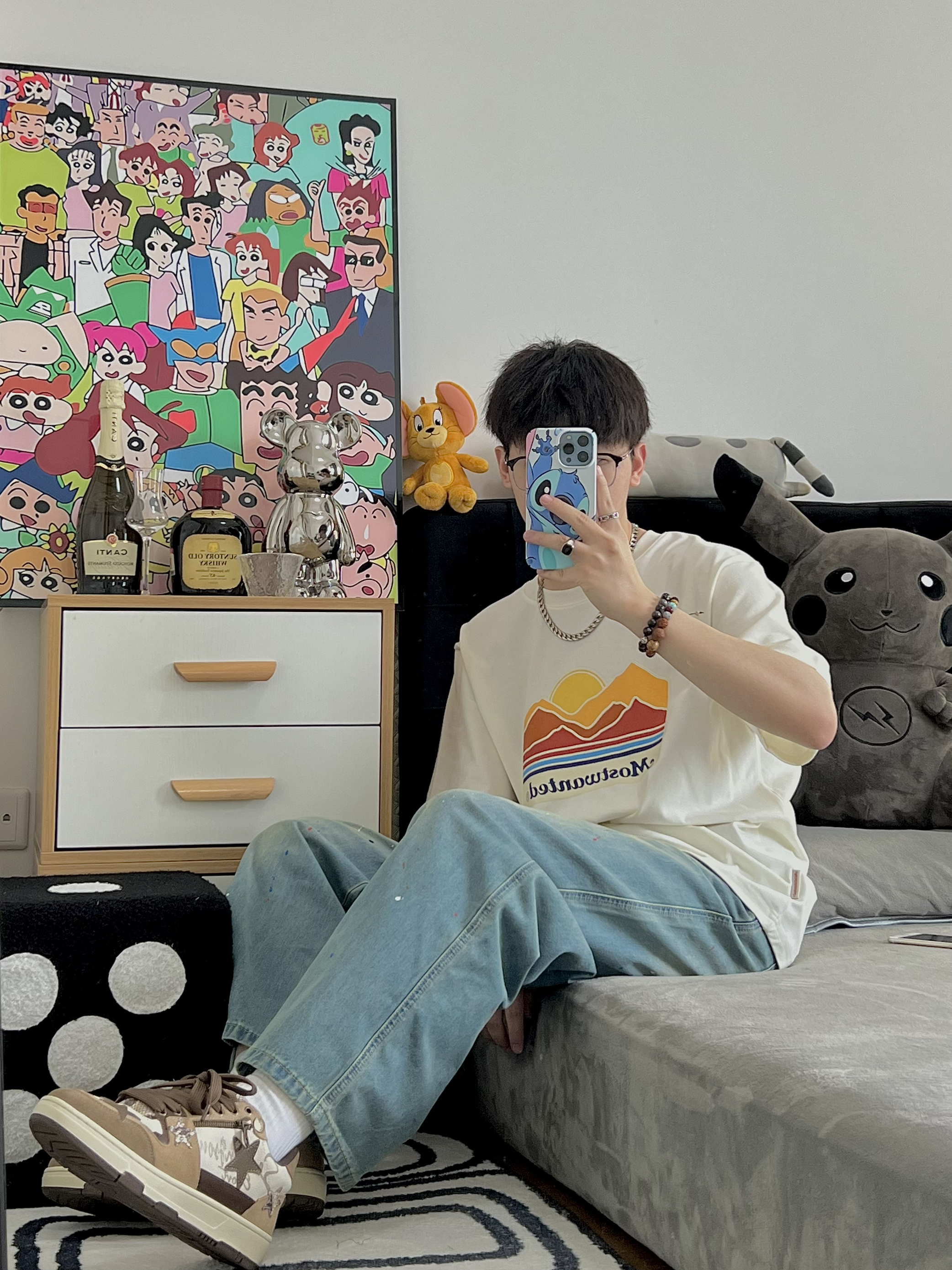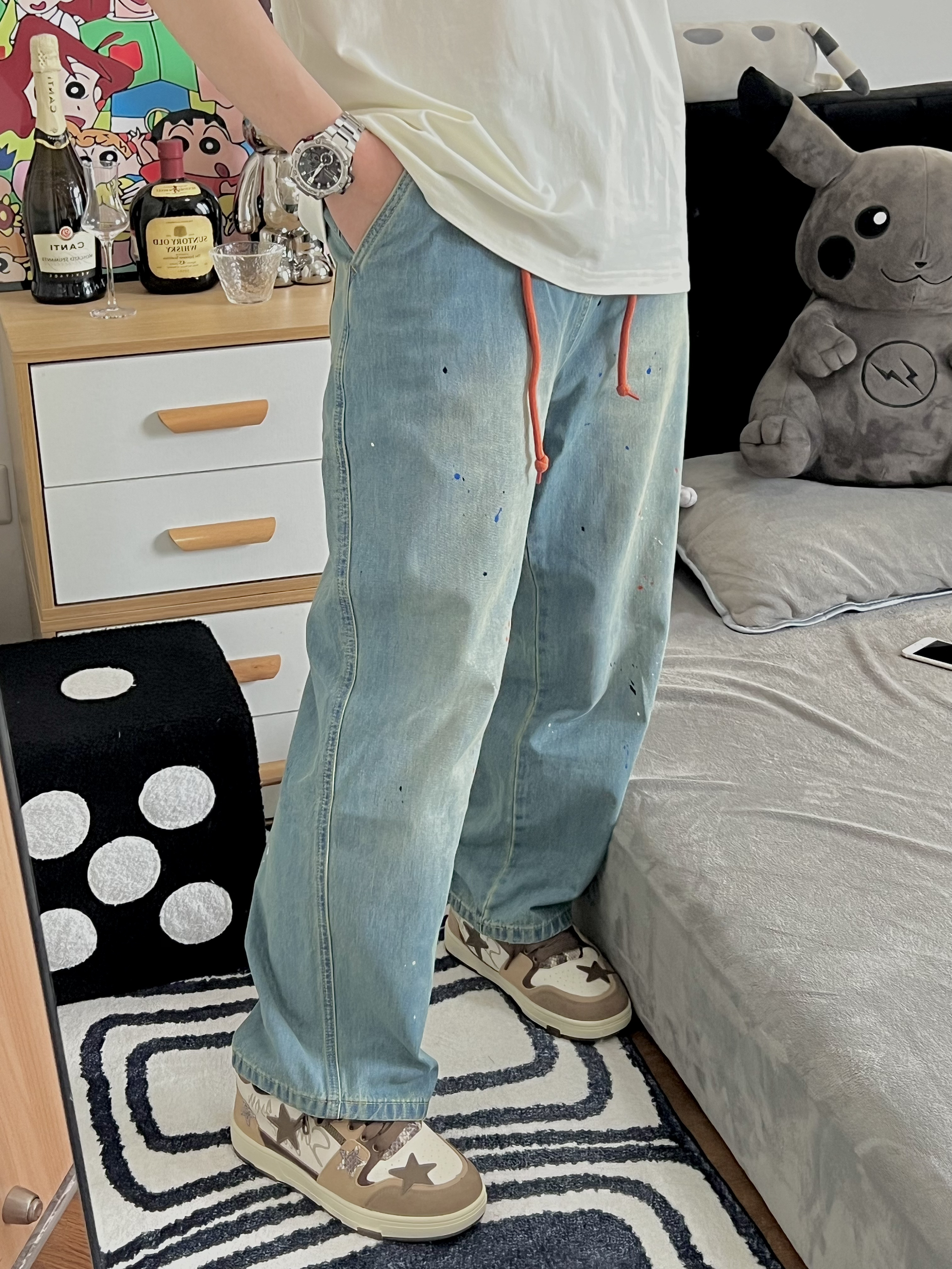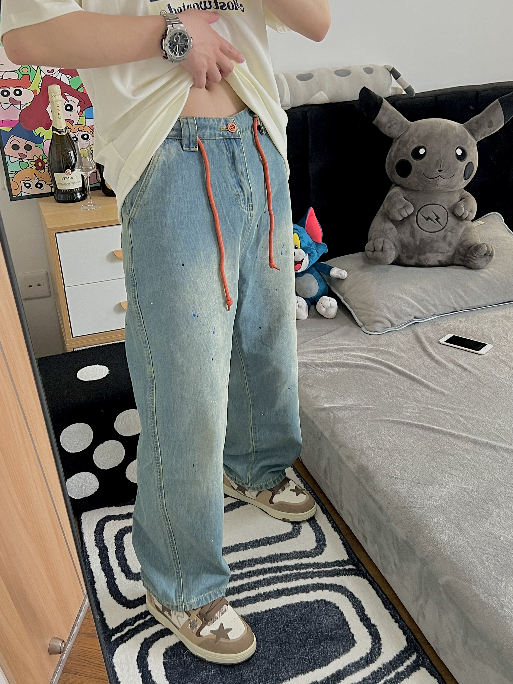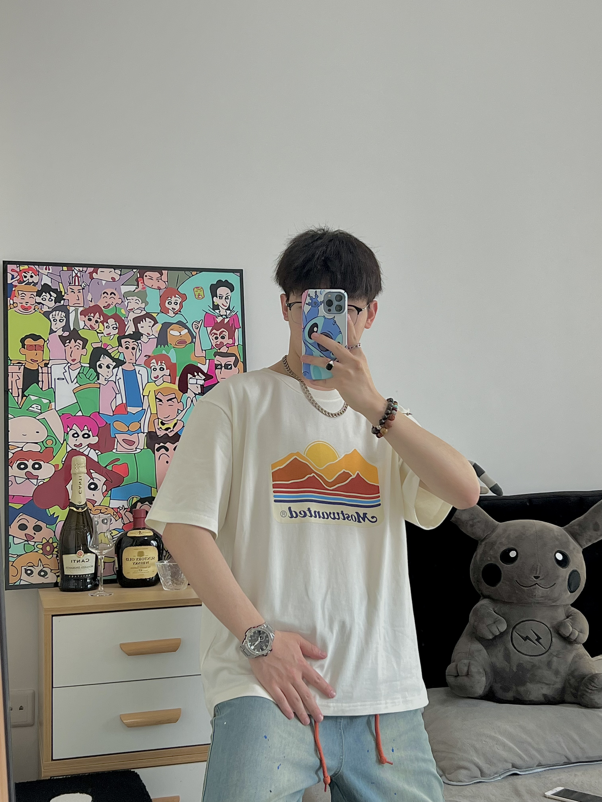 🔅我是小新,每天给你分享不一样的穿搭! @元气小新不元气 176/64kg 上衣穿一件简单的风景T 面料柔软 穿着还是很舒服滴 T恤就是要越简单越大气 再搭配一条泼墨牛仔裤 牛仔裤的两条橘色的带子 恰好和衣服的落日🌅上下呼应 最后搭配一双王鹤棣同款棕色的星星鞋✨ 我用这一套日系风穿搭来开启这个夏天 冲呀 夏日我来啦! 👕: MostwantedLab 【 L - 宽松 】 👖: Most...
