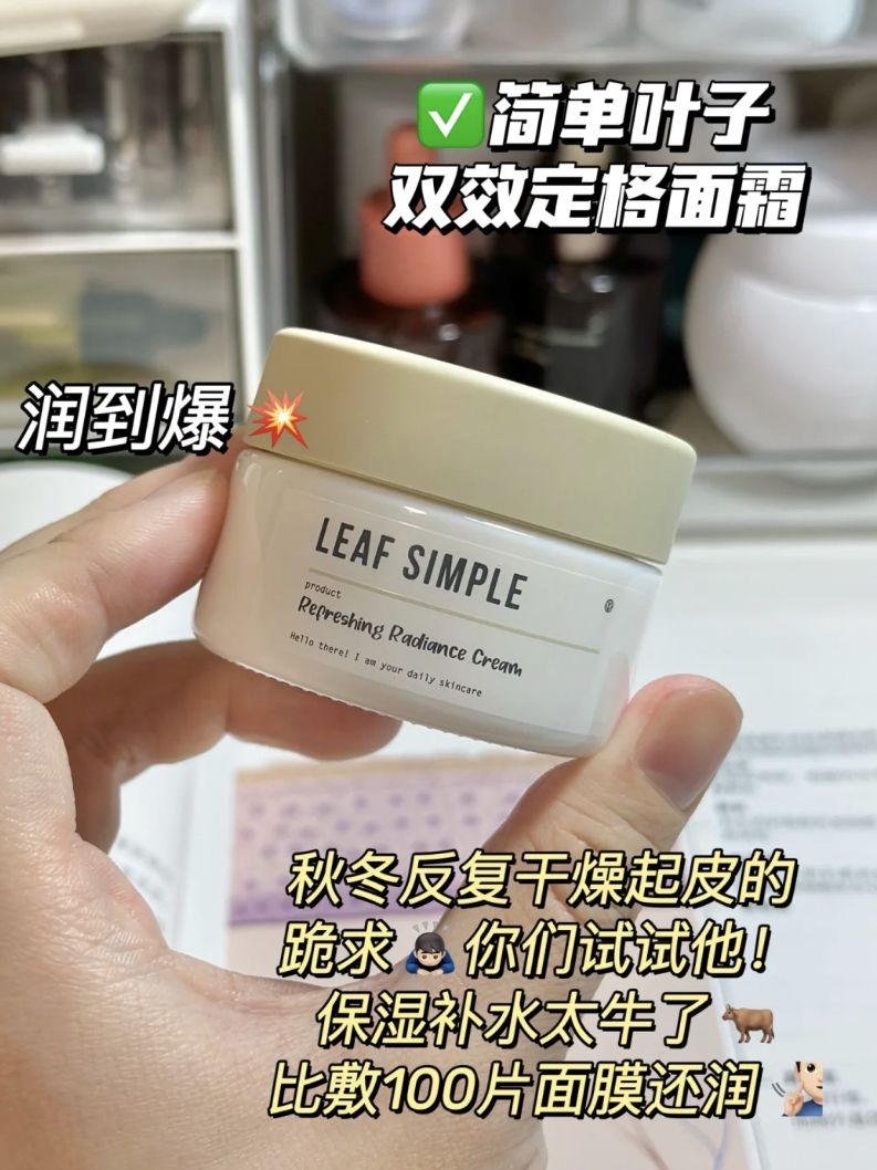💧一到冬天皮肤就自动从混油火速变成混干了 每天晚上回家皮肤都感觉被抽干了水分一样 反复干燥爆皮还泛红!脸干!痒!红!全占了 满敷了几百片面膜还是润不住干涸的皮肤 得亏被干皮姐妹按头安利了这个 简单叶子双效定格面霜 保湿强也就算了关键是化妆用什么卡粉起皮都没有了 💧面霜妆前二合一,真的巨划算!火速被种草下单!! 用了小半个月我只能说简单叶子你太懂干皮了TT真!润到了骨子里!不管是空调房还是寒风吹多...