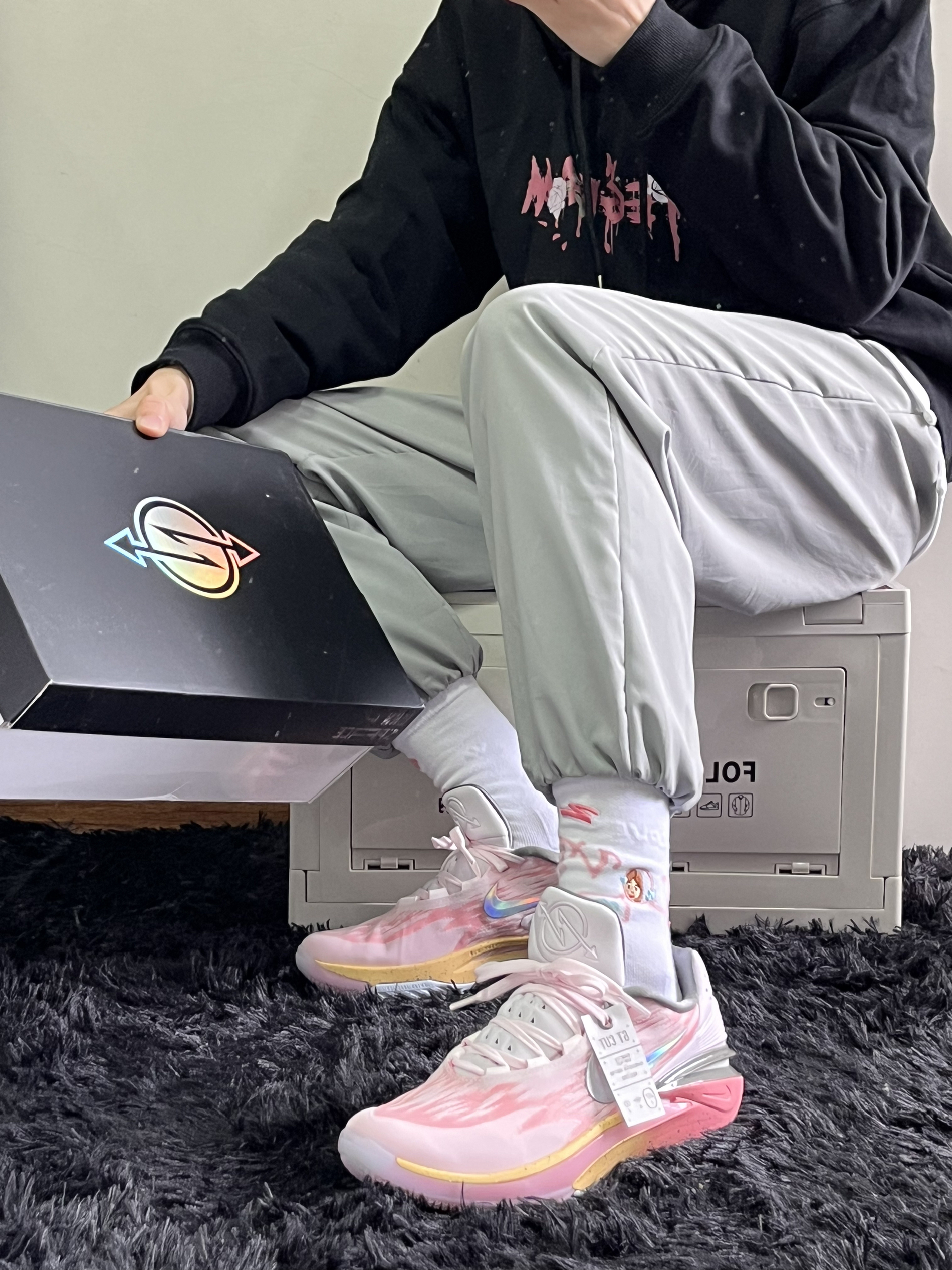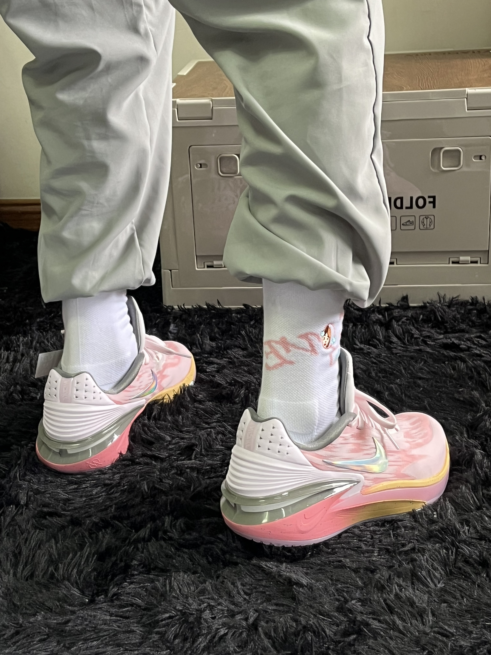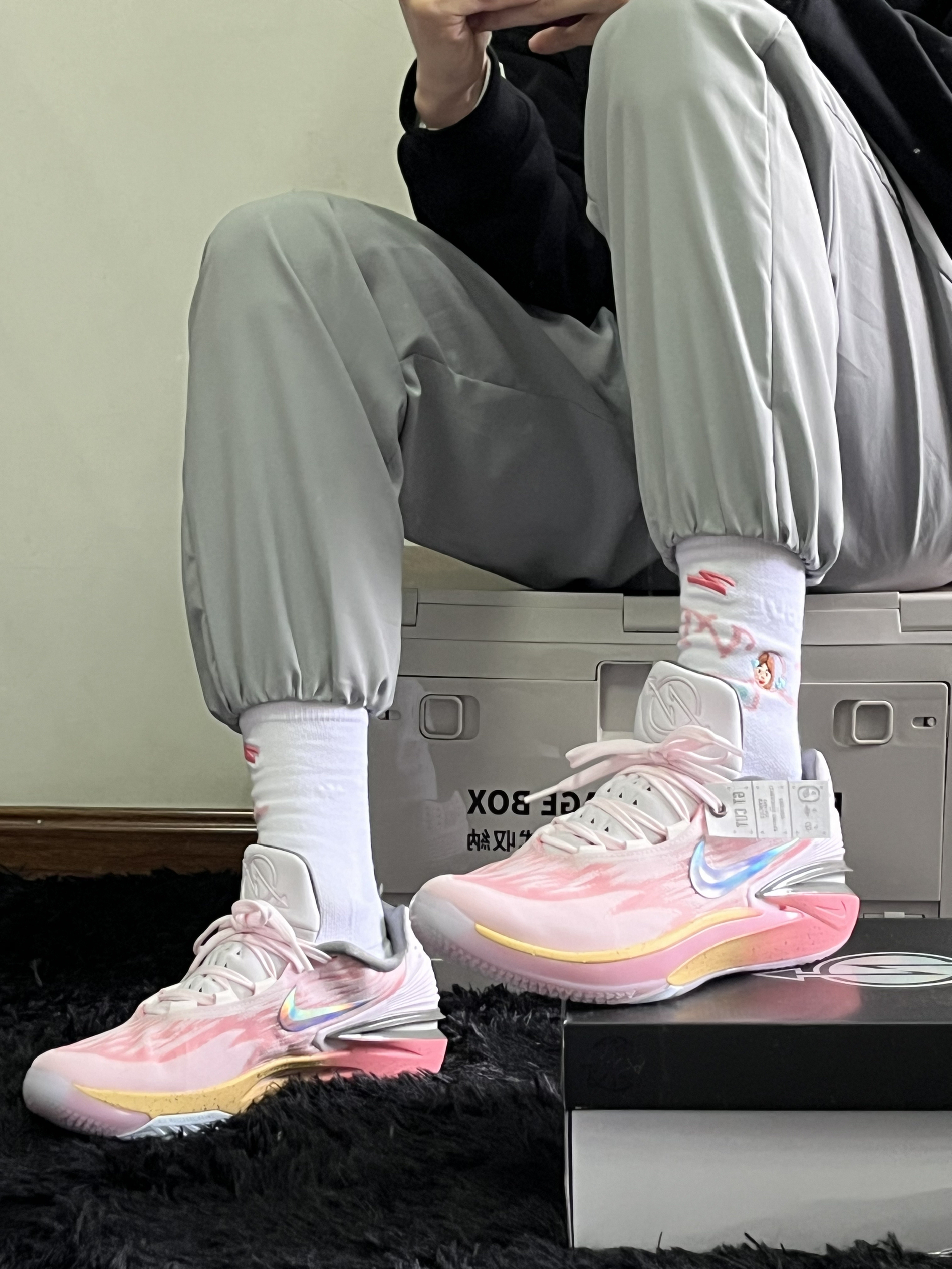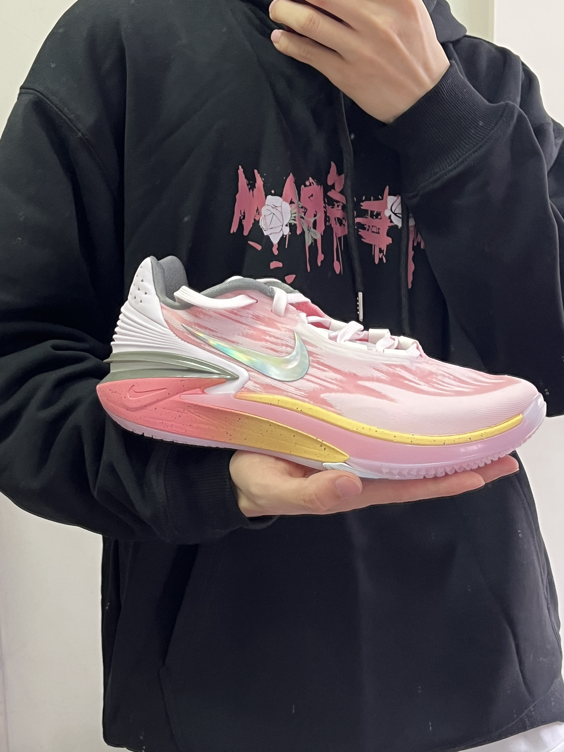 这双粉色嘎嘎好看 粉色涂装同时没有那么高调 无论是平时穿搭还是打球穿都很好看 上脚zoom反馈特别明显 大底颗粒也很深 耐磨不会太差 一双高颜值球鞋
