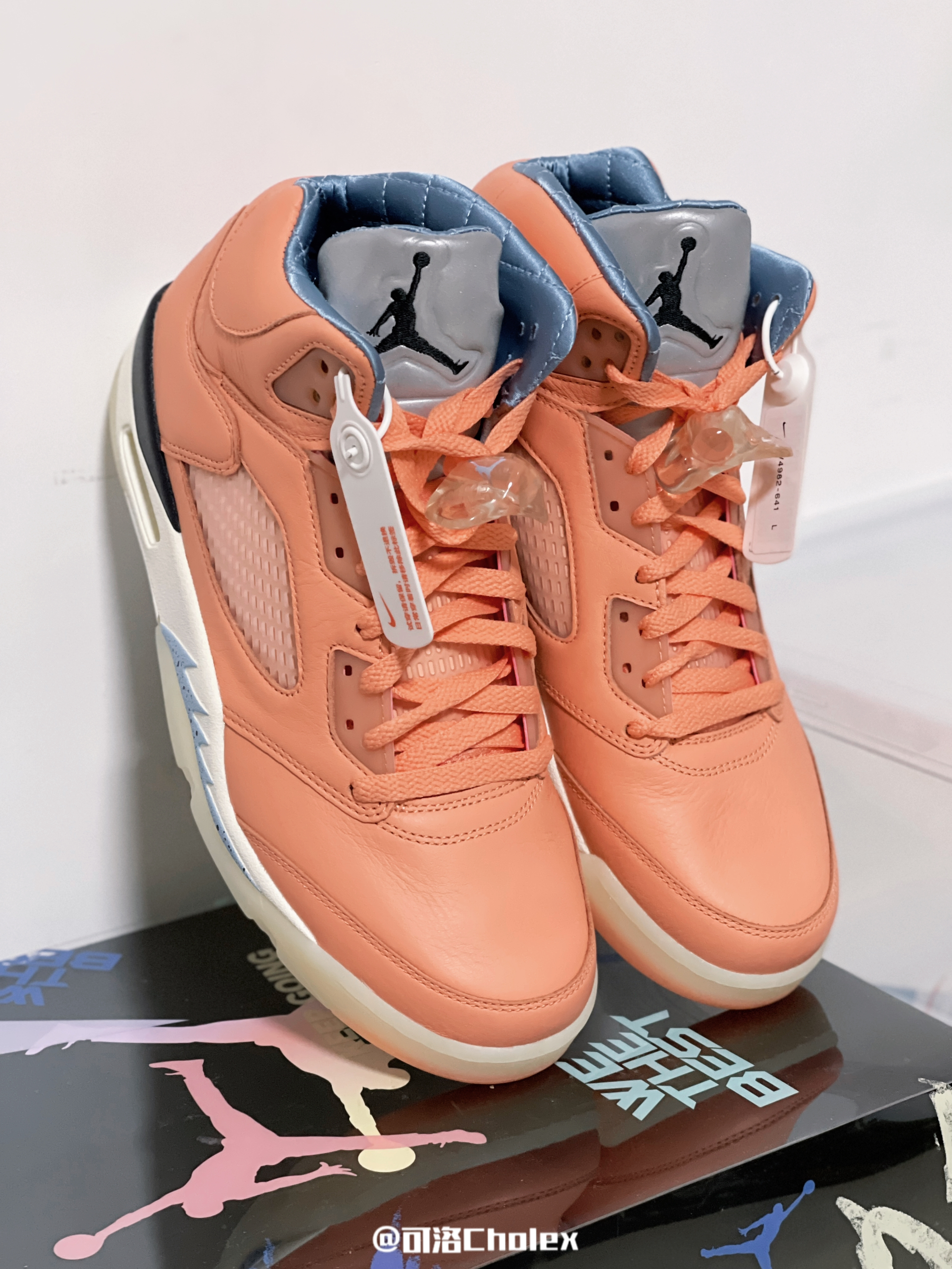 DJ Khaled✖️AJ5 细节满满,有点像火烈鸟的配色,鞋内衬采用了蓝色的菱形格的设计,有点小包包制作的工艺,皮质是光面,整体鞋垫也是鸳鸯的设计,鞋舌也是采用了3M反光材质! 鞋盒也是联名定制,鞋底也是重头戏,鸳鸯的图案更加突出了球鞋特别… 正常码购入即可,欢迎在评论区留言,关注我了解更多球鞋。