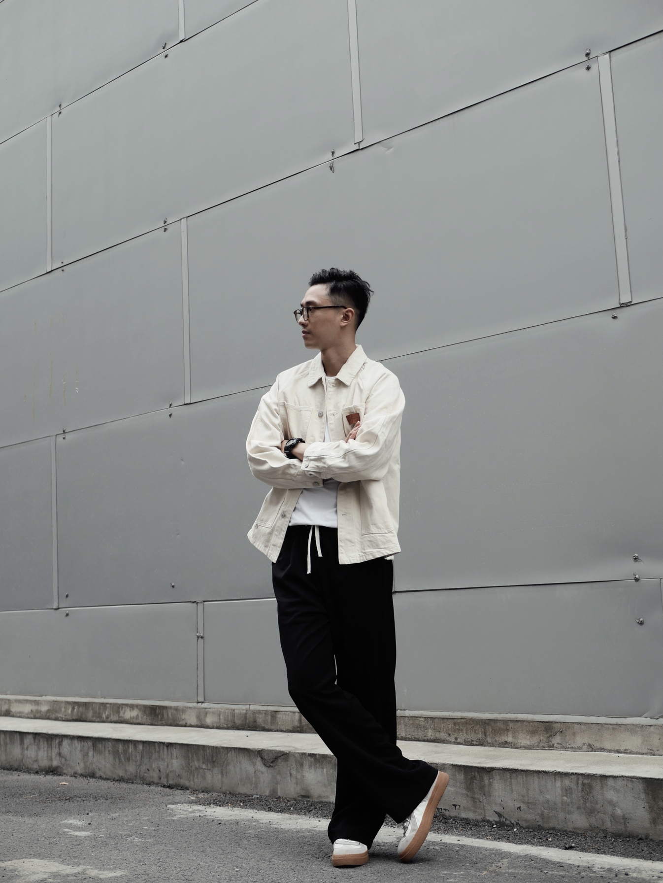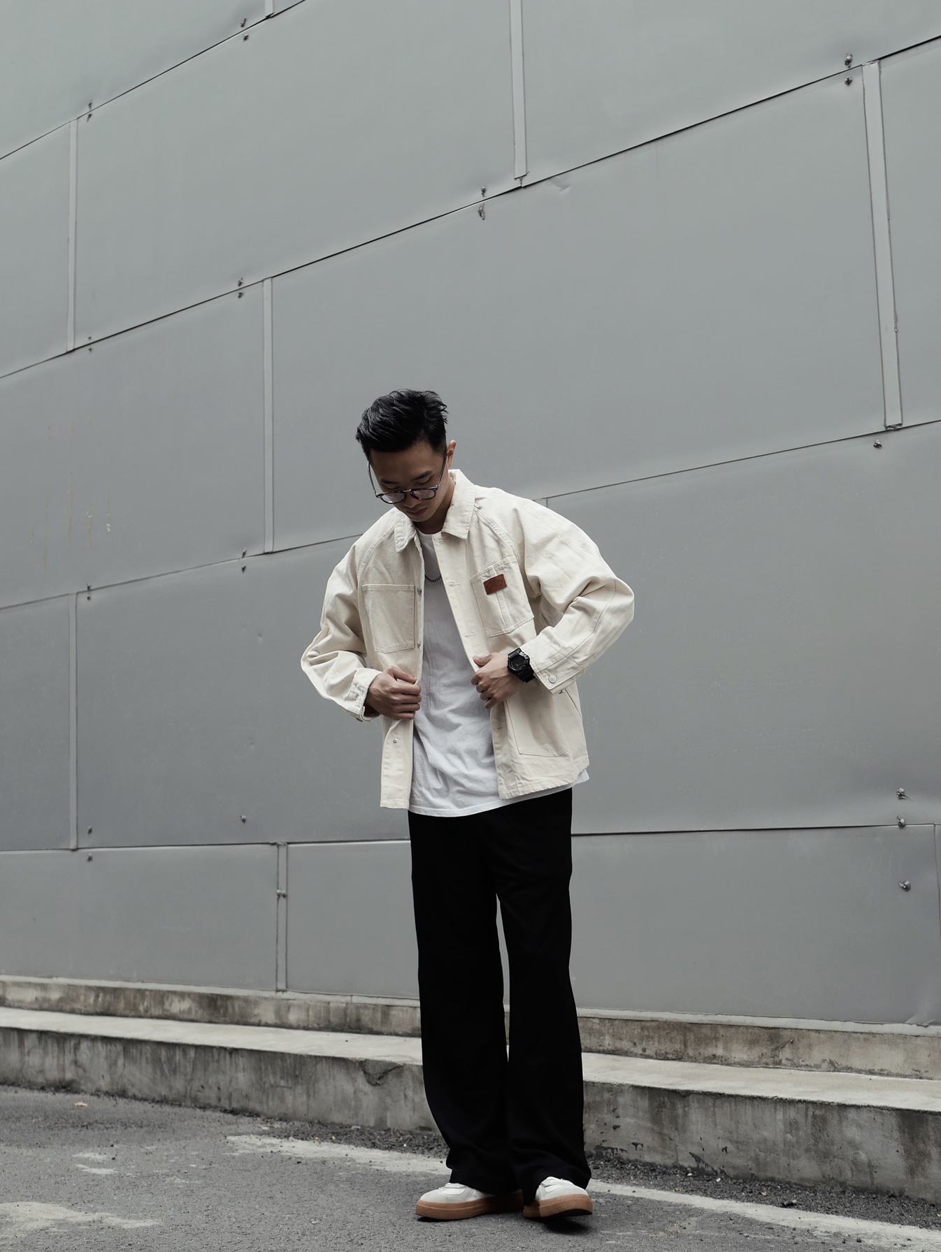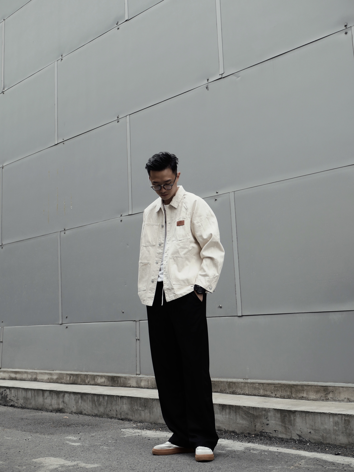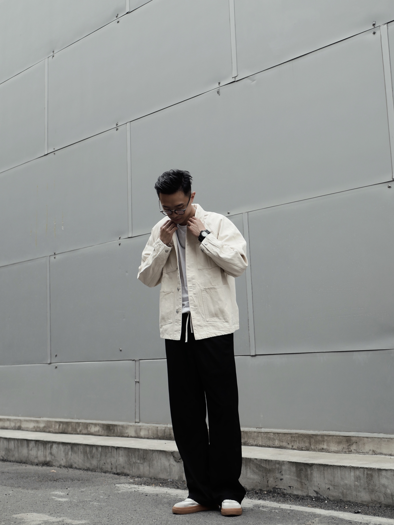 今日的简单搭配 选好裤子对修饰身材非常重要,首选直筒有垂感的布料,另外透气性好的裤子可以在夏天也不怕流汗。白色夹克很醒目,浅深色系搭配的巧妙性要懂得运用。深色长直筒裤很显腿长,高个子和矮个子都能轻松驾驭/ -