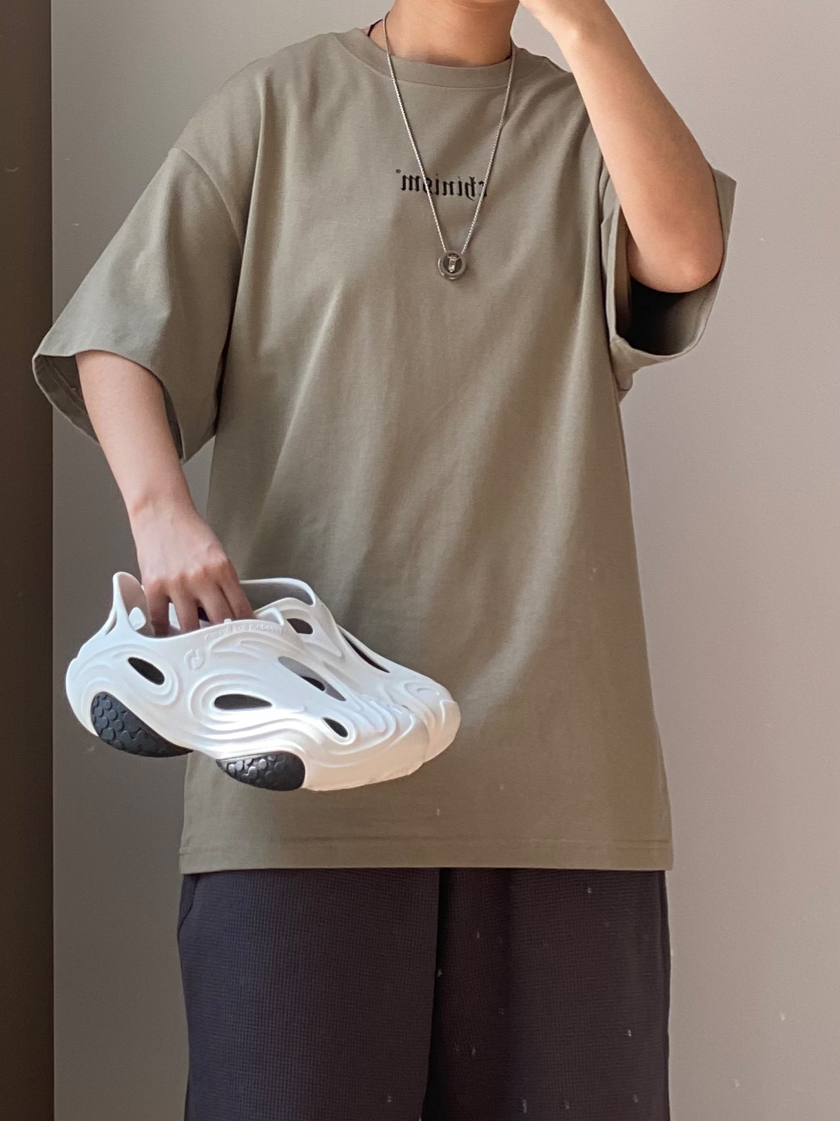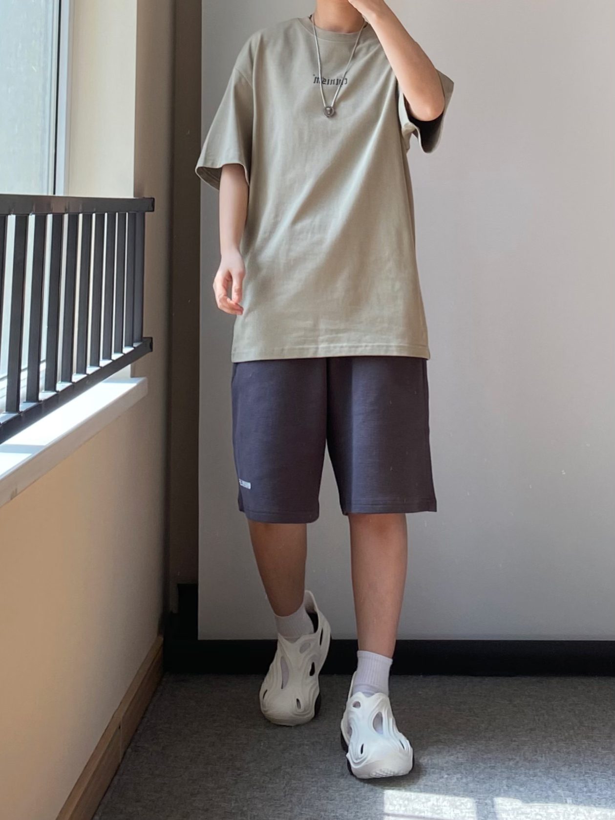 夏季百搭的休闲搭配 苔藓绿色的短袖T恤 🩳搭配一条深灰色的针织短裤 👟N40系列的洞洞鞋太好穿啦~ 👖白告studio