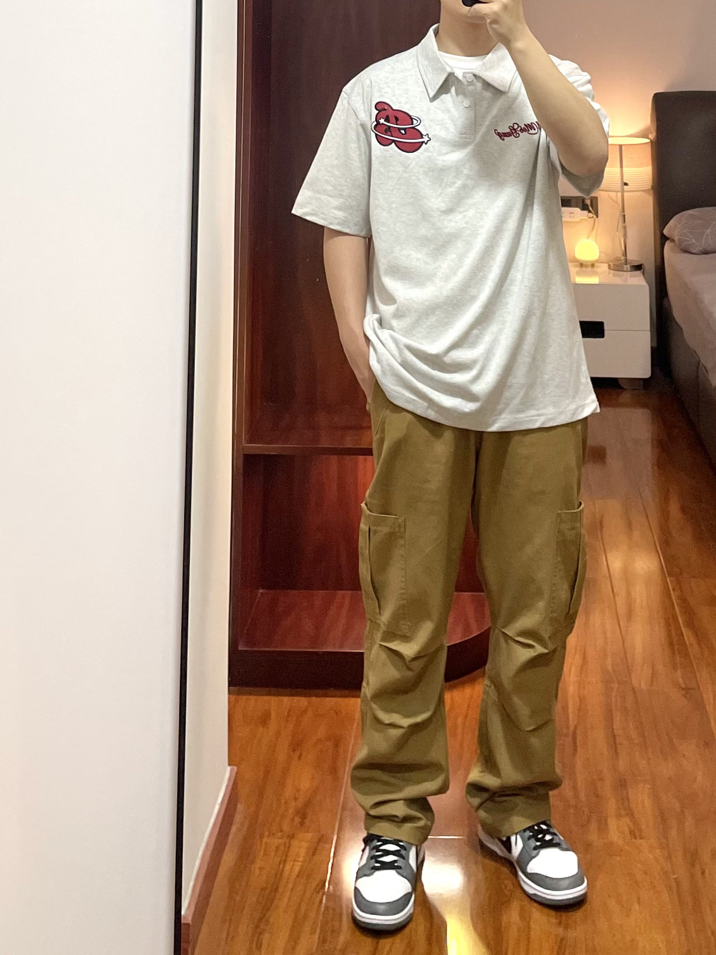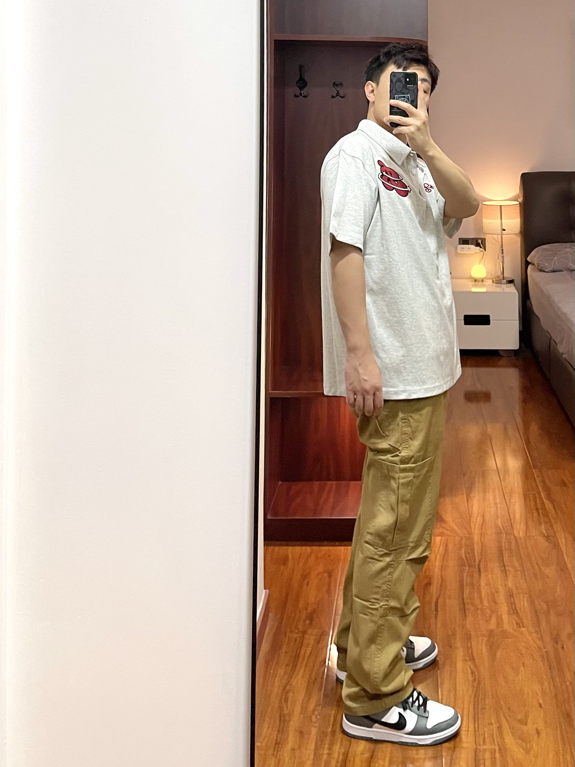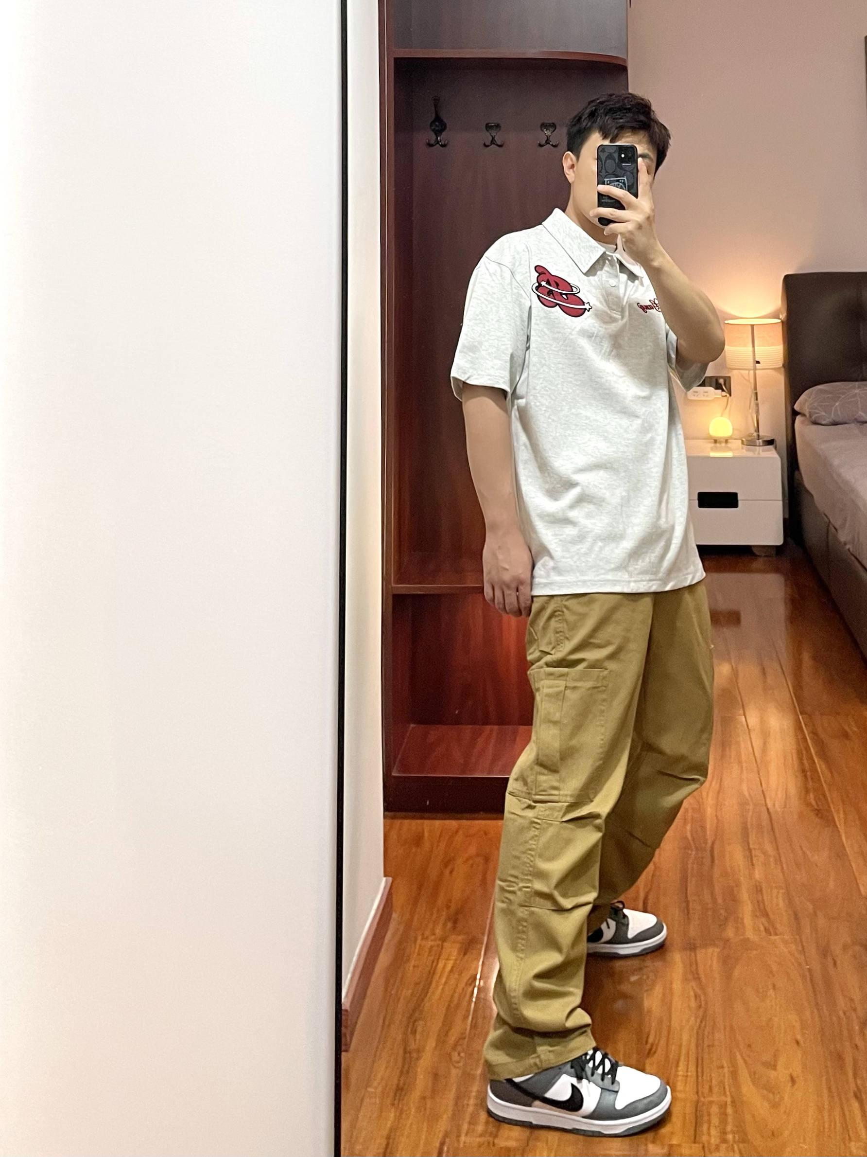 170cm/67kg 一个普通人的穿搭分享 👕:404MOB Polo衫-M 浅花灰的Polo衫,版型宽松休闲不老气,面料比较厚实上身效果很立体有质感,叠穿白T有层次。 👖:zzr 休闲裤 卡其色的直筒休闲裤,小腿膝盖位有双层褶皱的设计伞兵裤的元素。 👟:Nike dunk