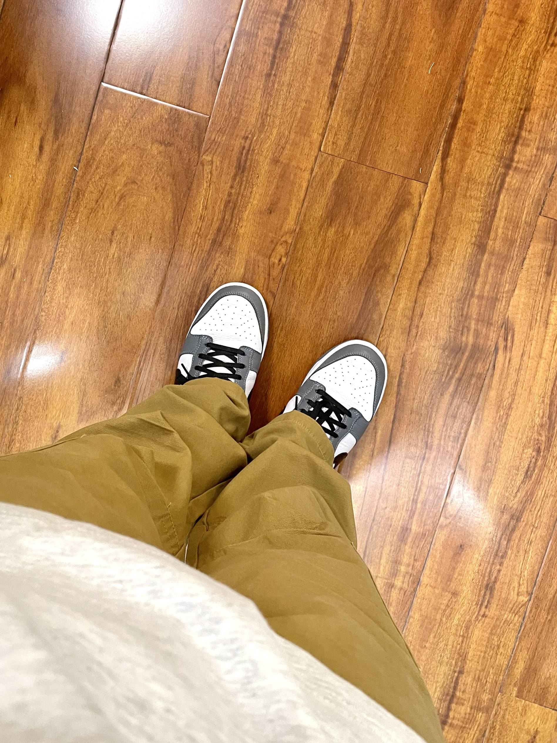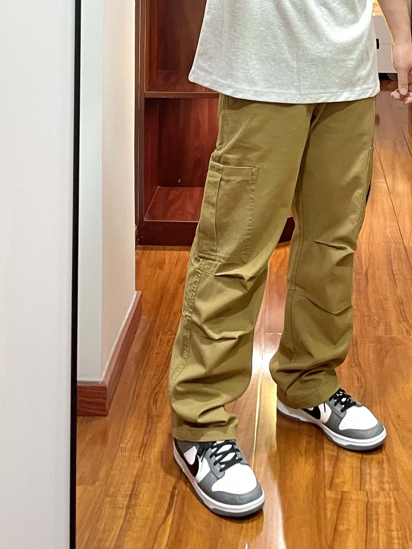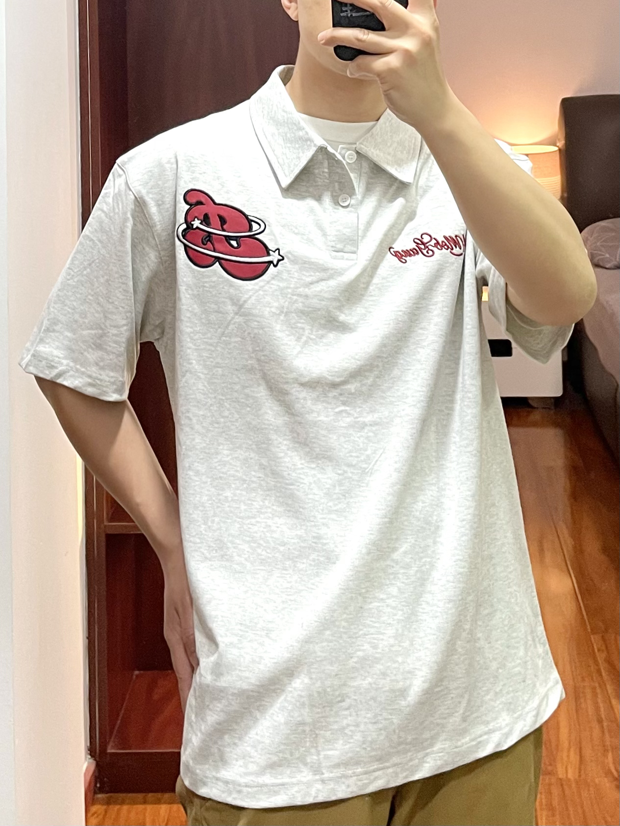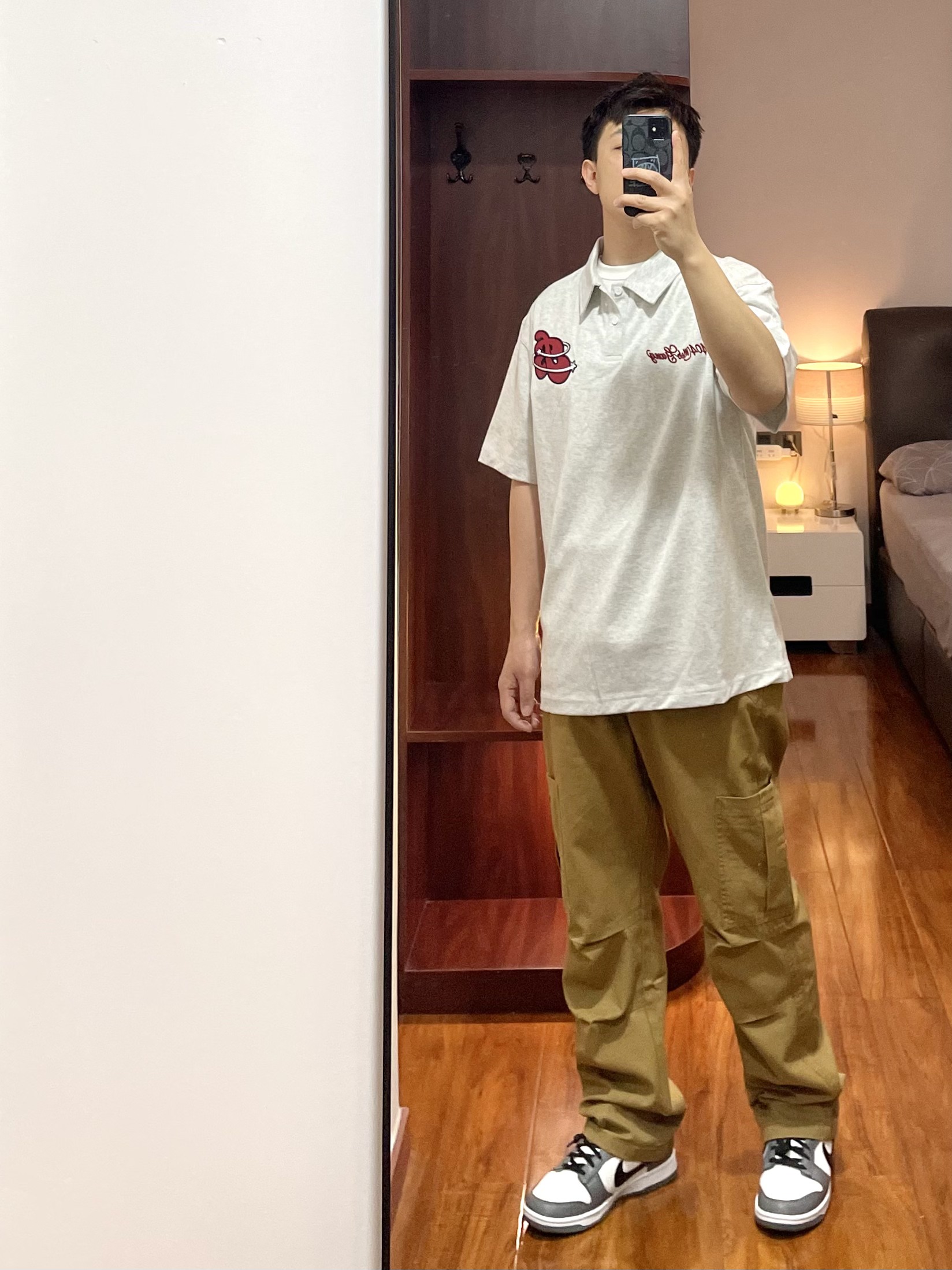 170cm/67kg 一个普通人的穿搭分享 👕:404MOB Polo衫-M 浅花灰的Polo衫,版型宽松休闲不老气,面料比较厚实上身效果很立体有质感,叠穿白T有层次。 👖:zzr 休闲裤 卡其色的直筒休闲裤,小腿膝盖位有双层褶皱的设计伞兵裤的元素。 👟:Nike dunk