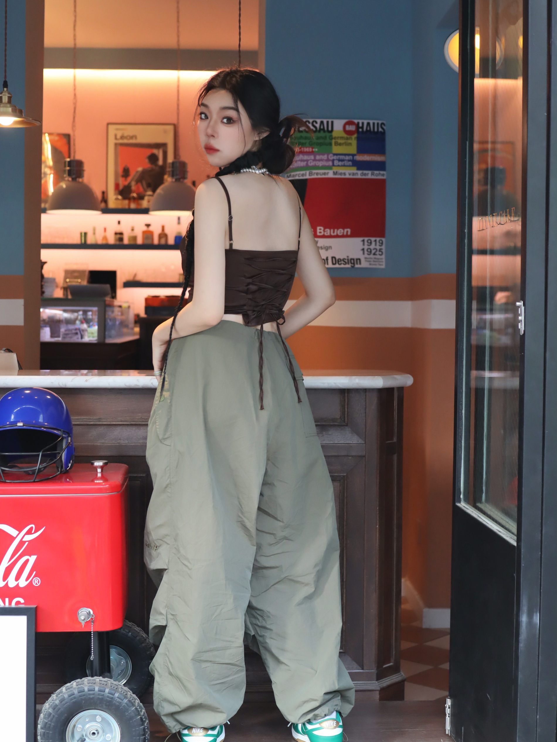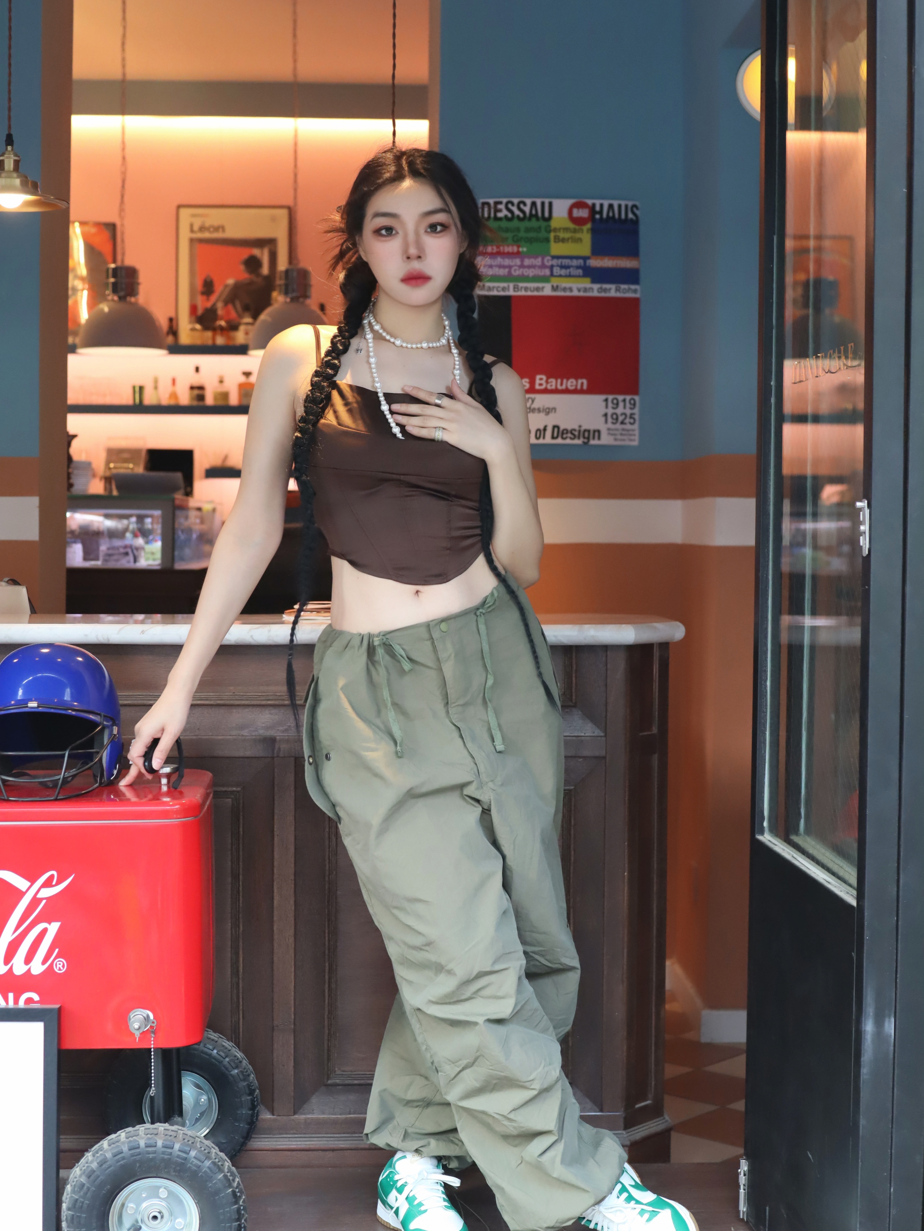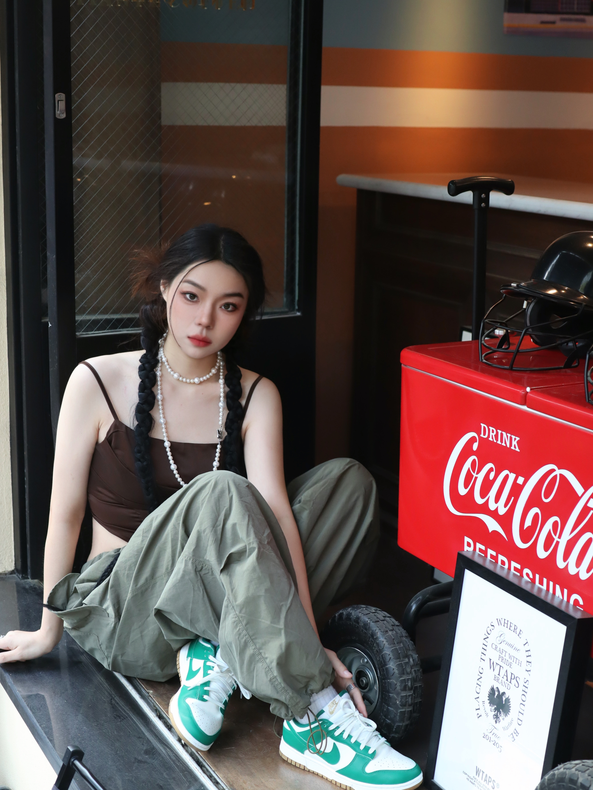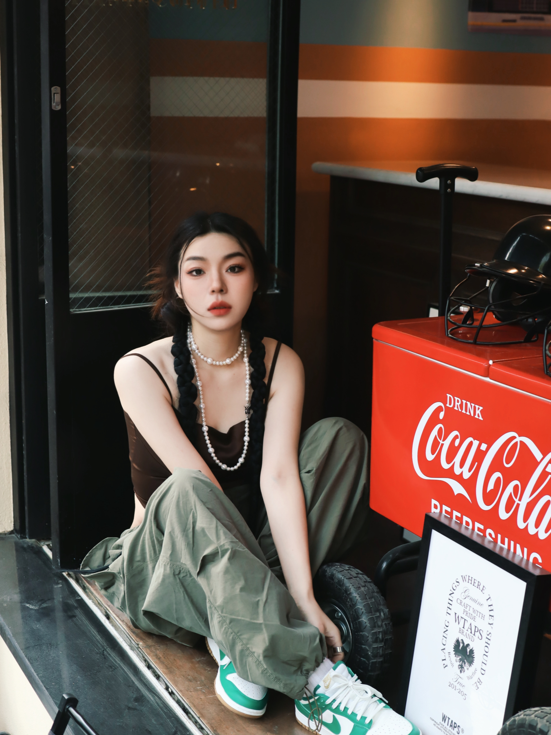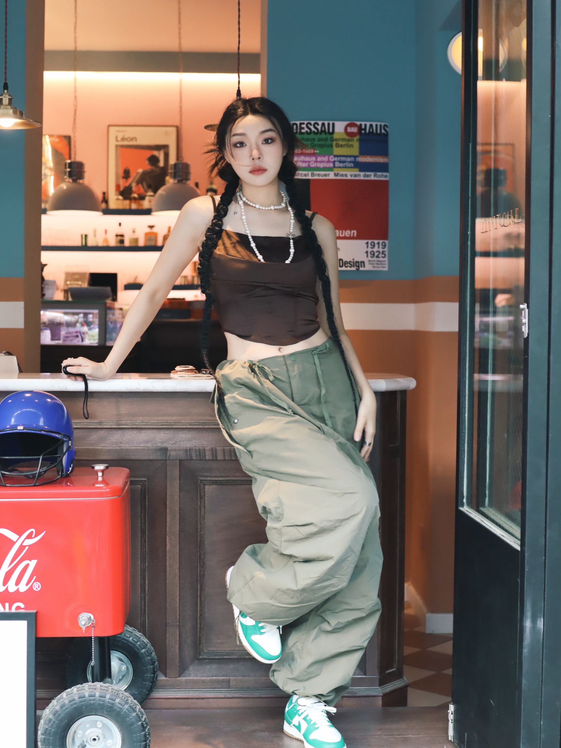 2023年啦 还有谁没尝试过美式复古呀~ 真的太好看了吧‼️ 🏝️夏日美式复古穿搭万能公式 短款上衣+工装长裤 刚开始尝试美式风格使用这个公式总没错‼️ 六六穿搭 棕色吊带胸前设计很好的修饰了🐻型 搭配豆沙绿长裤 整体颜色饱和度偏低搭配起来就很和谐 鞋子选择了绿金配色Dunk 跟裤子呼应 就很和谐 👖:NEWOK 👟:Nike