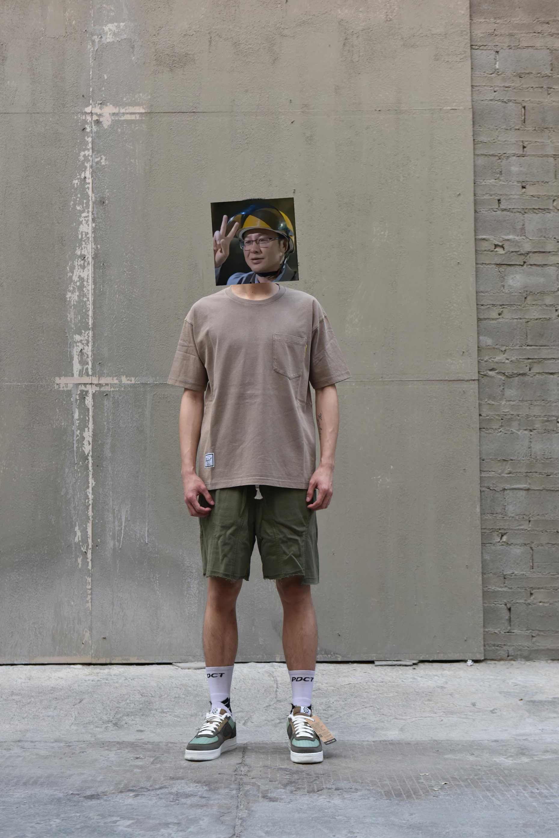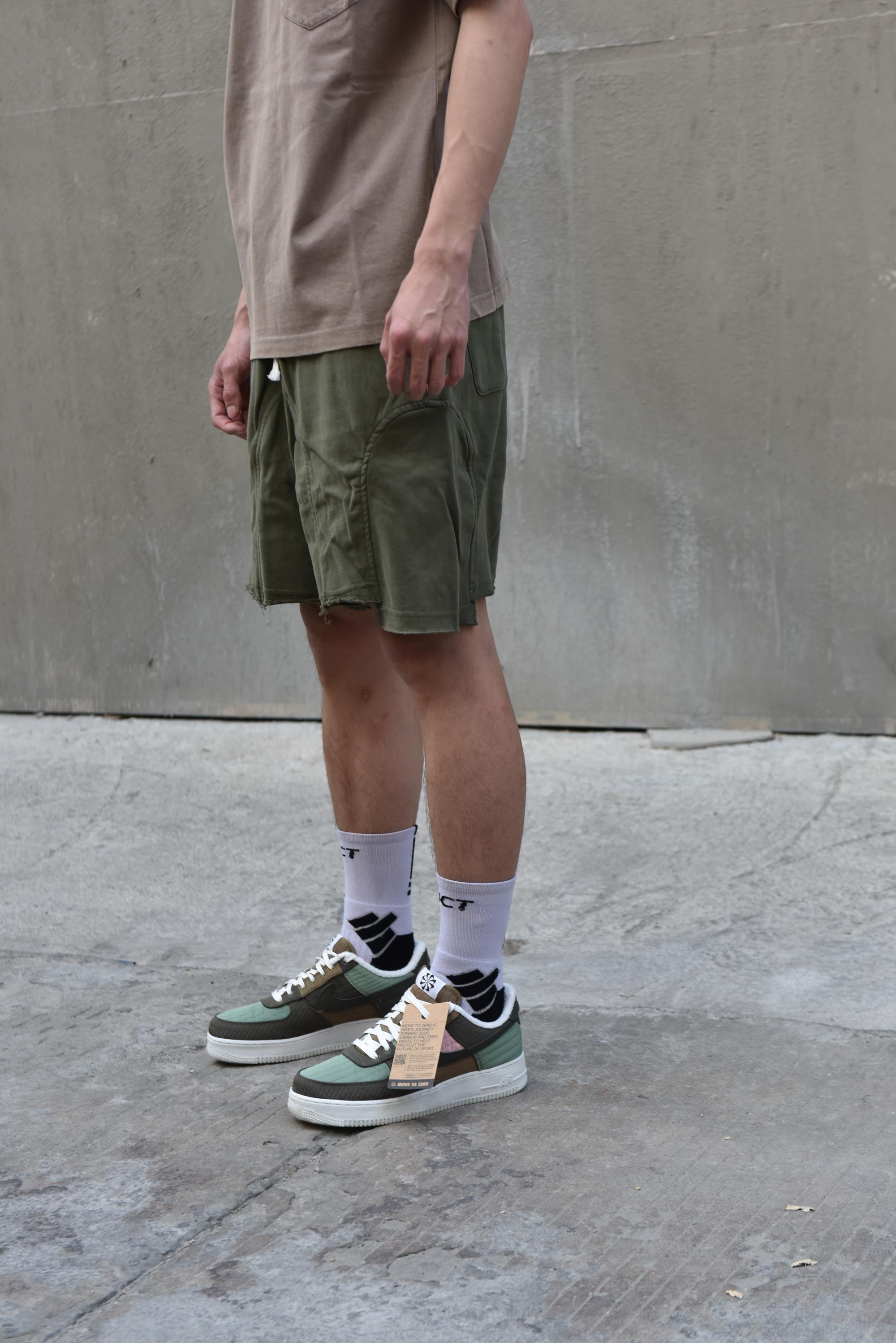 鞋面采用了不同的织物材质,不同色块的 拼接,主体军绿色,外观真的特别好看,鞋垫和内里 均是短绒毛材质,十分保暖 👕上衣:PDCT简洁T 👖下装:PDCT破坏短裤 🧦袜子:PDCT精英袜 👟鞋子:AF1橄榄绿