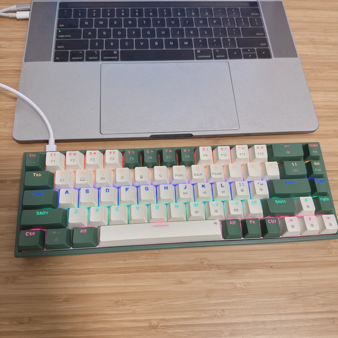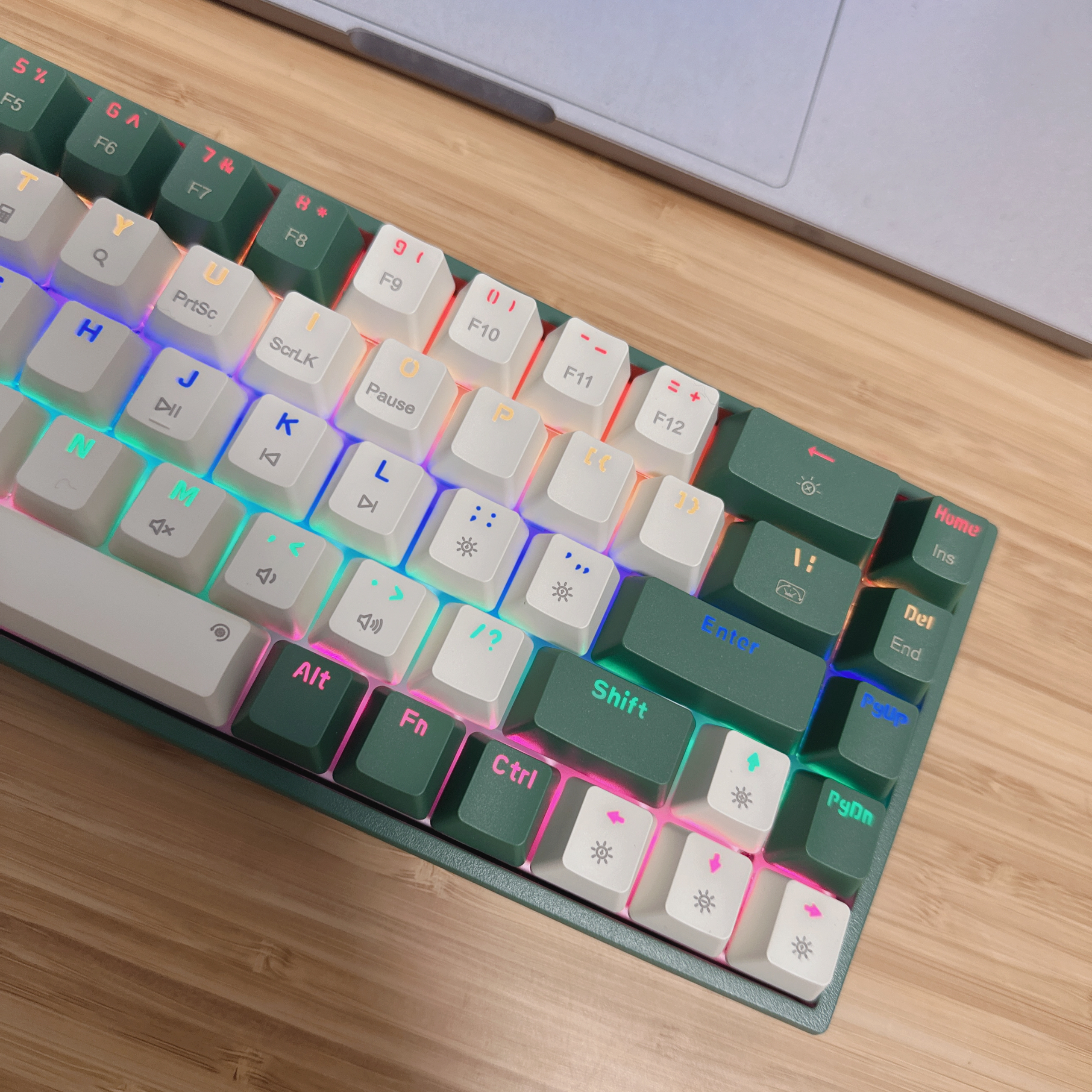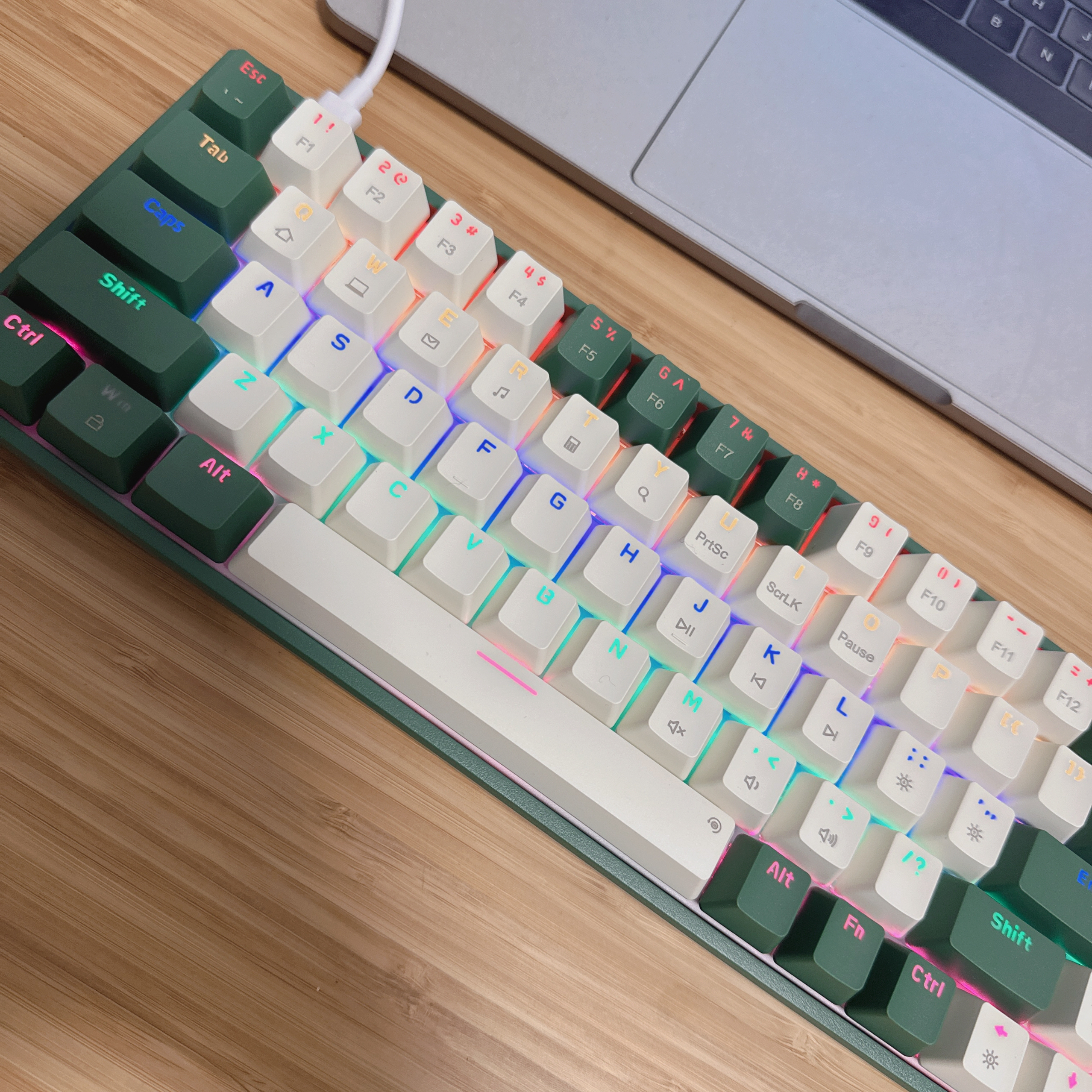 撞色机械键盘,全新炫酷体验!发现一款小巧顺滑的机械键盘。 BOW G68S热插拔机械键盘,白绿撞色很有春天的感觉,全键无冲突设计,敲击起来顺滑无卡。阶梯键设计,还有双段式支架,打字持久也不累手。 小小的键盘还有很多多媒体功能,20多种灯效,敲击起来就像闪烁的钢琴,还可以播放音乐,连接电脑主页等,让清淡的工作也变得有趣起来!
