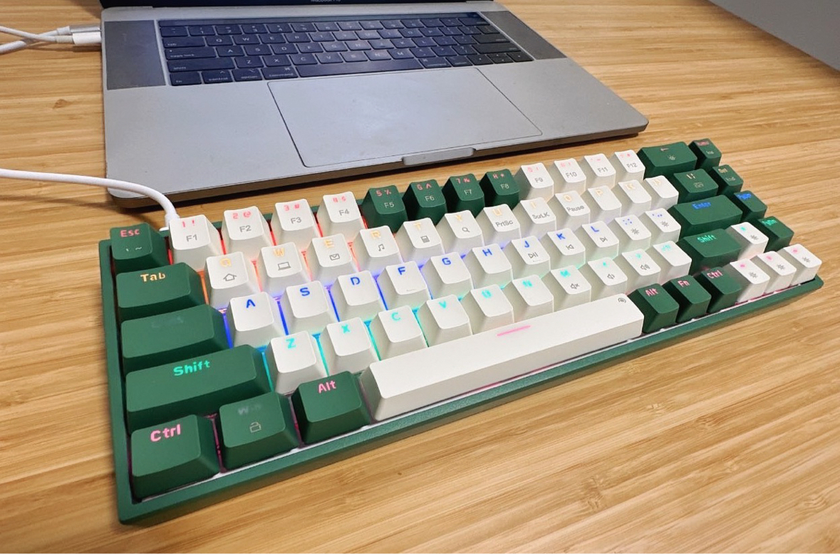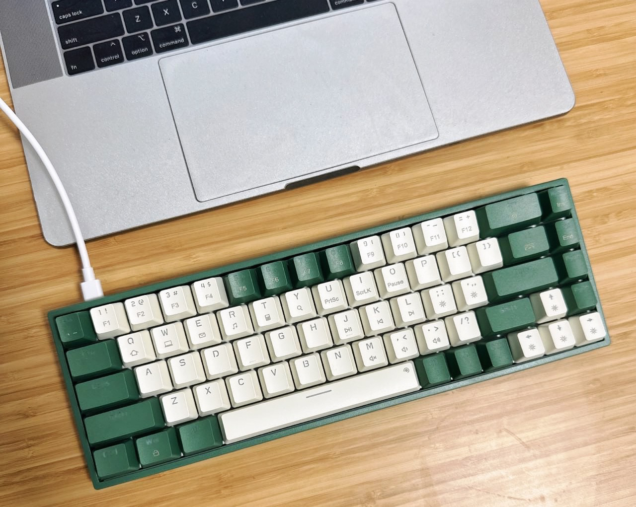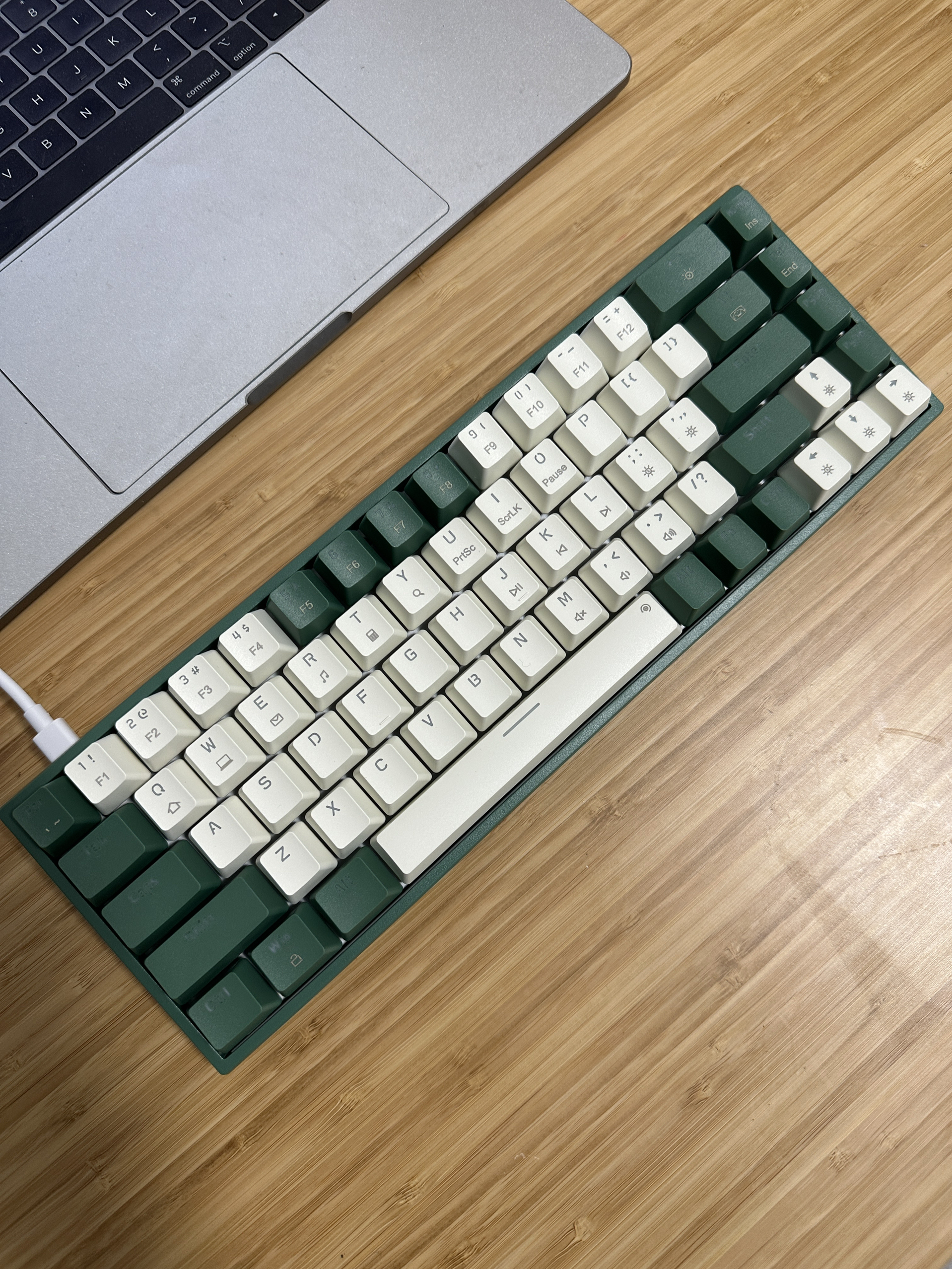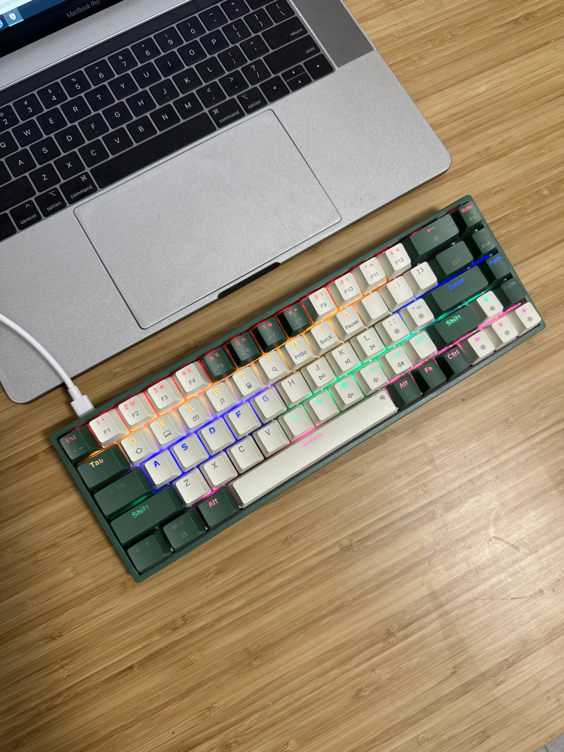 撞色机械键盘,全新炫酷体验!发现一款小巧顺滑的机械键盘。 BOW G68S热插拔机械键盘,白绿撞色很有春天的感觉,全键无冲突设计,敲击起来顺滑无卡。阶梯键设计,还有双段式支架,打字持久也不累手。 小小的键盘还有很多多媒体功能,20多种灯效,敲击起来就像闪烁的钢琴,还可以播放音乐,连接电脑主页等,让清淡的工作也变得有趣起来!