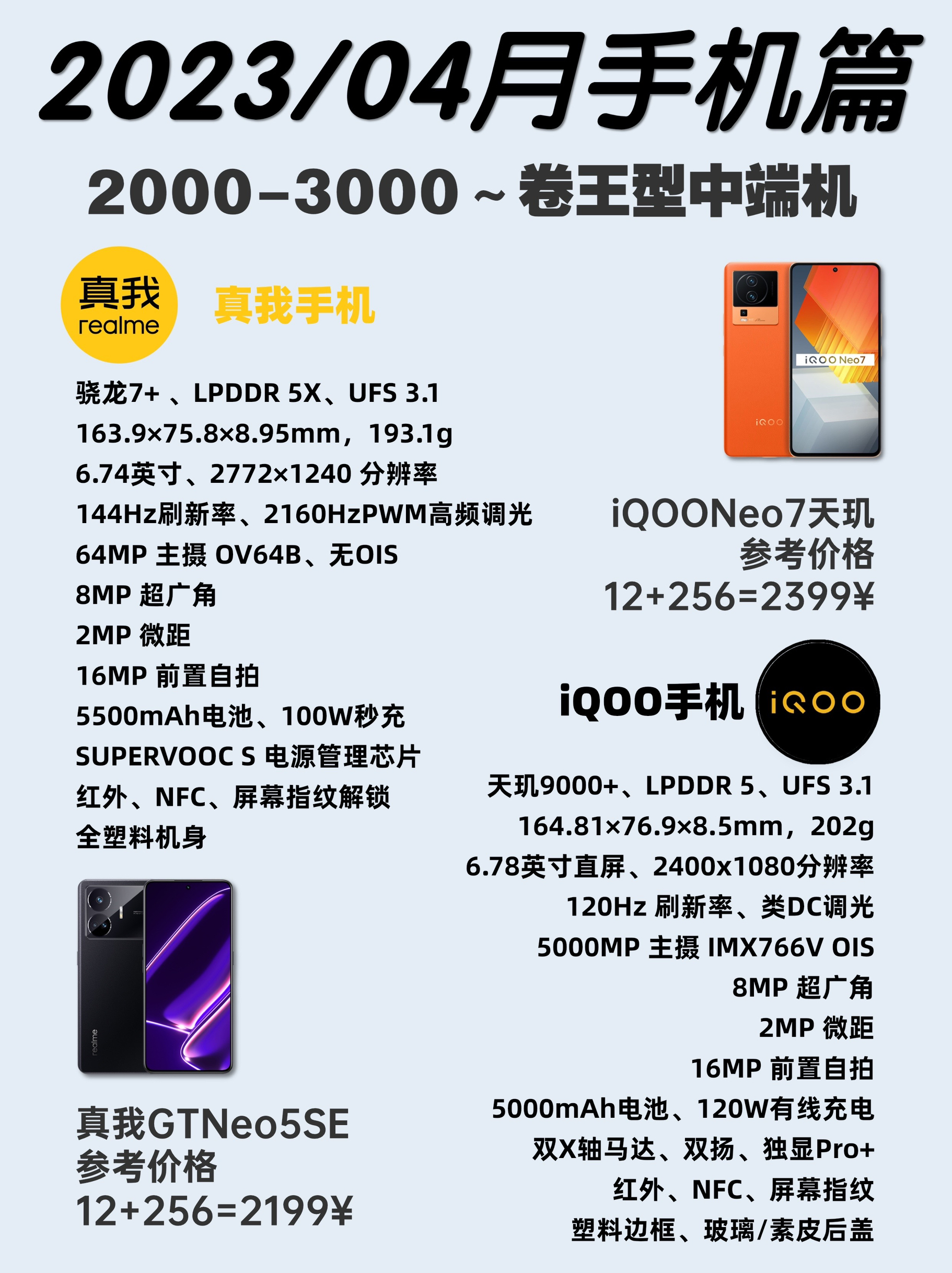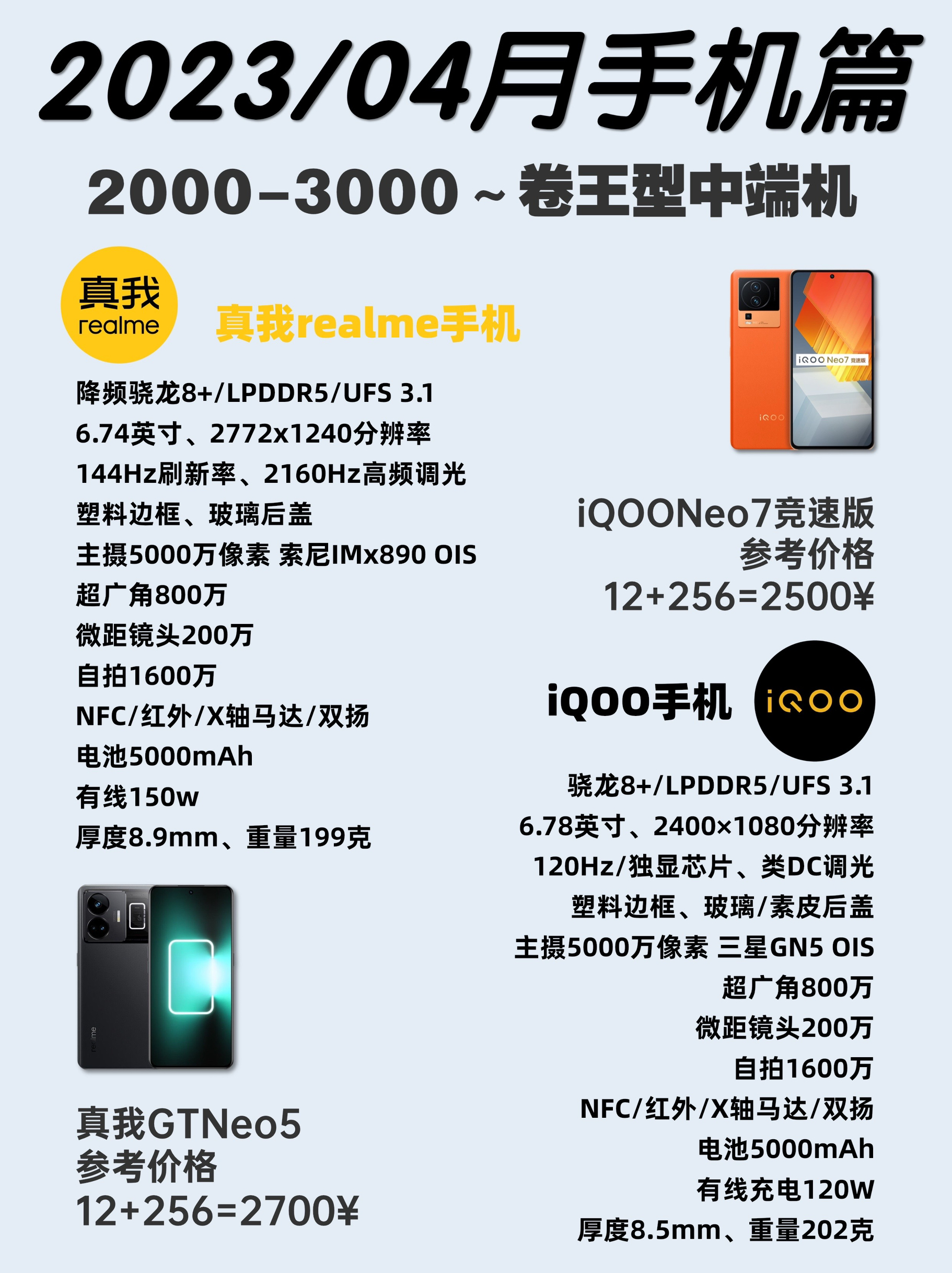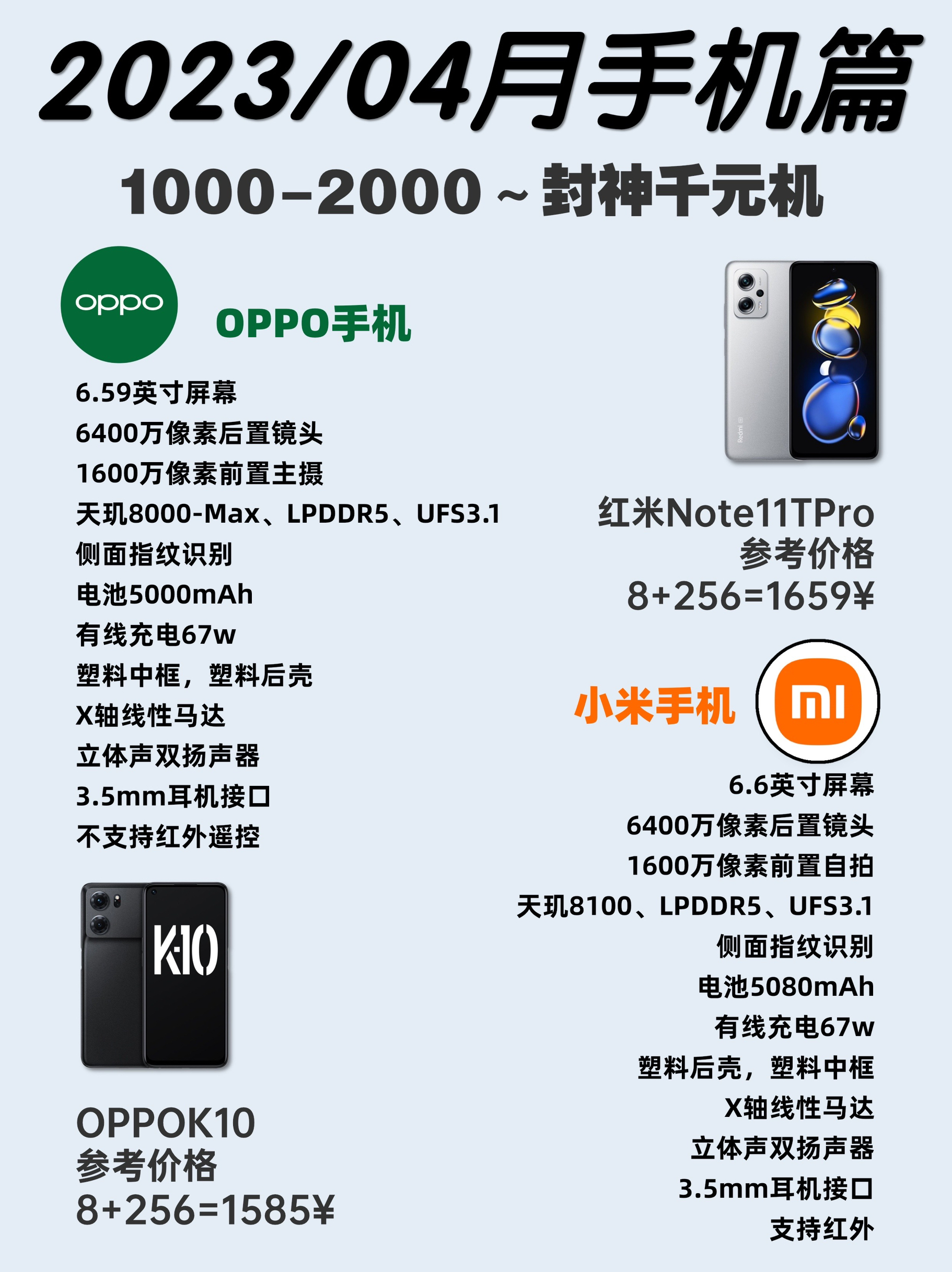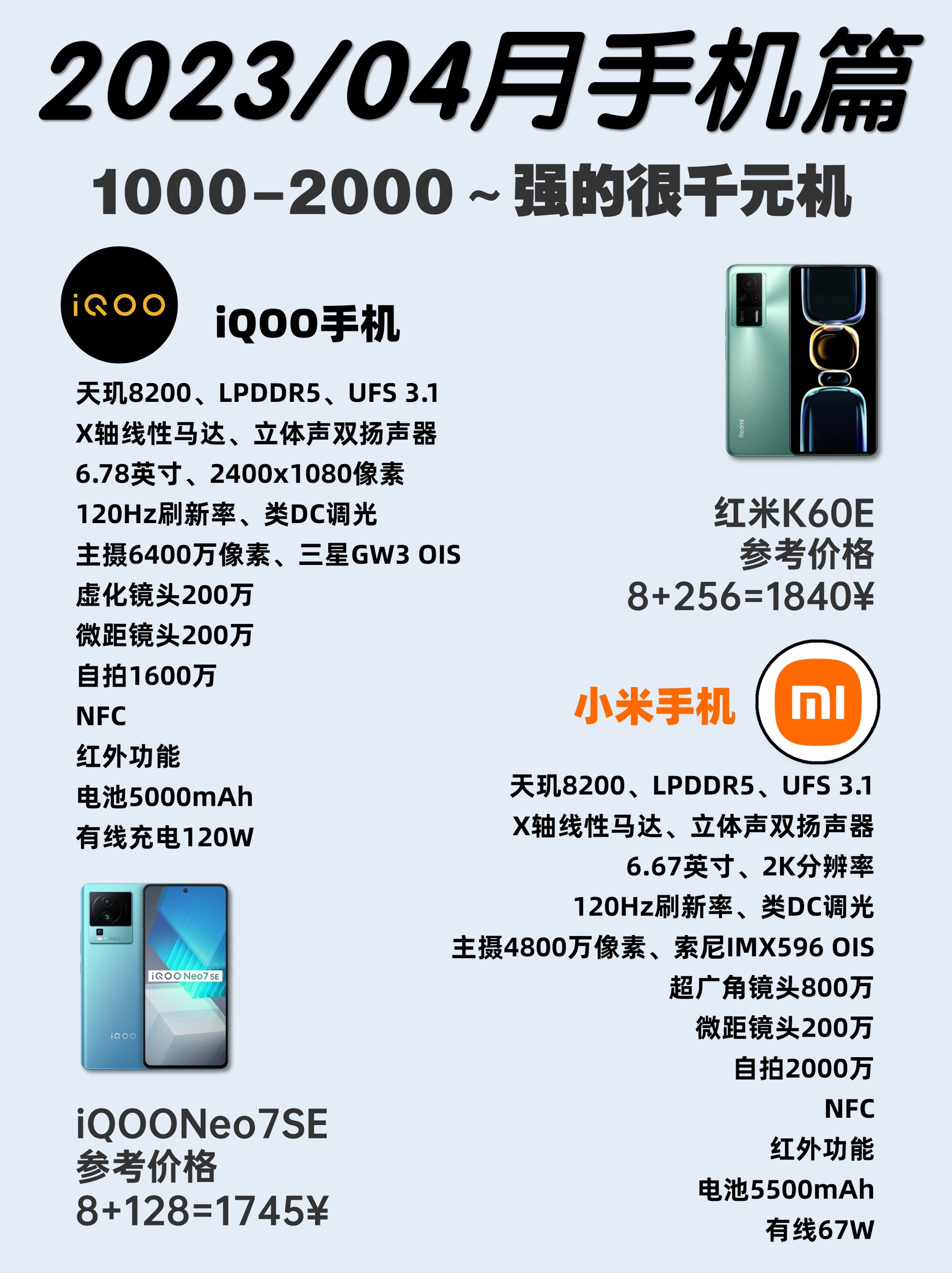 - 进入4月份、可选的手机又大幅增加了(3月份真香手机发布了太多了)、结合之前的旧机型、本期为大家盘点了本月20款性价比机型代表。 - ❗️❗️❗️声明❗️❗️❗️ - ✅本期机型没有一款高价低配机型、也没有一丝丝广、请大家放心选择、按需考虑。 - ✅本期机型针对 1000-2000、2000-3000价格区间都有不同手机品牌机型、以方便不同用户分类按需挑选。 - ✅本期列举机型均为高性能高性价比...