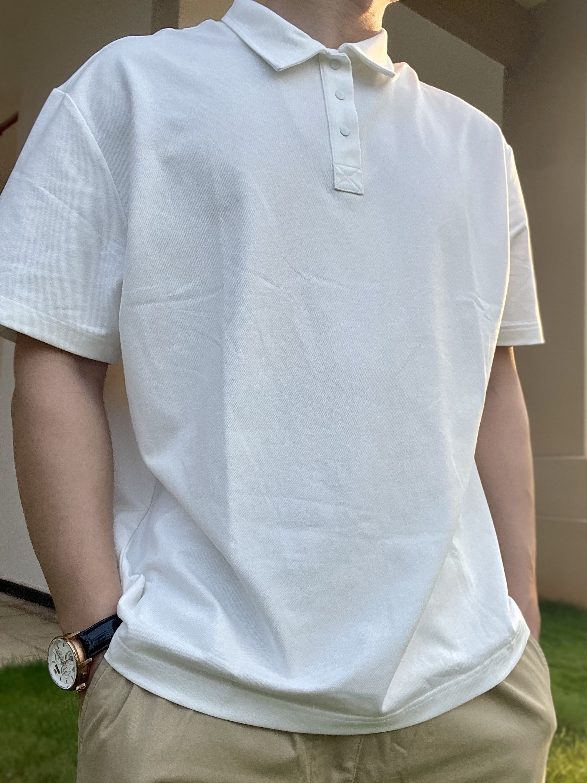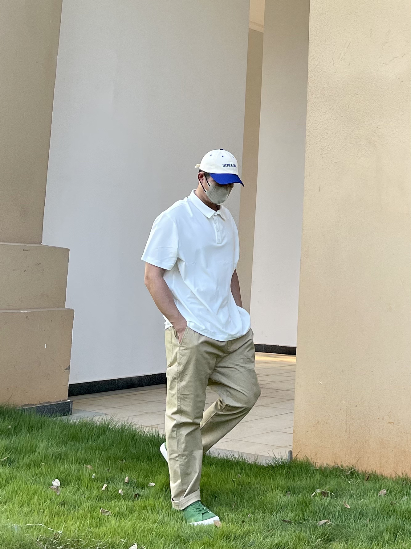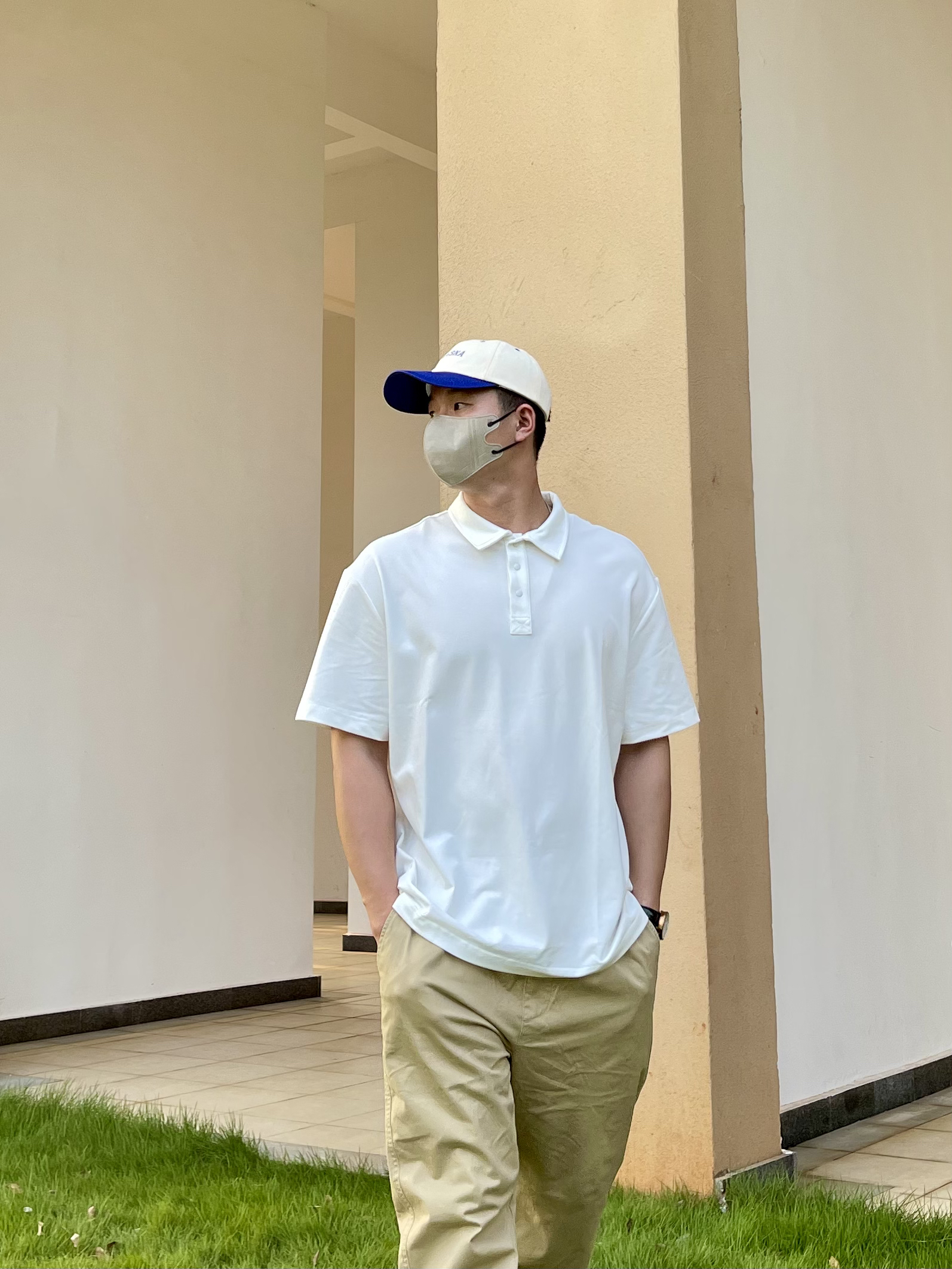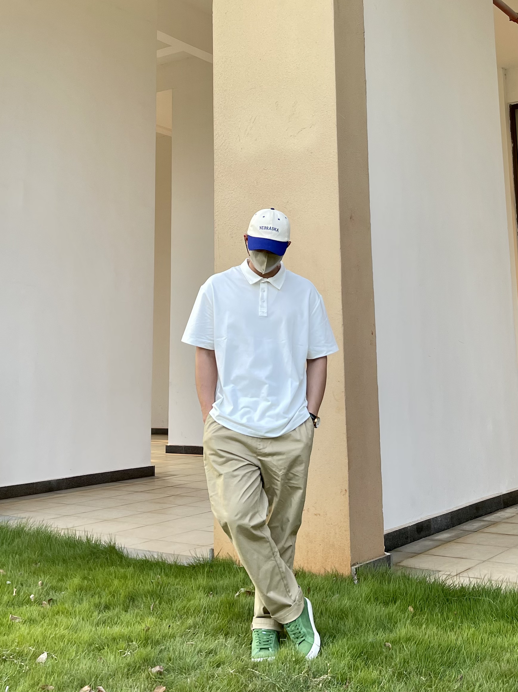 今天分享的一套夏日简约清爽的搭配 我们男生夏天一定要有一件白色纯色 Polo衫 既清爽不热 又能突显气质 搭配卡其色休闲长裤就是非常日系的感觉