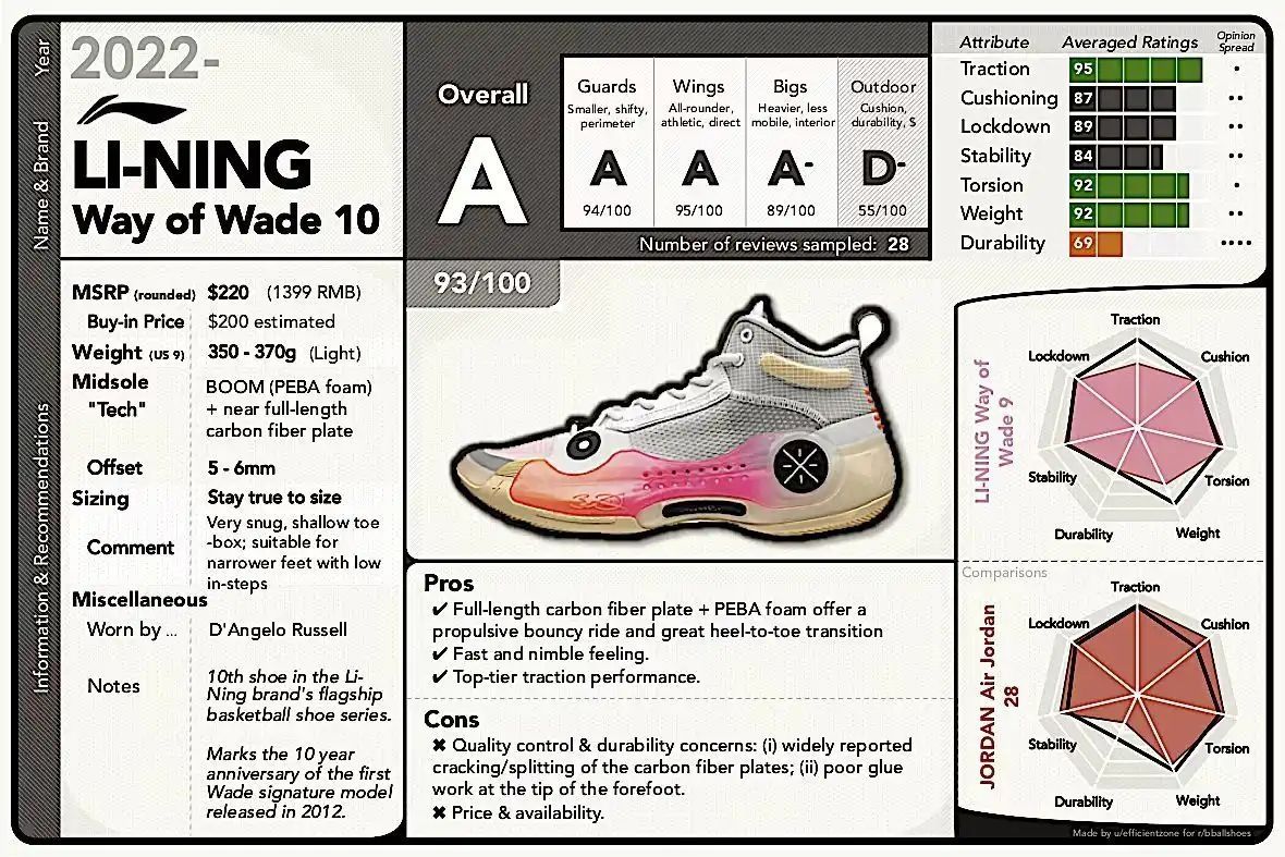 ✓感兴趣关注我,精彩内容不错过 JB1 省流: 总评:86/100 缓震和抓地优越,耐磨不好 性价比低,不值得高价购买 韦德之道10代 省流: 省流: 总评:93/100 缓震推进感很不错,抓地表现优秀 品控问题突出,碳板有断裂风险,鞋头有开胶风险 闪击9 省流:82/100 抓地、场地感以及轻量化都不错 前掌硬感受不到䨻,鞋面材料延展性差,舒适性不好 韦德808 2Ultra 省流: 79...