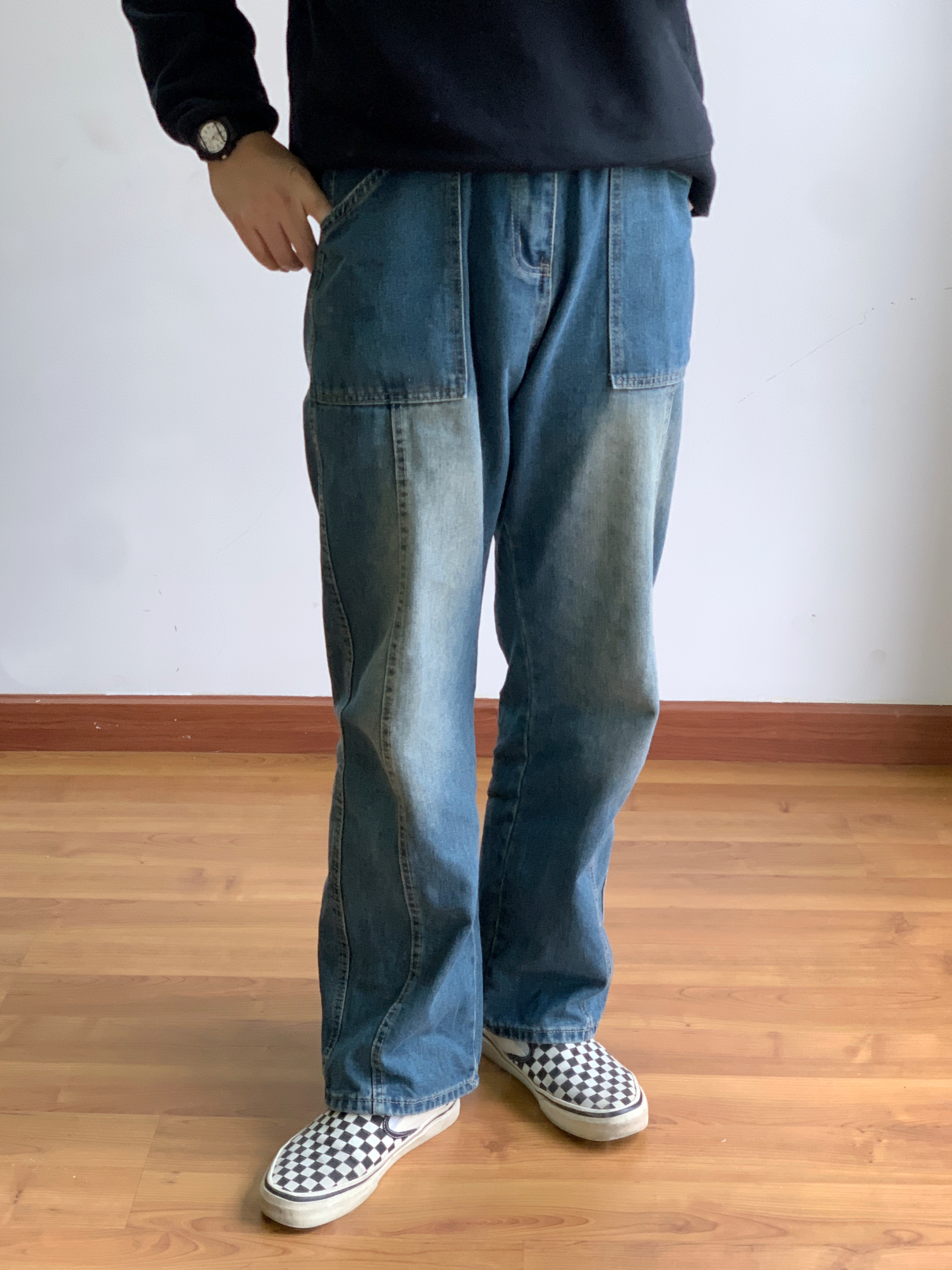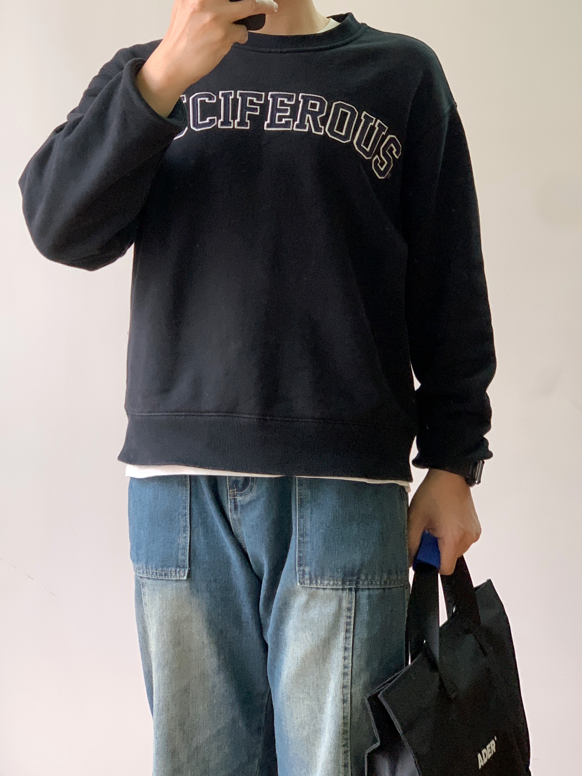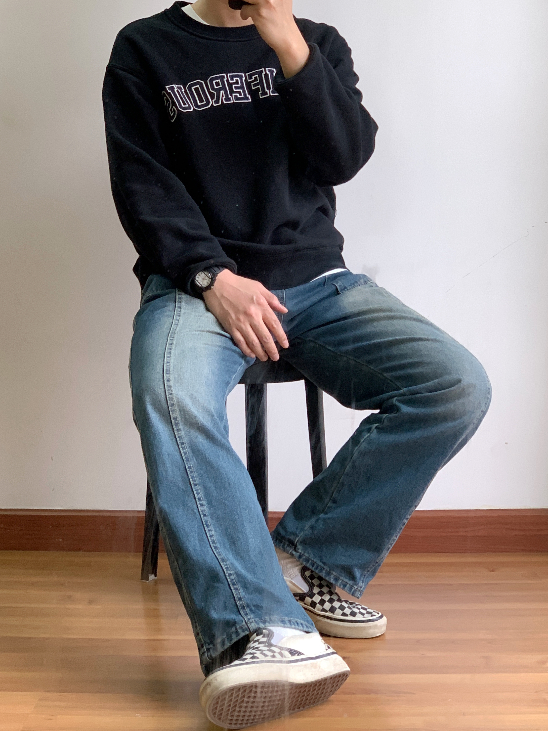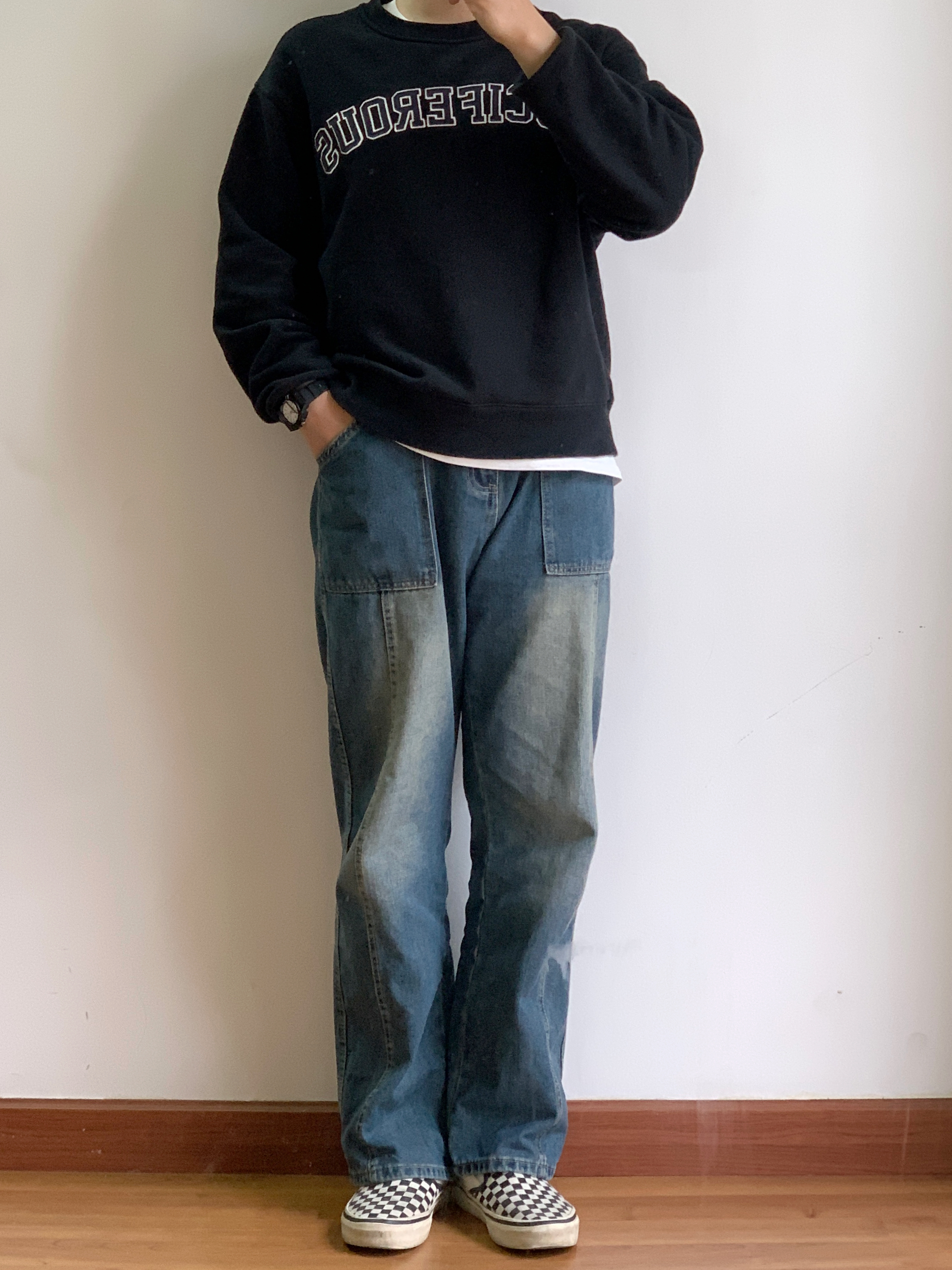 hey 这里是每天记录穿搭的社畜日记!🚶🏻 周末就是要慵懒舒适~ 简单套个卫衣抓条牛仔裤就能出门了 整体:简约的黑白色来突出裤子绝美的水洗复古蓝色👍 上身:简单的美式校园复古字母卫衣 短宽版型更适合叠穿,内搭一件白色T恤增加层次感。 下装:这条水洗牛的颜色真是把复古味道拿捏得ss的! 搭配:鞋子选择了简单的黑白棋盘格,呼应卫衣的黑白色。手表也是黑带白盘,手提包同样选择了黑色的。整体呼应,简约,不花...