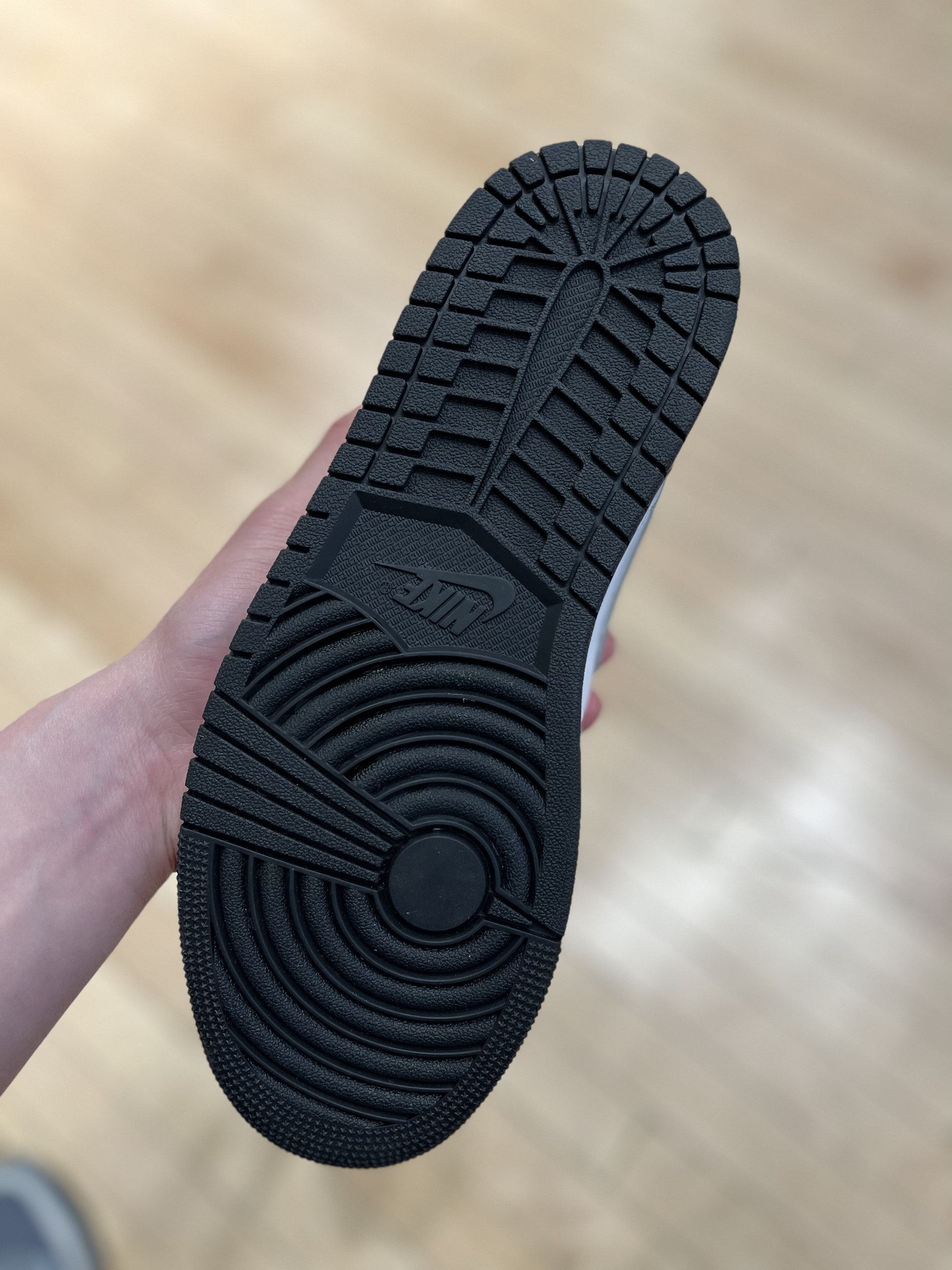 👟👟Air Jordan 1 影子灰Low 作为经典的影子灰的配色,在鞋面上也是采用了具有质感的皮革材质,鞋底也是和鞋身颜色相一致的黑色生胶鞋底,同时鞋底不同的横纹也让本双复古的篮球鞋有一定的抓地力和同时增强了耐磨的效果。在鞋的后跟处也有一个较大的乔丹的飞翼LOGO也是通过刺绣的工艺进行呈现。