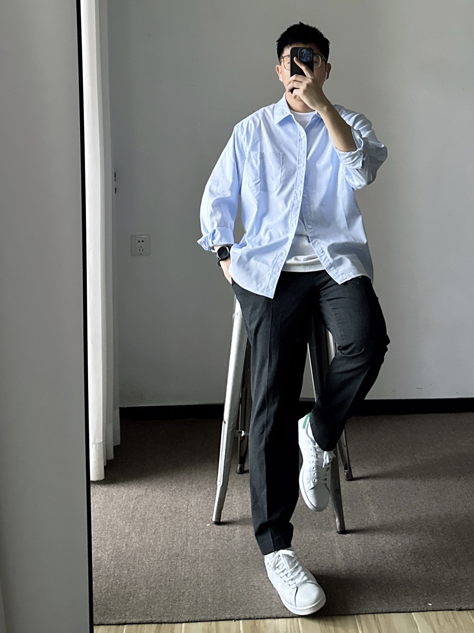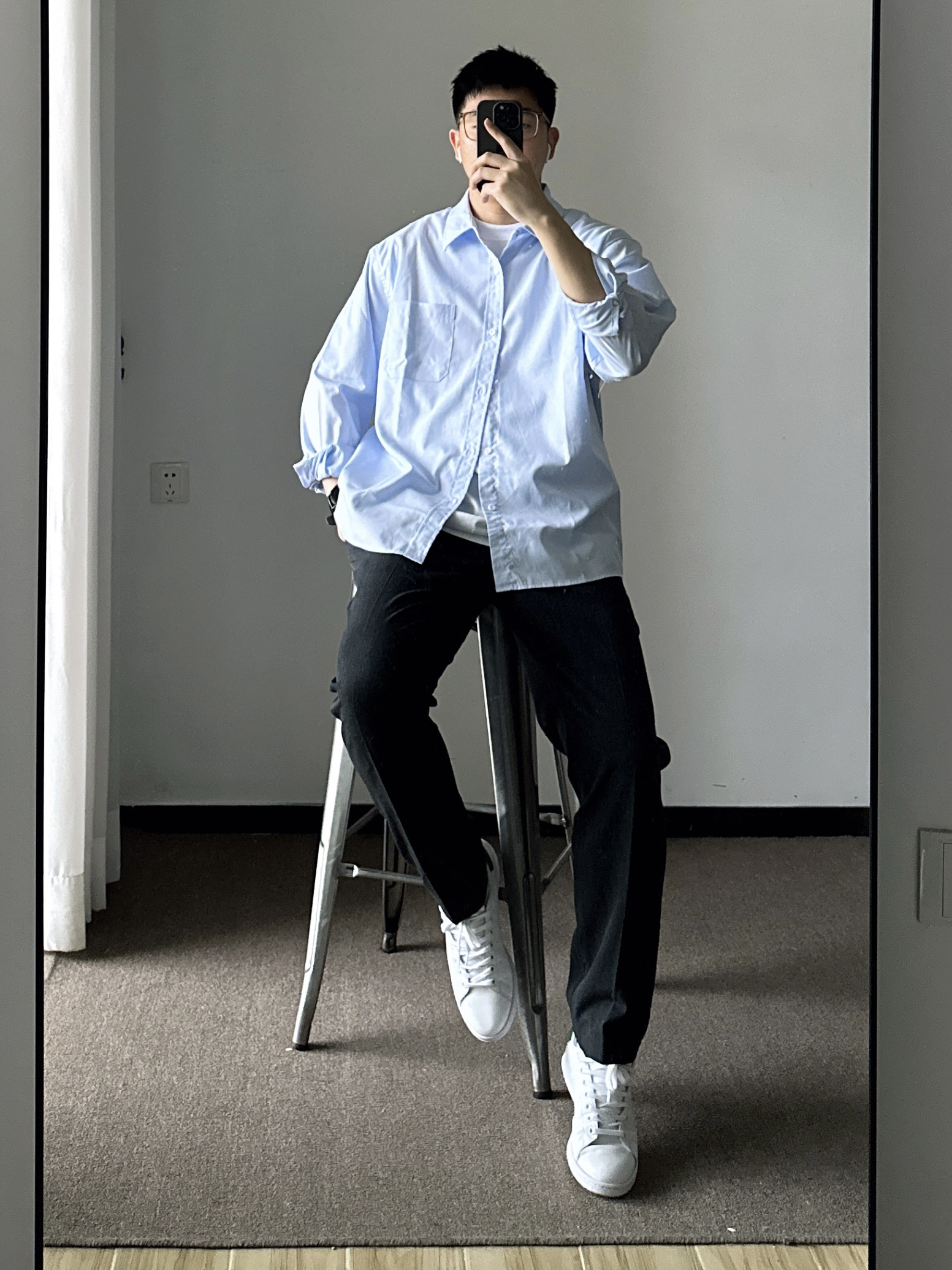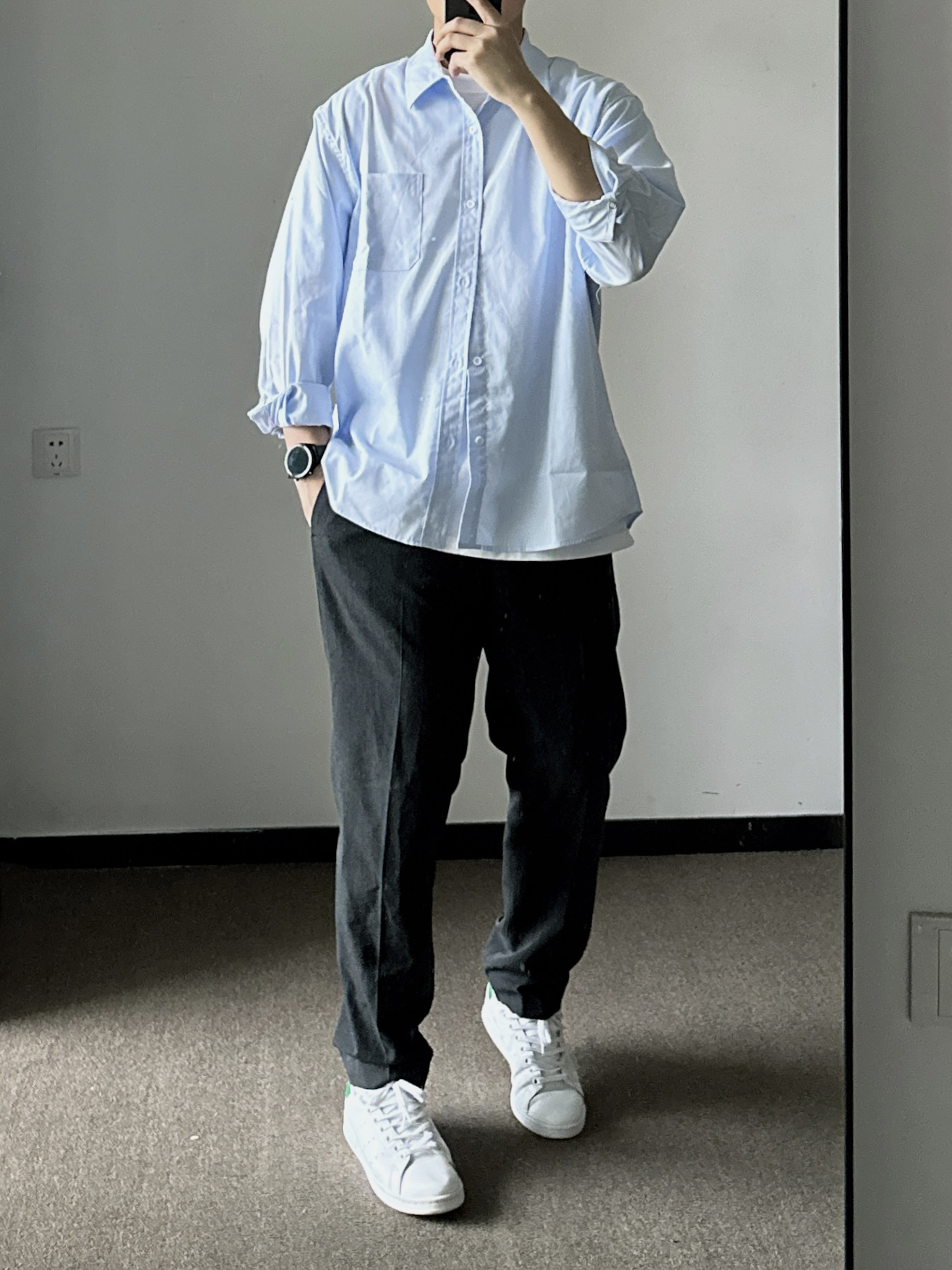 素人也能好看系列~ 174cm/65kg 🧥- 基础款的浅蓝色衬衫,侧面微微的A字廓形日常穿着也能休闲起来。 👖- 不过时的直筒西裤,舒适百搭。就算不会打扮,穿西裤也很难出错吧。tips:裤管掩饰好腿型,面料哑光有质感。 👟-小白鞋,根据裤口大小选对应的鞋型吧。