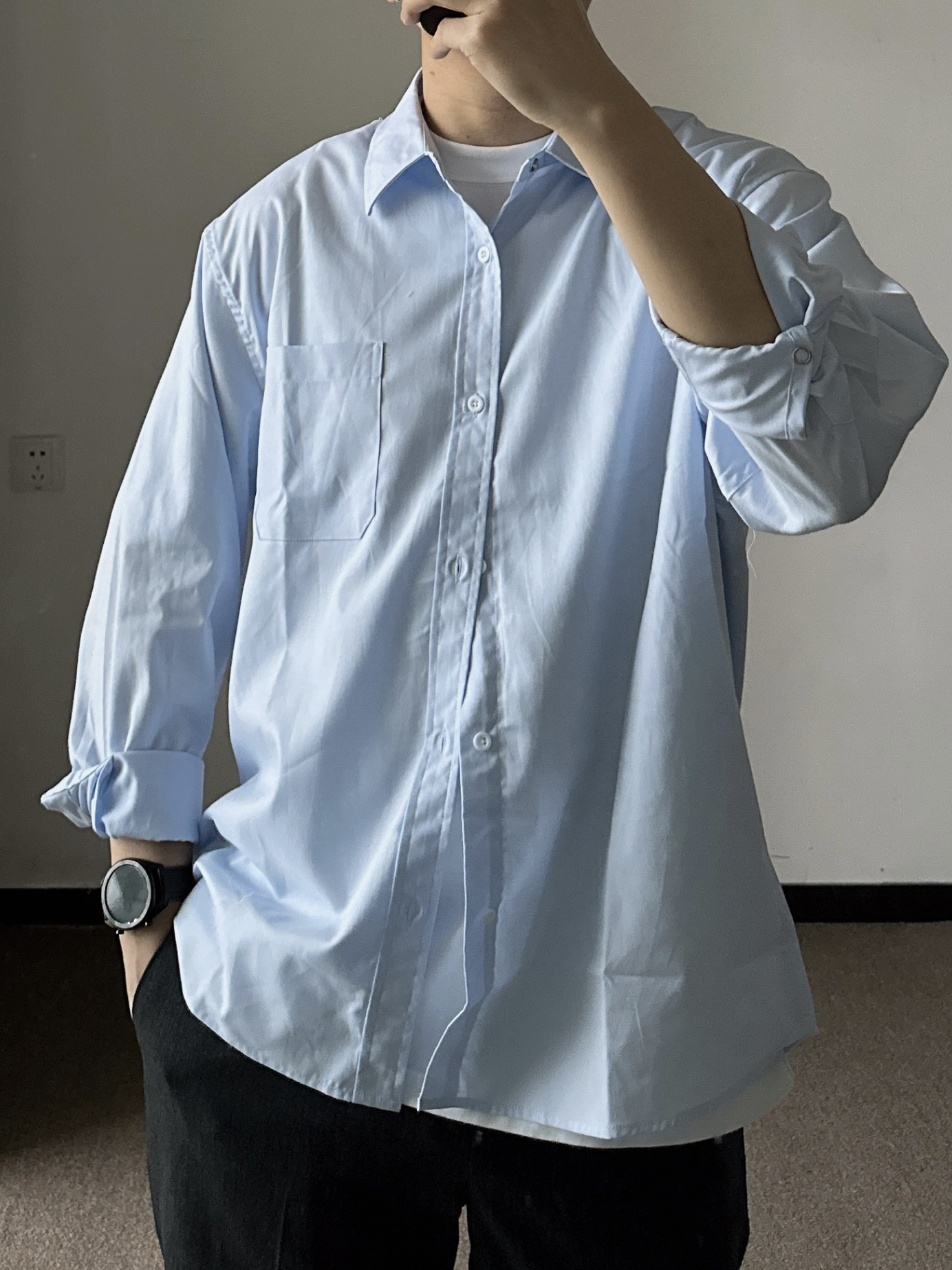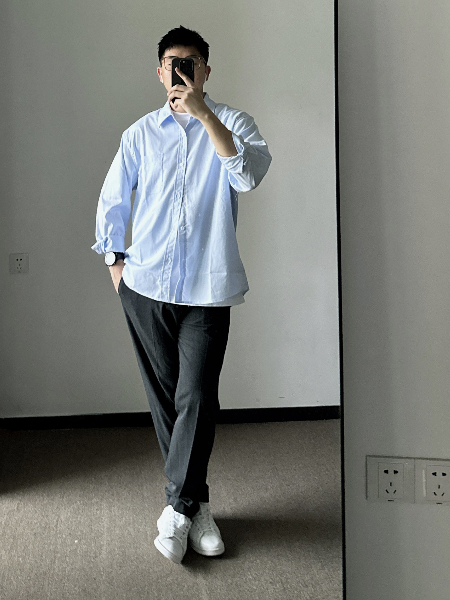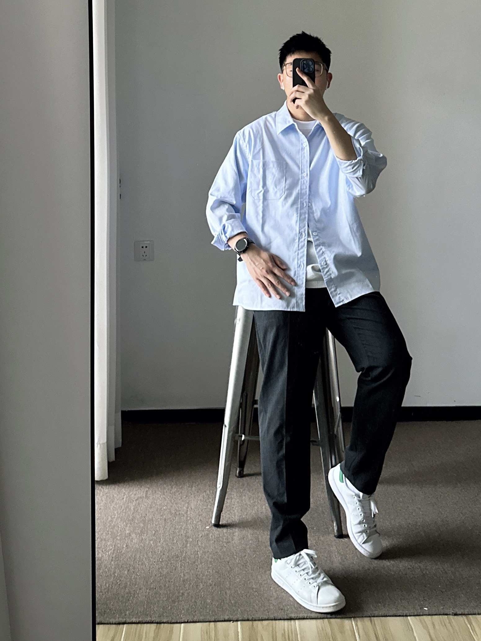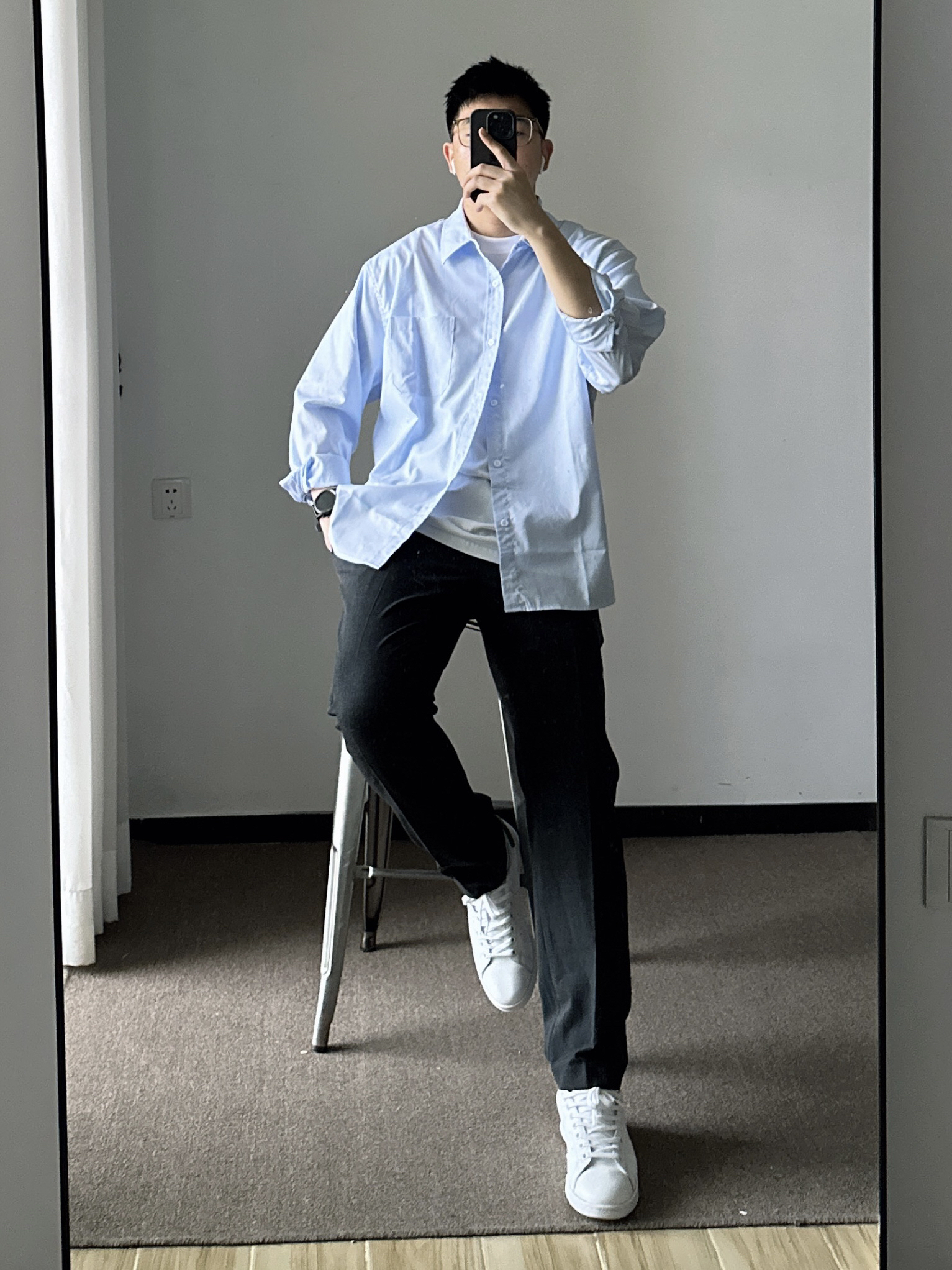 素人也能好看系列~ 174cm/65kg 🧥- 基础款的浅蓝色衬衫,侧面微微的A字廓形日常穿着也能休闲起来。 👖- 不过时的直筒西裤,舒适百搭。就算不会打扮,穿西裤也很难出错吧。tips:裤管掩饰好腿型,面料哑光有质感。 👟-小白鞋,根据裤口大小选对应的鞋型吧。