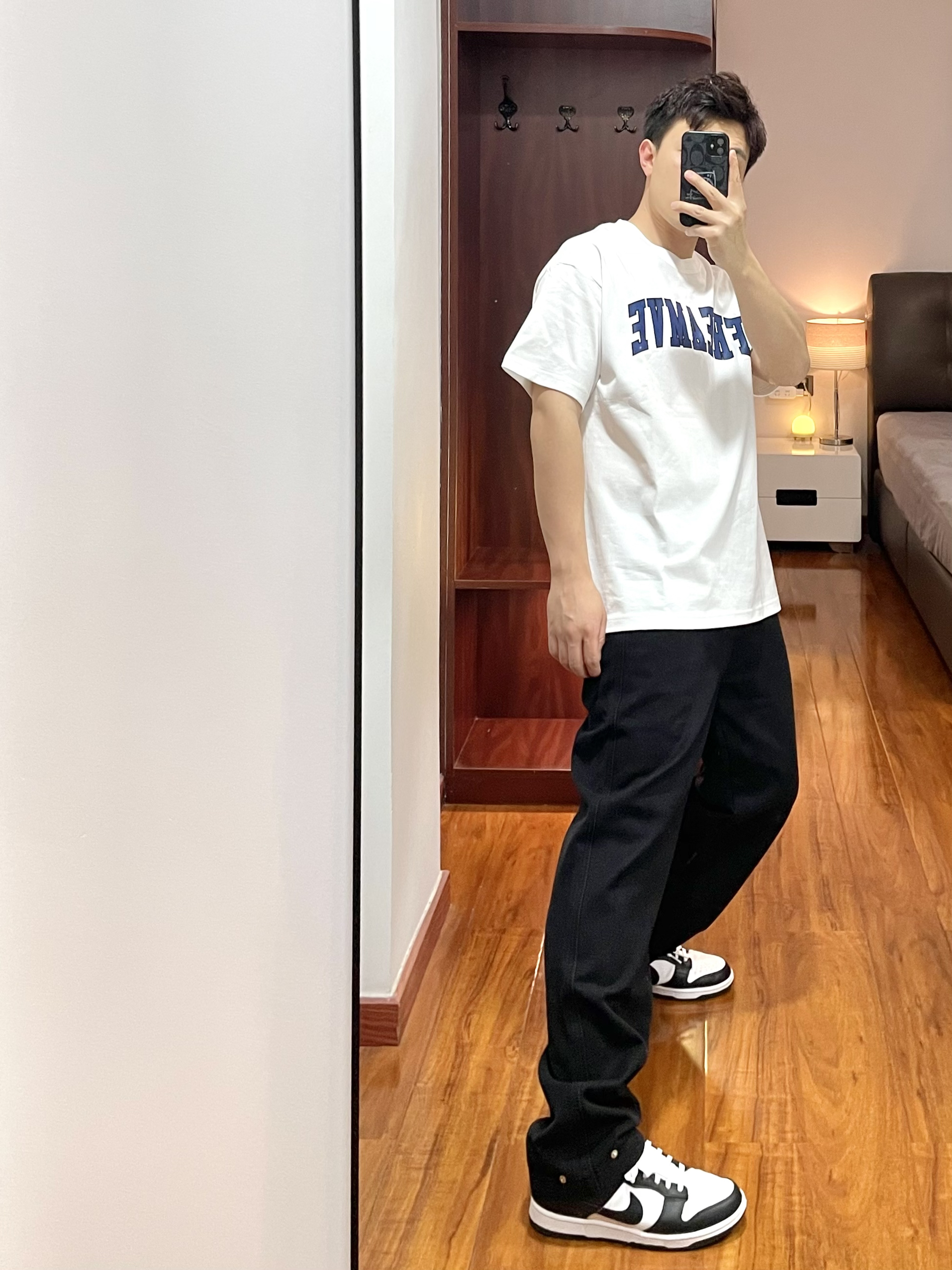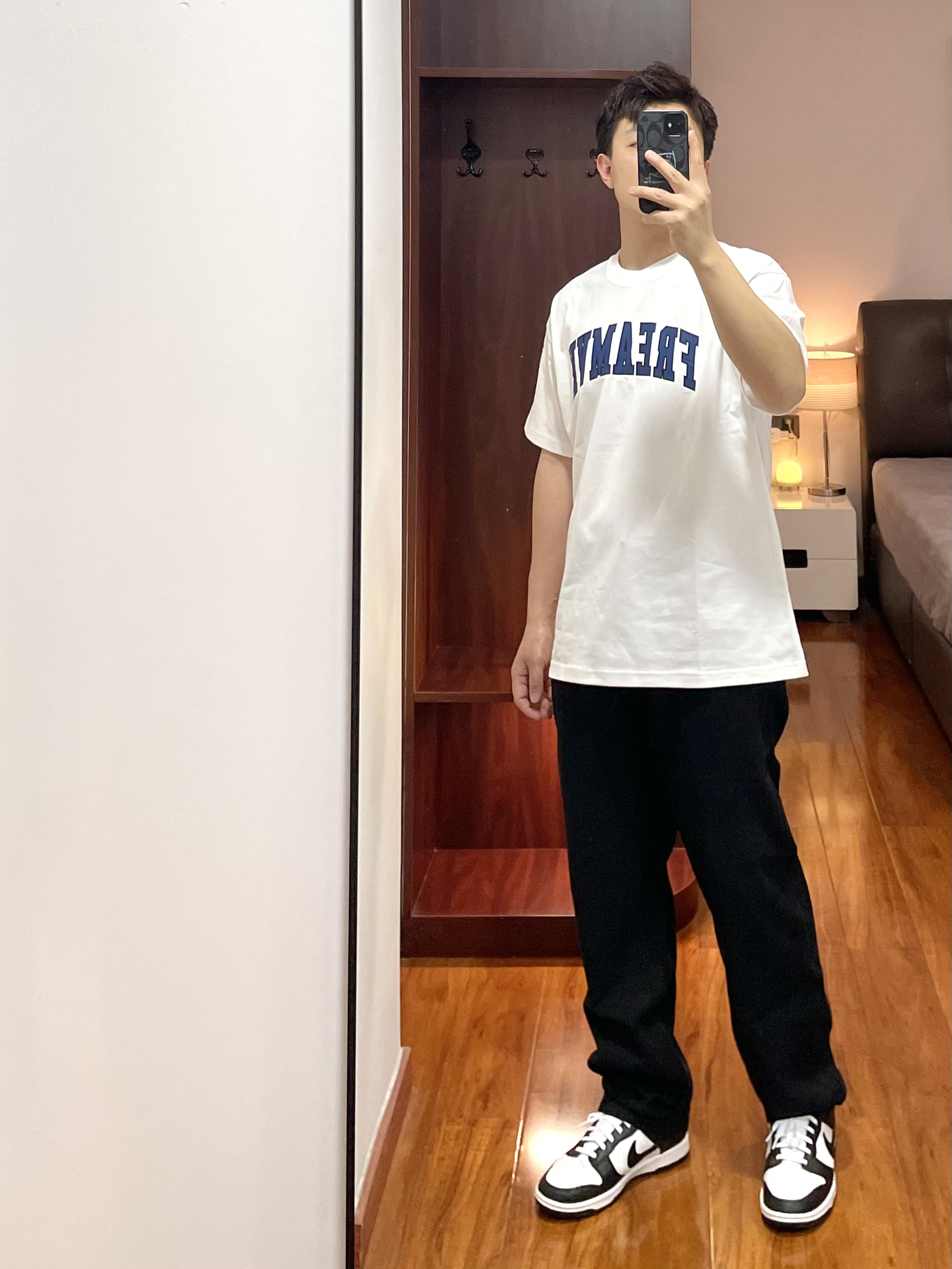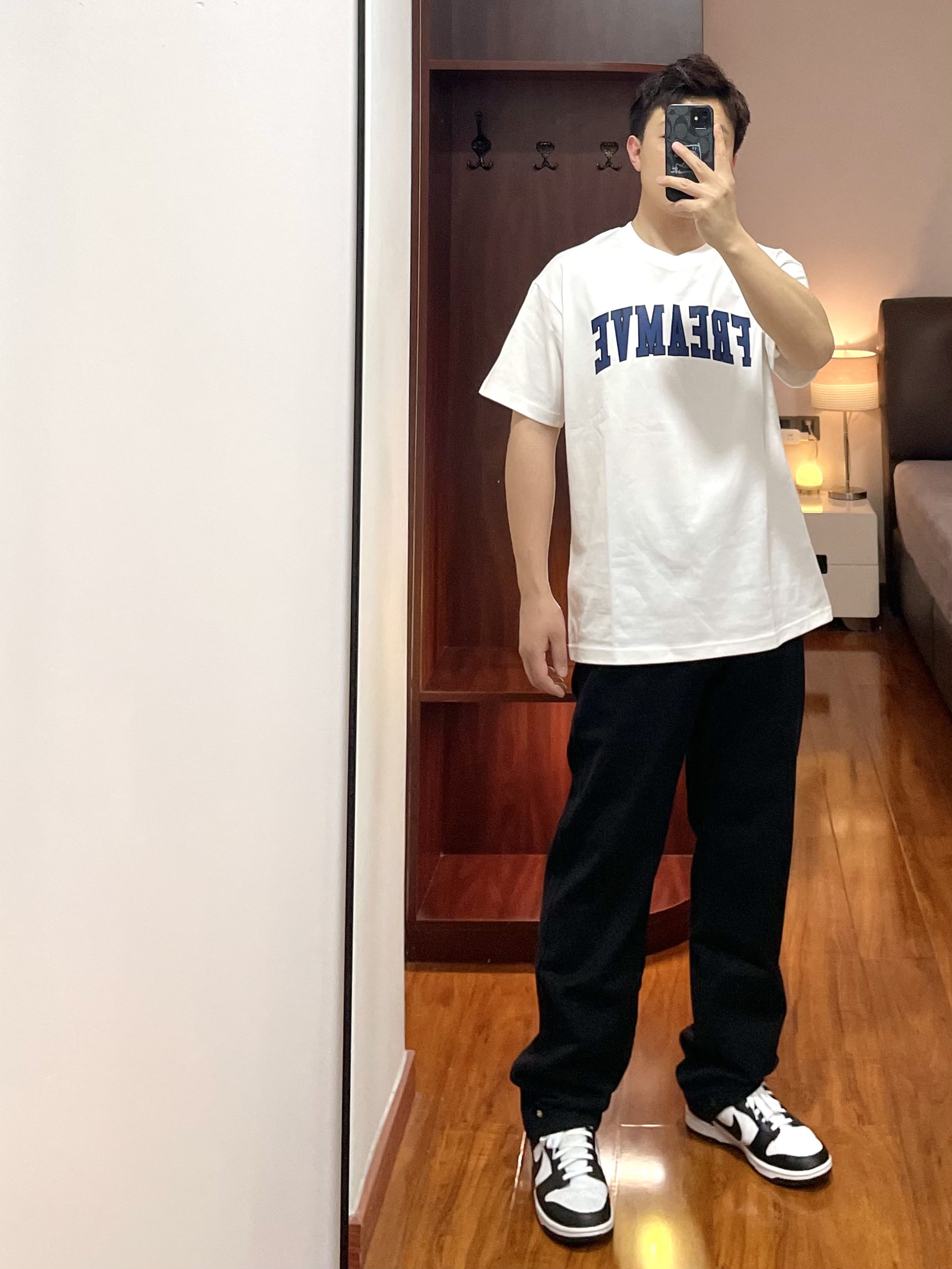 👕:freamve T恤-L 白色T恤重度爱好者,字母印花的T恤风格很美式,版型宽松蓝色字母还更显白。 👖:Wildstory 牛仔裤 黑色牛仔裤版型直筒宽身,面料厚实四季可穿,黑色裤子显瘦穿起来也显腿直。 👟:Nike dunk 上身白色,下身黑色跟这鞋子的配色好搭。